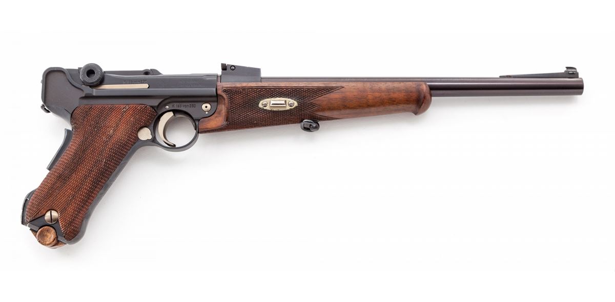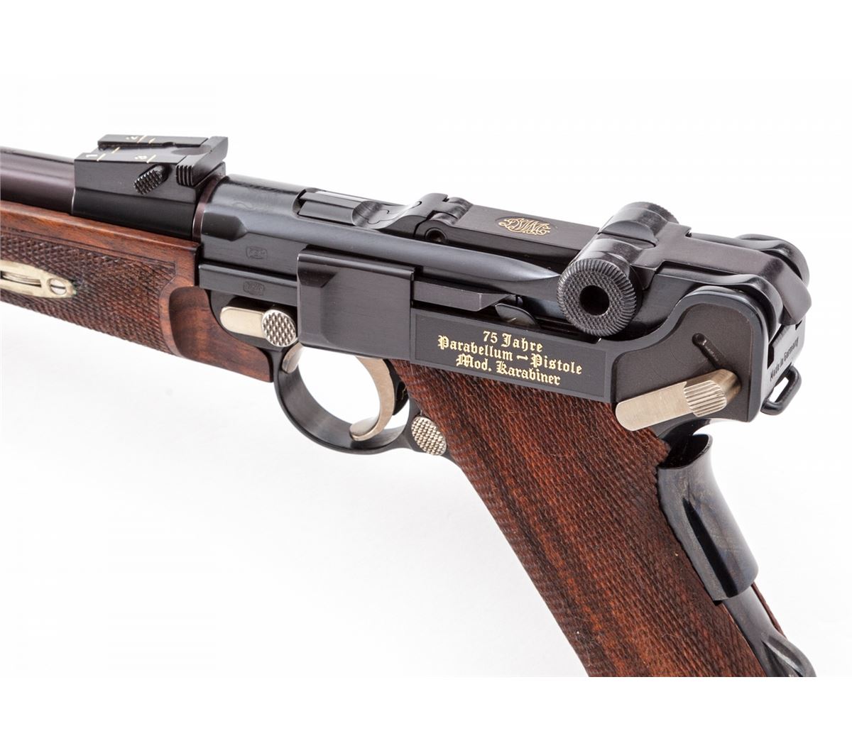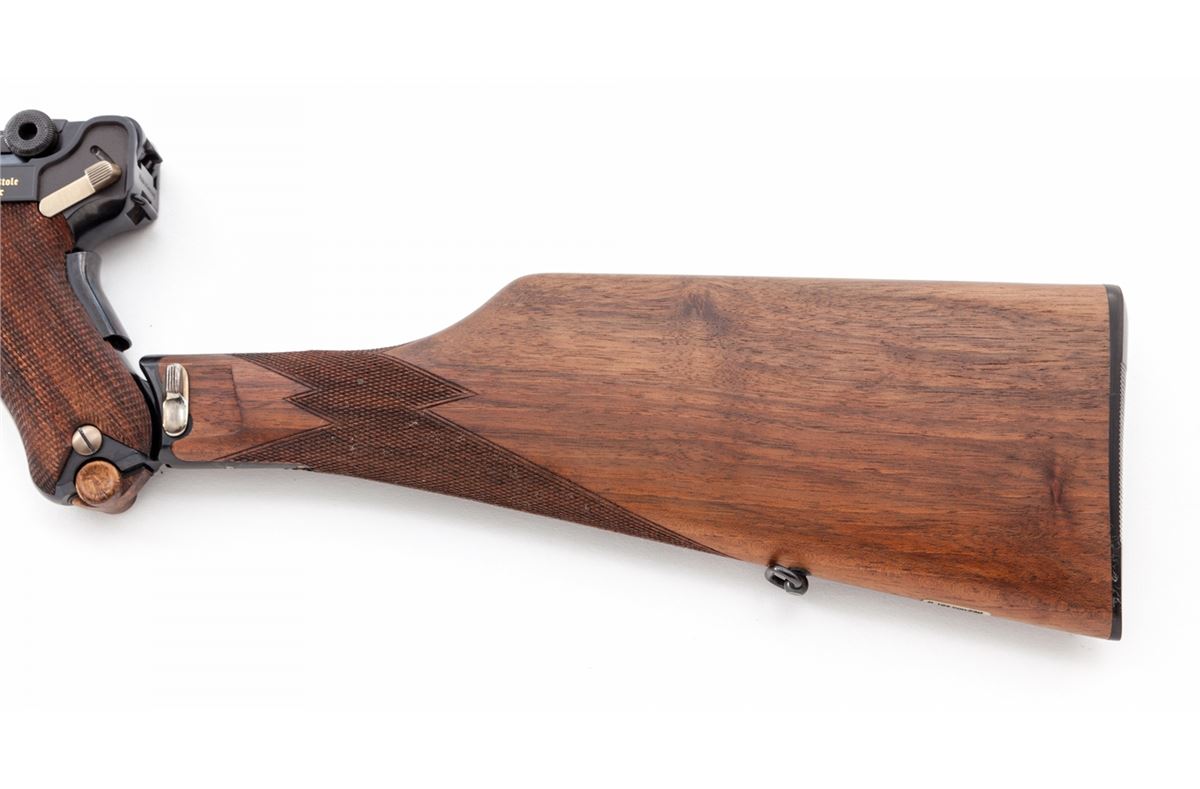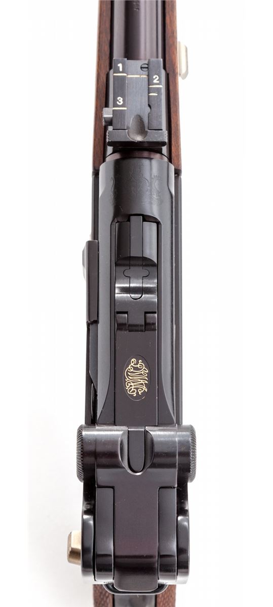 75th Year Commemorative Cased 1902 Luger Carbine, with stock, extra mag, cleaning rod, keys, hang tag, brush, instructions and test target, #K193 von 250 (193 out of 250 mfg'd), 9mm, 11-3/4'' barrel, blue finish and straw small parts, factory checkered walnut grips, forend and buttstock; and two factory blue-bodied wooden based magazines. Left frame flat marked in gold ''75 Jahre/Parabellum-Pistole/Mod. Karabiner'', top of chamber with Mauser family crest, DWM in gold to central toggle link, unmarked safety area, ''Geladen'' marked extractor, Interarms markings to right side of upper receiver. Condition is excellent, appearing as new and unfired, in original casing. Est.: $5,000-$7,500. (C&R/PPT) (John Siroonian estate)