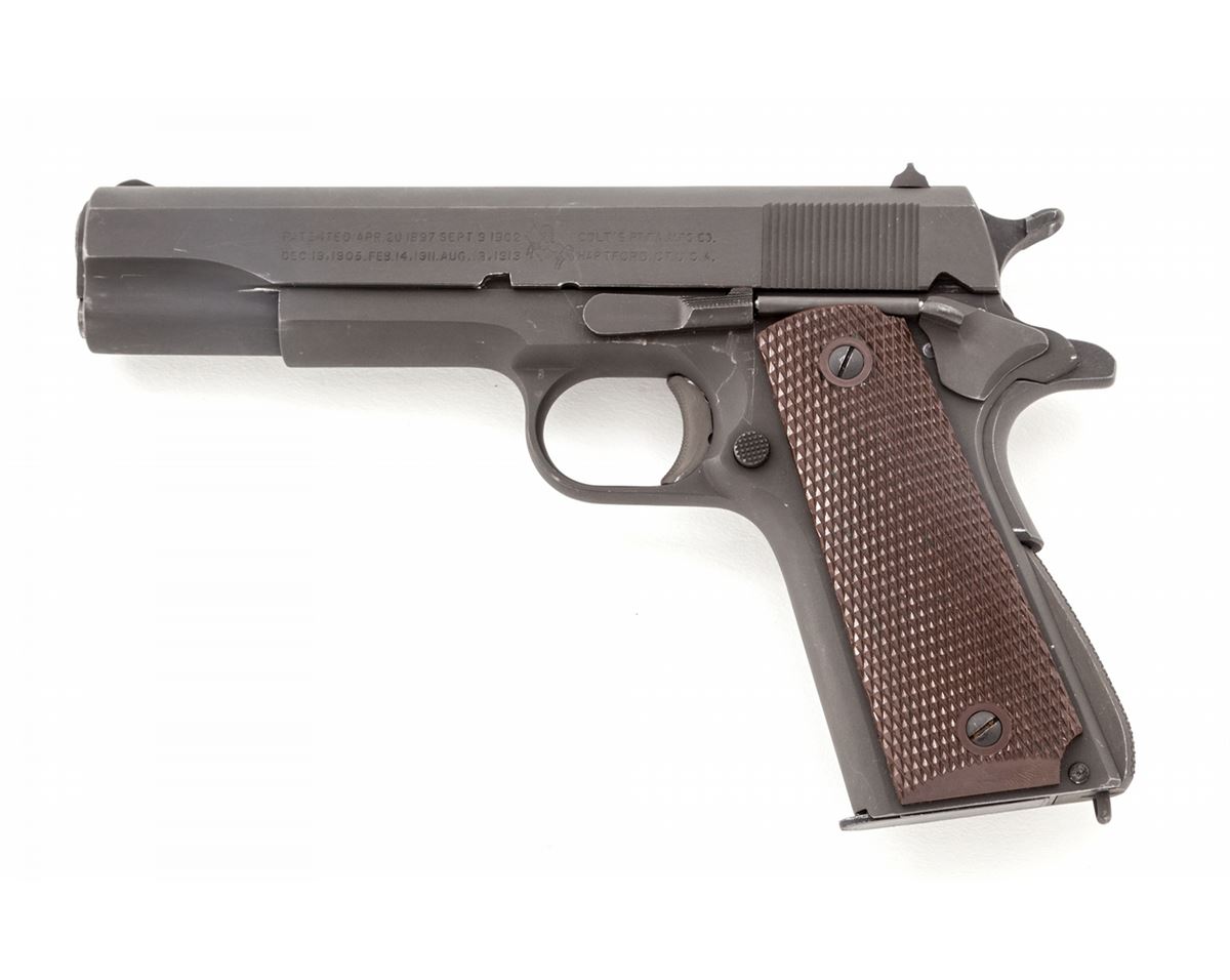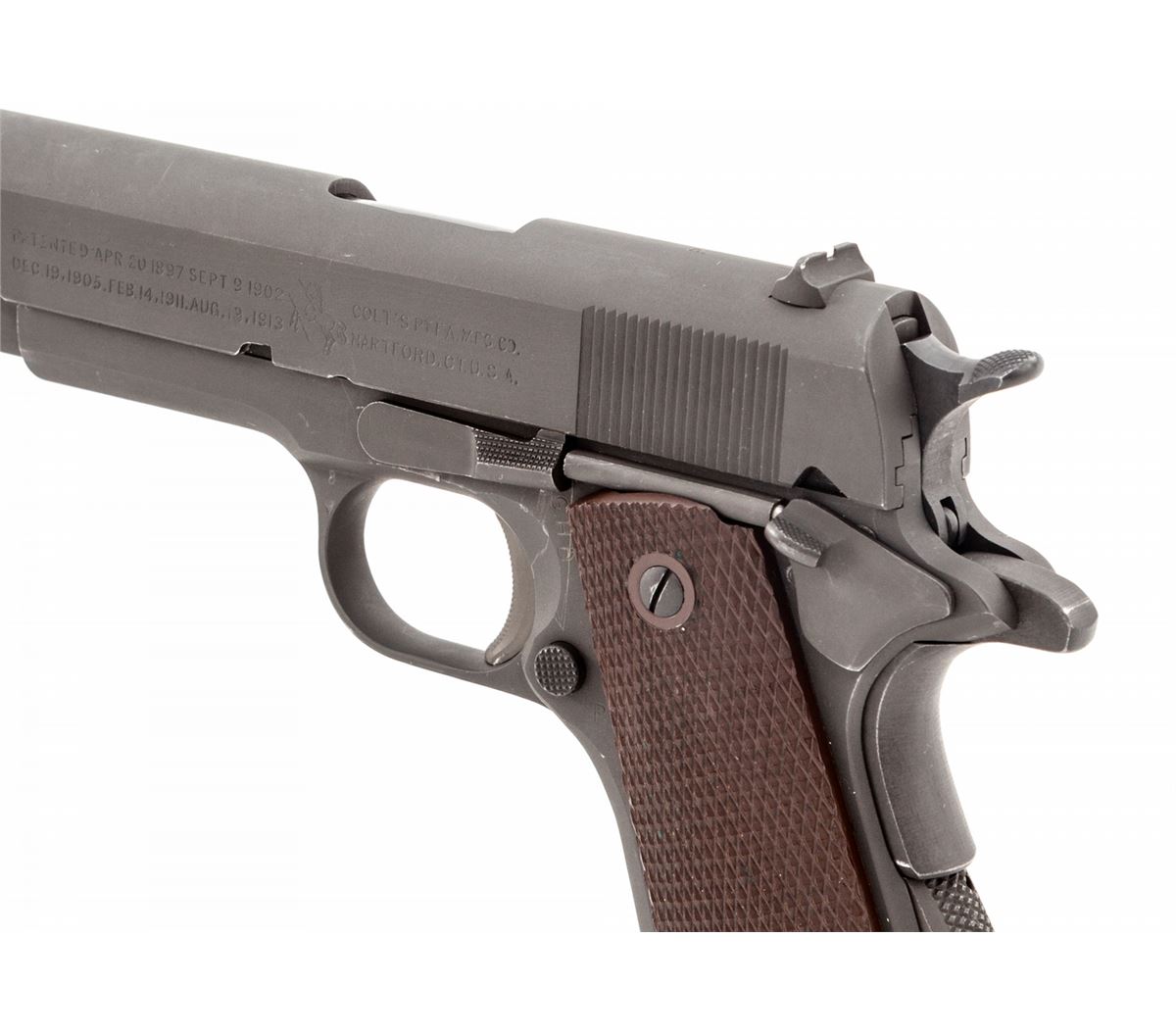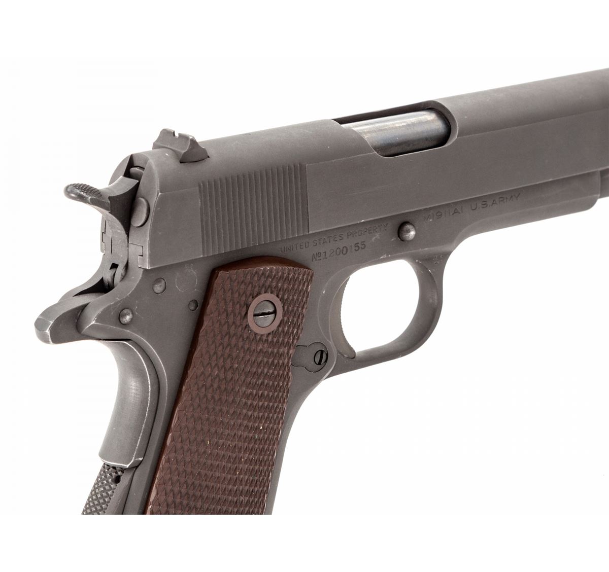 Colt Model 1911-A1 Semi-Automatic Pistol, #1200155, .45 ACP cal., 5'' blue finished Colt made barrel, parkerized finish, correct large ring brown plastic checkered grips, with one blue-bodied contract made Risdon magazine. ''GHD'' inspected, with Ordnance wheel to right side as correctly stamped through the finish. Shipped April 18, 1944, to the Springfield Armory. (See Clauson, ''Colt 45 Service Pistols'', page 400.) Condition is excellent retaining approx. 98% original finish. Grips and action are crisp, with light scuffs and minor scratches beneath slide stop and very light high edgewear in actioning areas. Blued portion of barrel with light thinning through ejection port. Grips and action are crisp, bore is bright. Est.: $2,000-$3,000. (C&R/PPT)