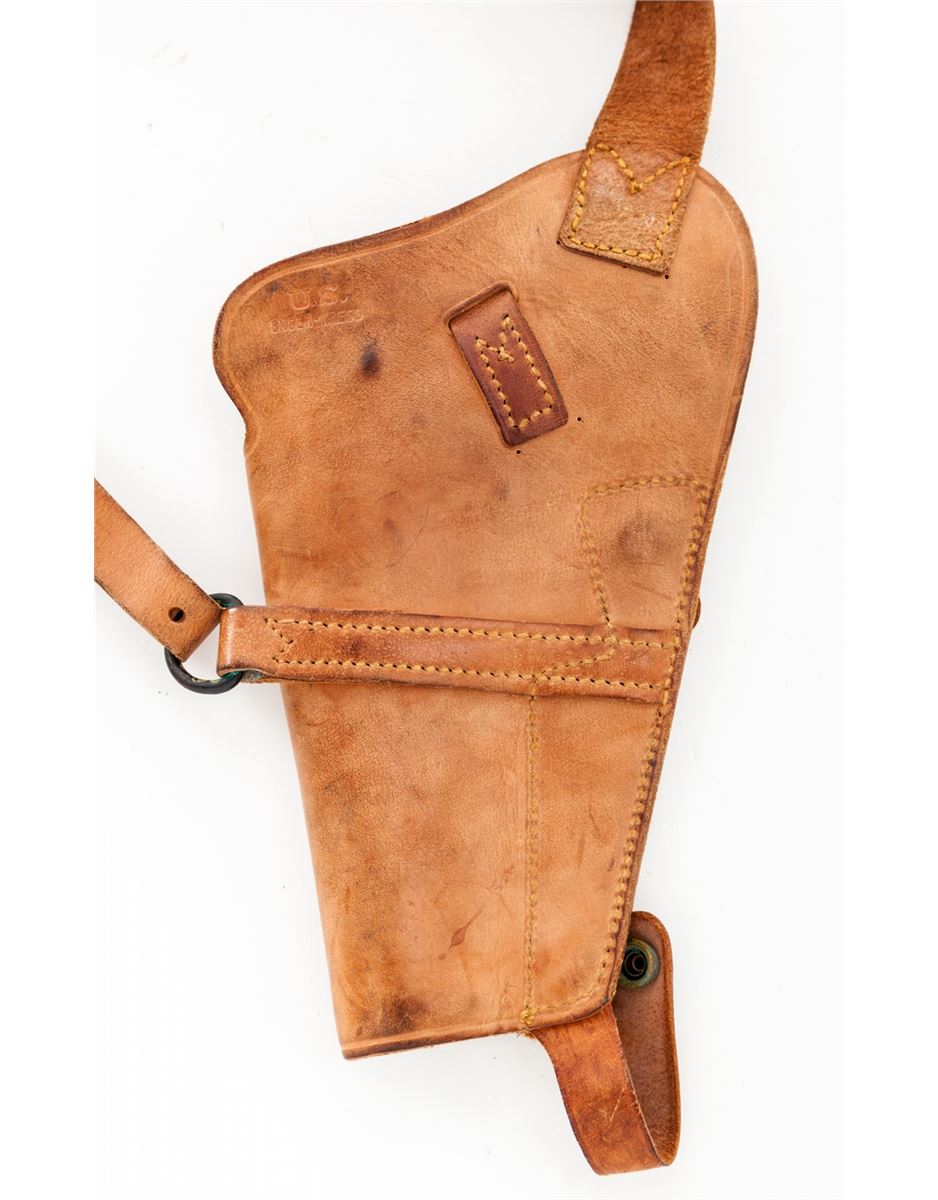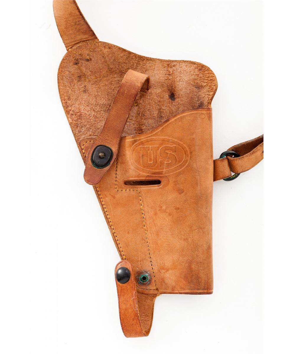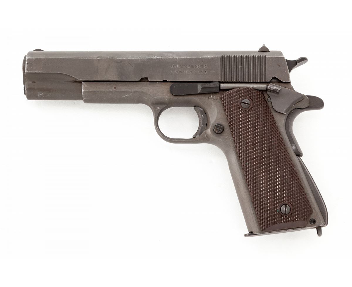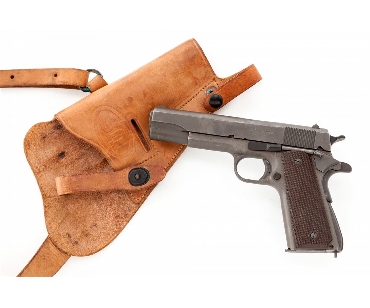 U.S. Model 1911-A1 Semi-Automatic Pistol, by Remington-Rand, #2433346, .45 ACP cal., 5'' barrel, parkerized finish, Keyes fiber brown checkered plastic grips with small reinforcing rings, with two contract magazines and original paperwork named to our consignor from the Benecia Arsenal, Benecia, CA. Paperwork is dated Dec. 7, 1960. U.S. M3 style shoulder holster is included. Condition is excellent showing just light highpoint edgewear with ''OG'' markings just forward of right grip panel, indicating an Ogden Arsenal rework. Grips and action are crisp, bore is excellent. Barrel retains approx. 80% finish as visible through ejection port. Holster shows light soiling and lower strap male snap has pulled away from rivet but is present. Est.: $1,500-$2,000. (C&R)