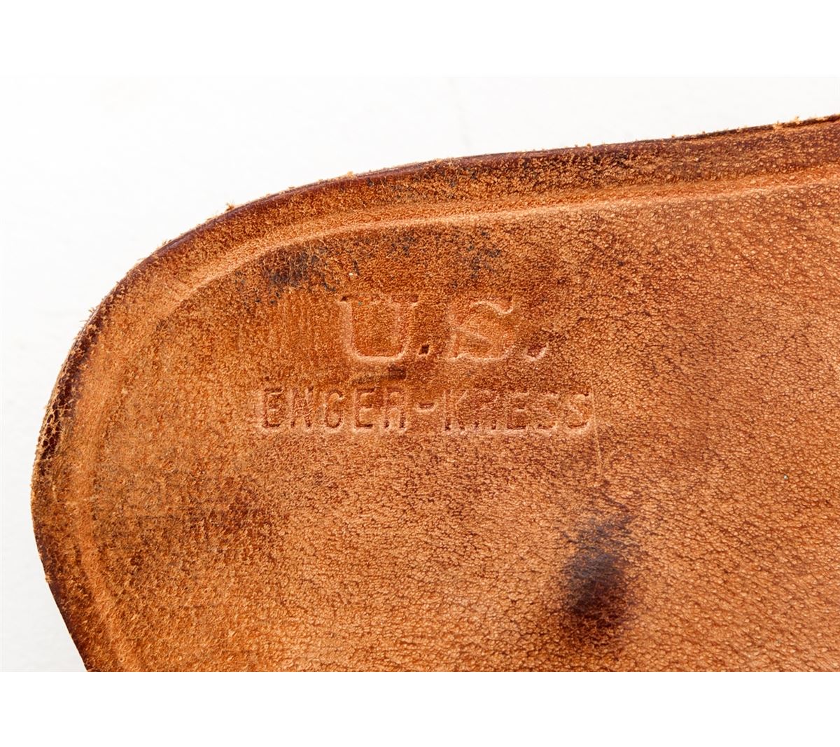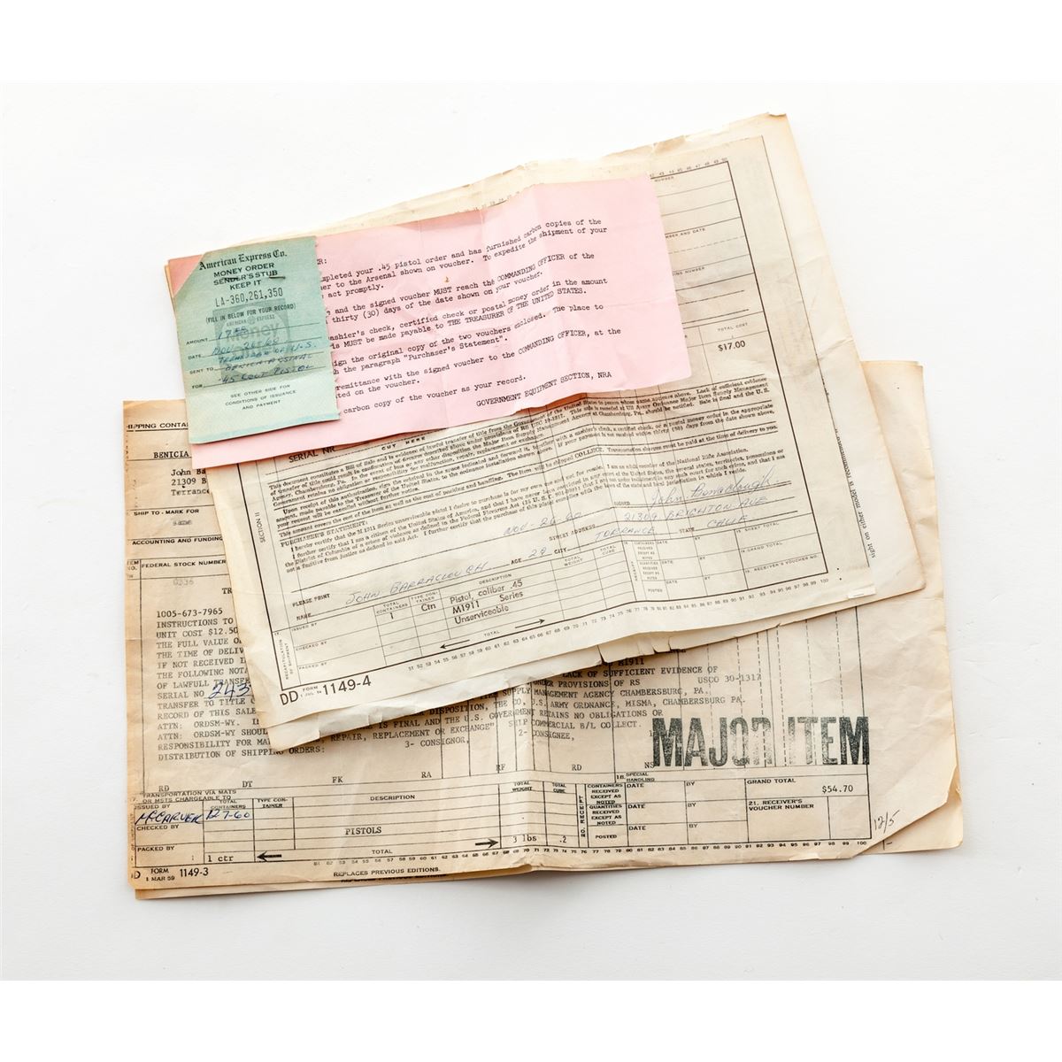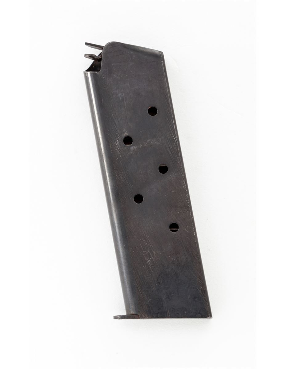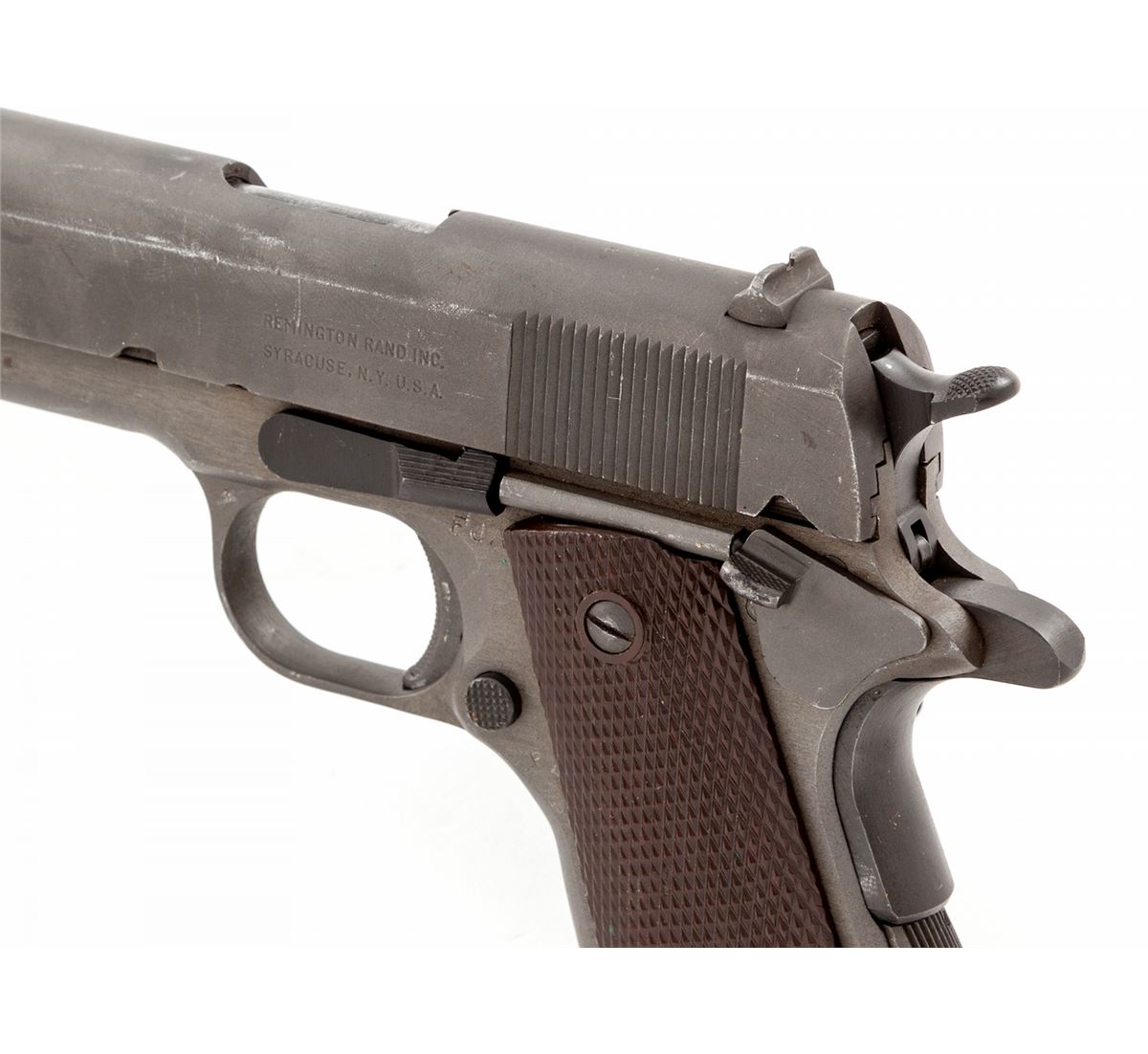 U.S. Model 1911-A1 Semi-Automatic Pistol, by Remington-Rand, #2433346, .45 ACP cal., 5'' barrel, parkerized finish, Keyes fiber brown checkered plastic grips with small reinforcing rings, with two contract magazines and original paperwork named to our consignor from the Benecia Arsenal, Benecia, CA. Paperwork is dated Dec. 7, 1960. U.S. M3 style shoulder holster is included. Condition is excellent showing just light highpoint edgewear with ''OG'' markings just forward of right grip panel, indicating an Ogden Arsenal rework. Grips and action are crisp, bore is excellent. Barrel retains approx. 80% finish as visible through ejection port. Holster shows light soiling and lower strap male snap has pulled away from rivet but is present. Est.: $1,500-$2,000. (C&R)