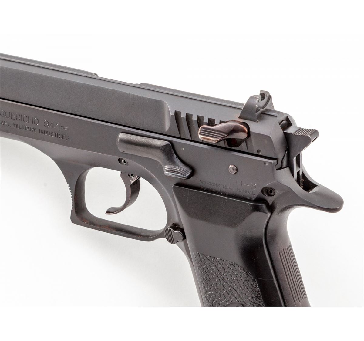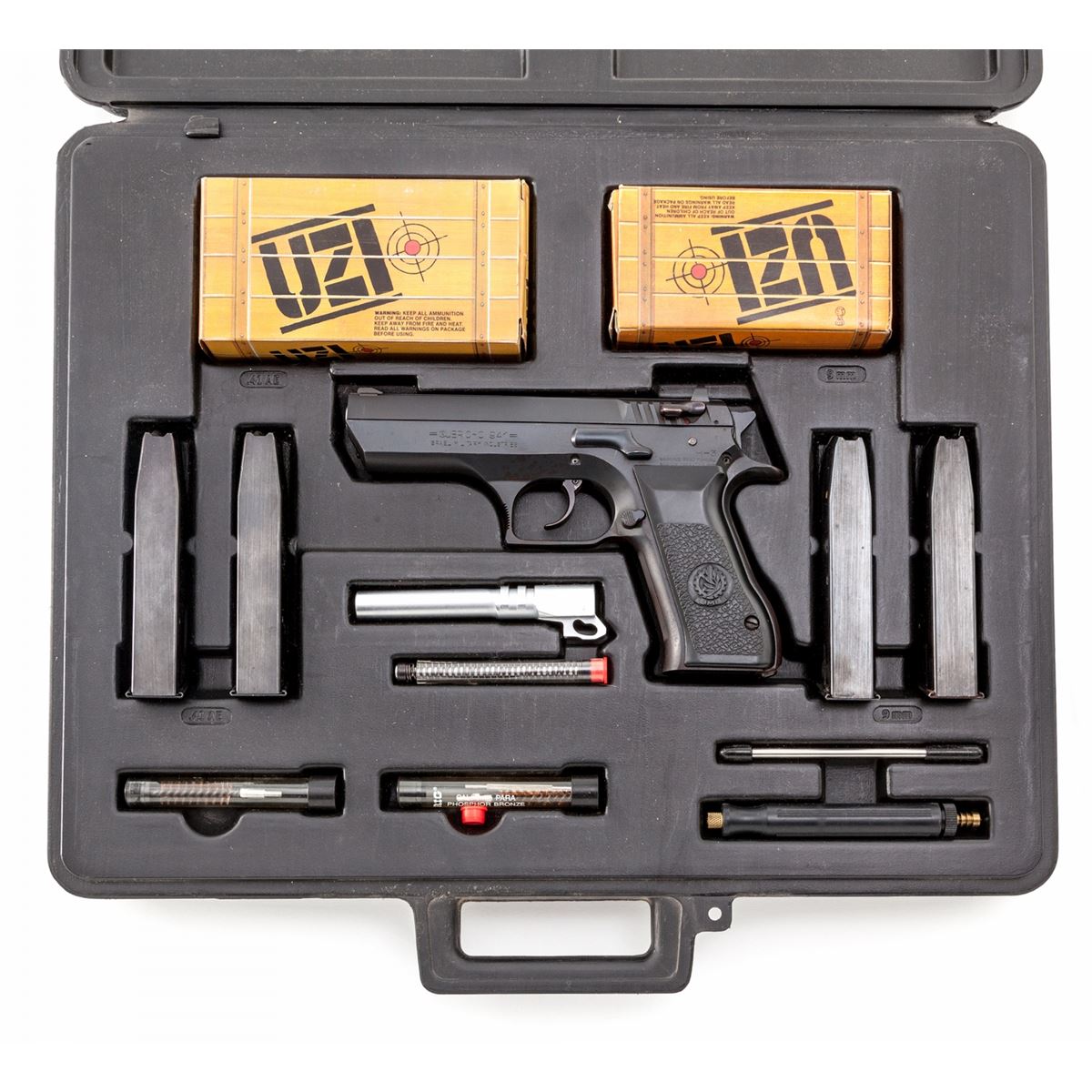Israeli Jericho Model 941 Multi-Caliber Semi-Automatic Pistol Kit, #005715, 9mm/.41AE cal., 4-1/2'' barrel, matte finish, with two magazines for each, associated cleaning equipment, ammo (partial boxes of 9mm & .41AE) and instructions, all in high-impact molded case. Condition is very good showing light toning from storage. Good grips, action and bore. Est.: $750-$1,000. (Modern/PPT) (High-cap mags not available to Calif. residents.)