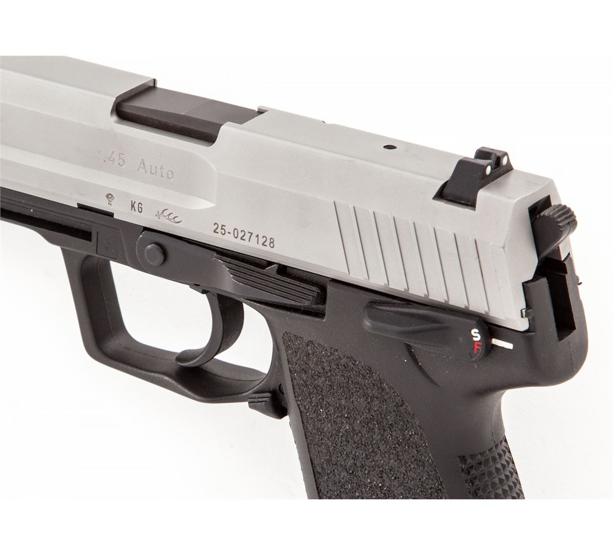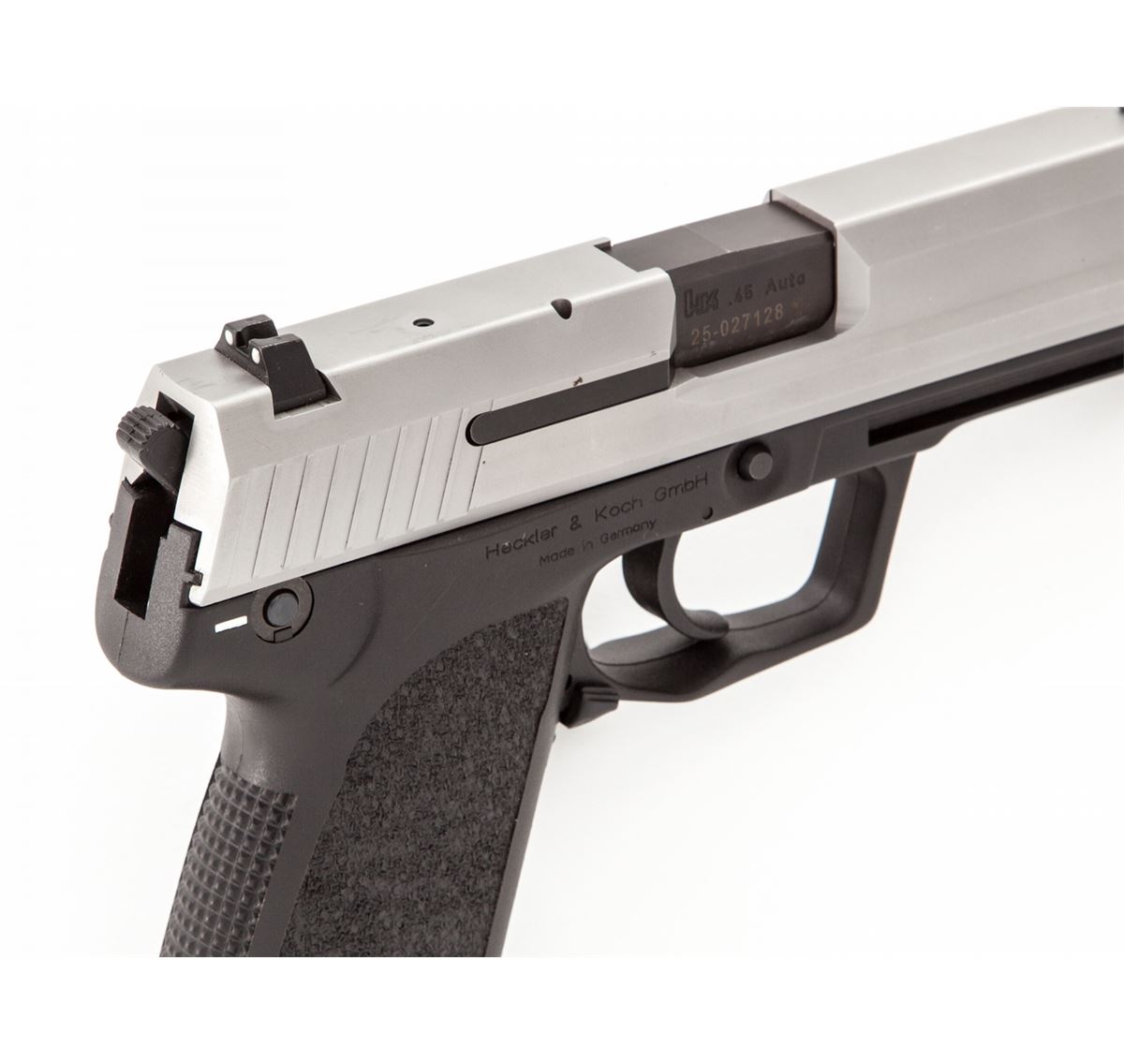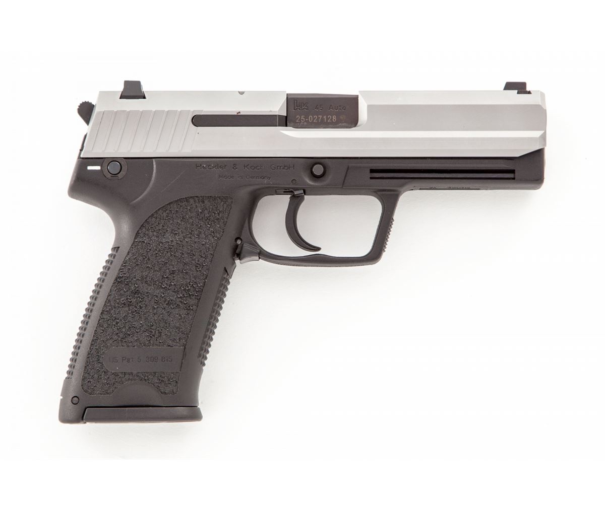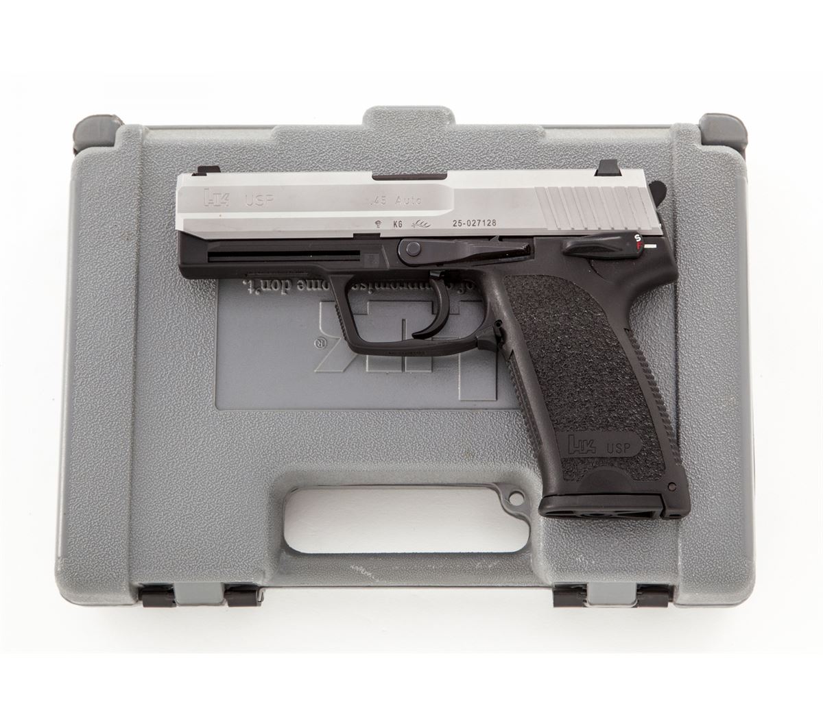 HK USP Semi-Automatic Pistol, #25-027128, .45 ACP cal., 4-1/4'' barrel, matte stainless finish, polymer frame, with two (2) factory 10-round magazines. Condition is excellent appearing near new in original box. Est.: $600-$800. (Modern/PPT)