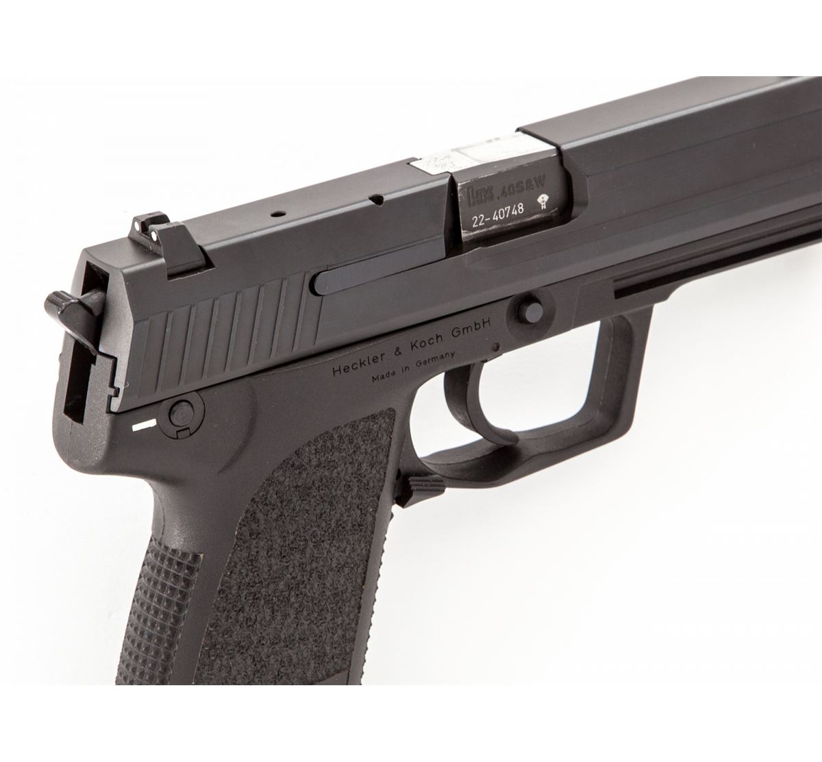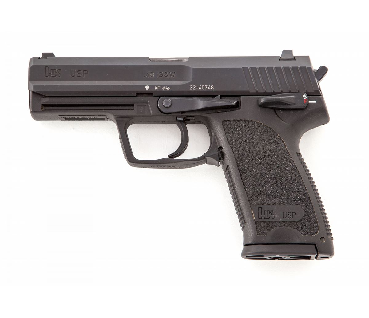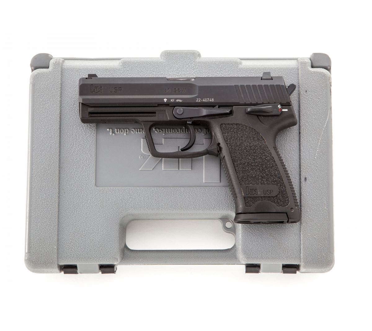 HK USP Semi-Automatic Pistol, #22-40748, .40 S&W cal., 4'' barrel, matte finish, polymer frame, with one factory 10-round magazine. Condition is excellent appearing near new in original box with instructions. Est.: $600-$800. (Modern/PPT)