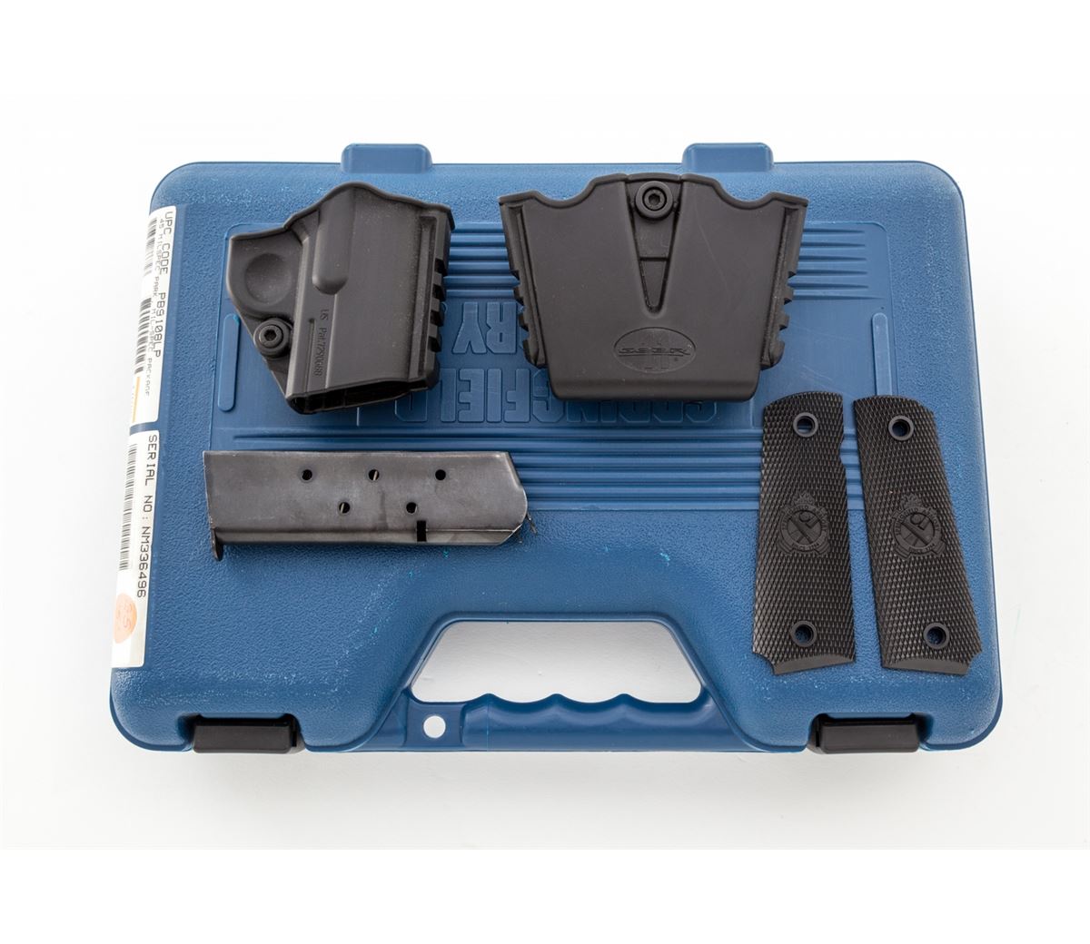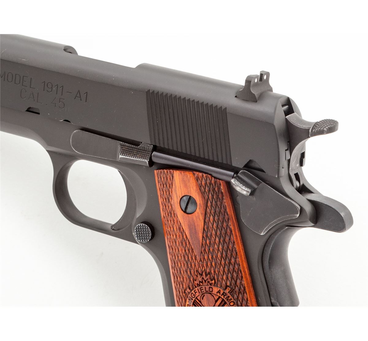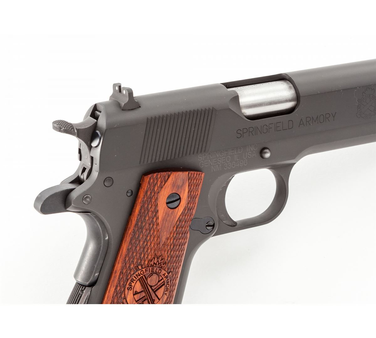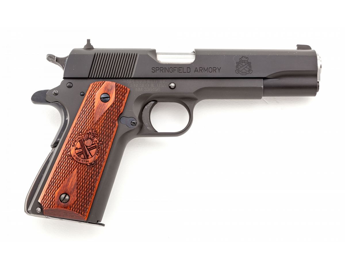 Springfield Armory Mil-Spec 1911-A1 Semi-Automatic Pistol, #NM336496, .45 ACP cal., 5'' barrel, parkerized finish, large diamond walnut checkered grips with Springfield logo, as well as similar black plastic grips, with two (2) magazines, plastic holster and mag pouch, all in original box with instructions. Factory high three-dot sights. Condition is excellent showing little use with very light edgewear. Grips and action are crisp, bore is bright. Est.: $600-$800. (Modern/PPT)