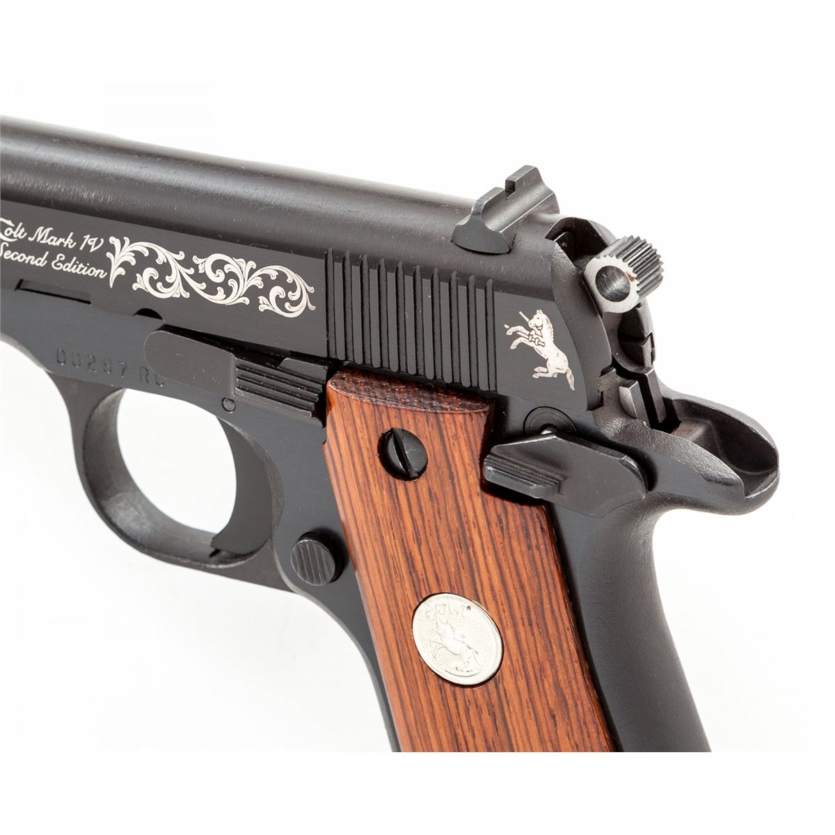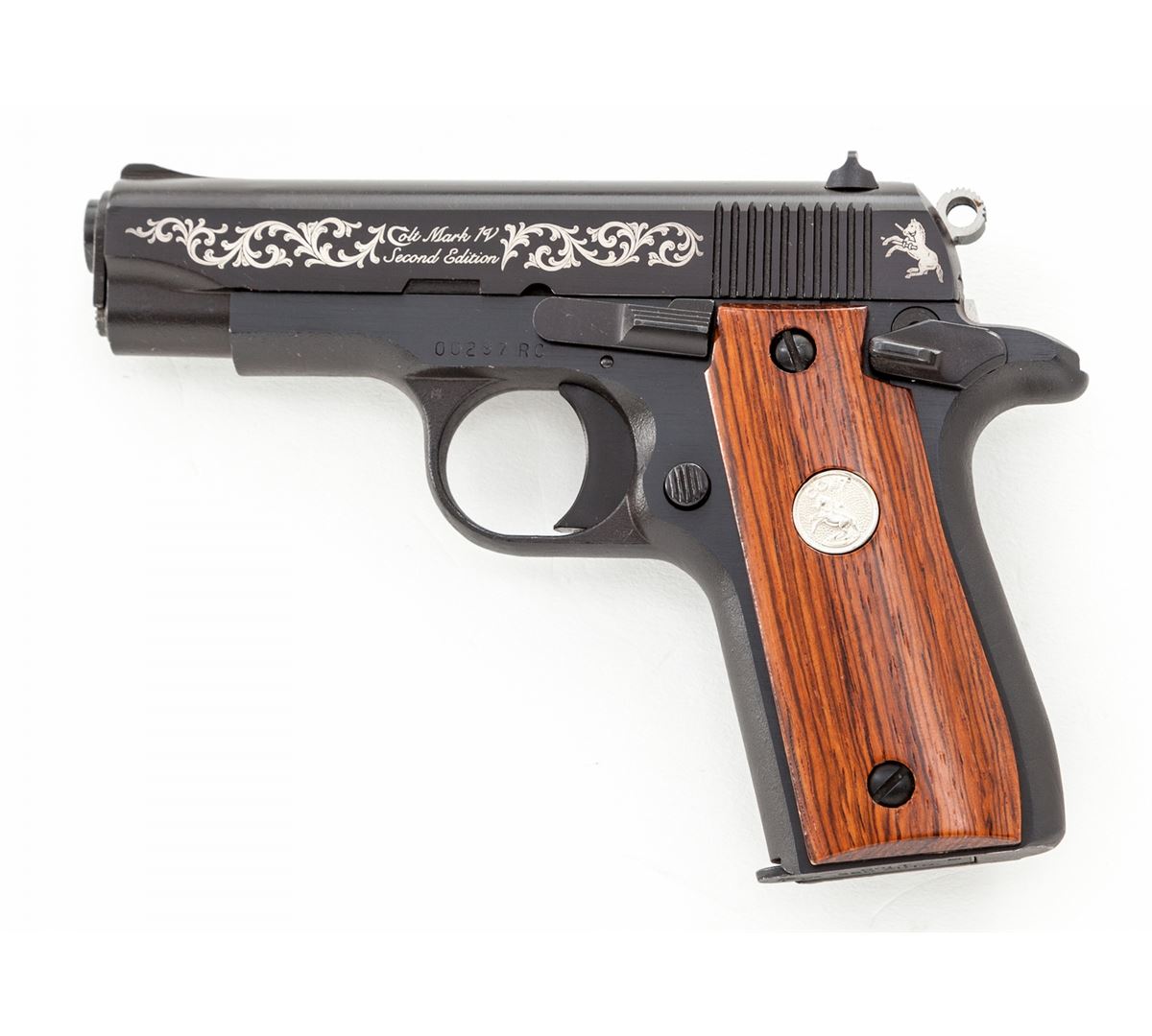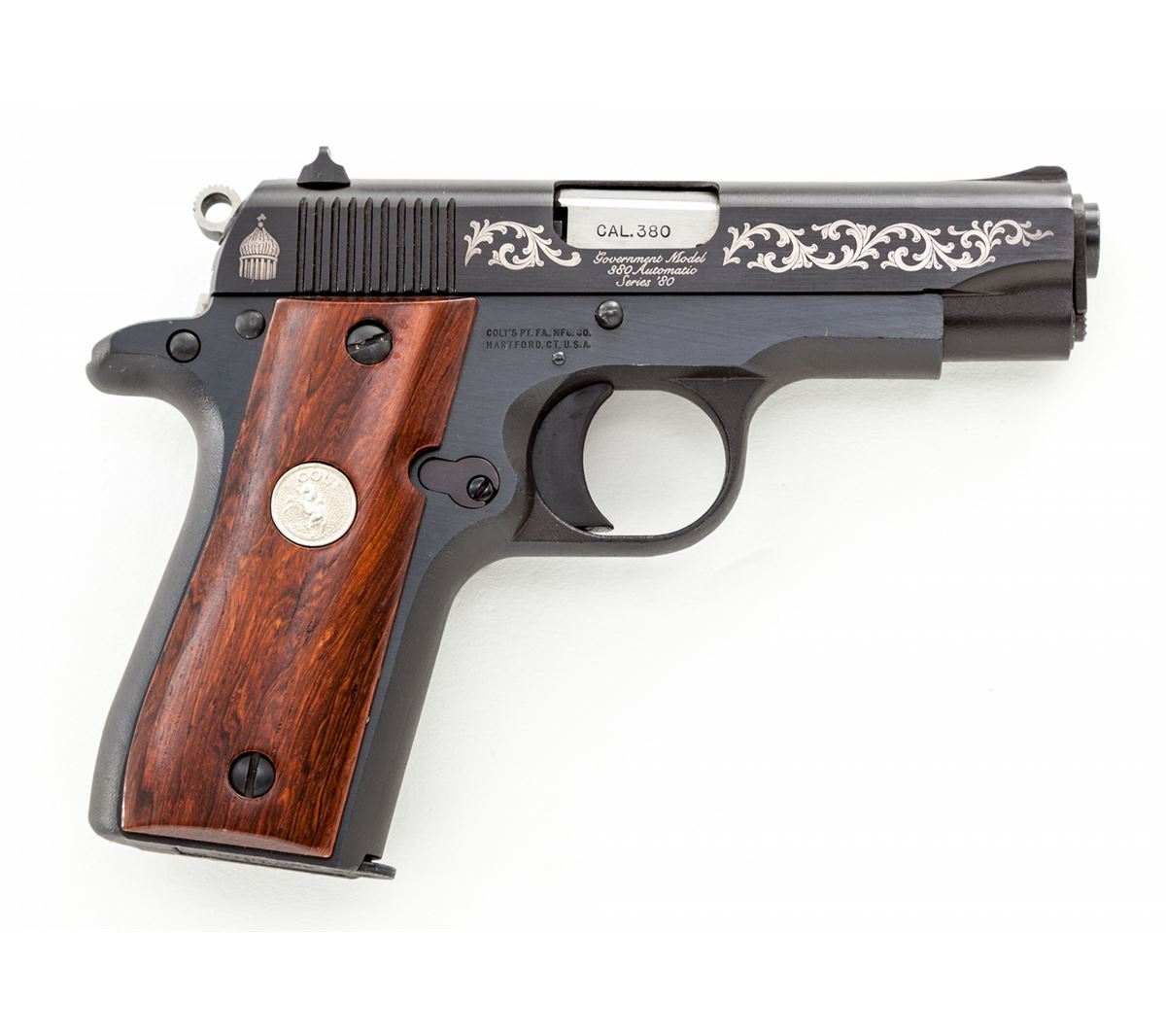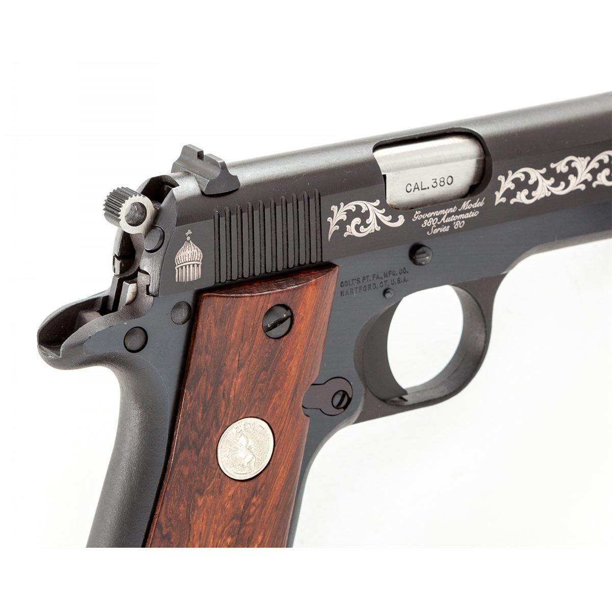 Colt MK IV Series 80 2nd Edition Government Model, #00297RC, .380 cal., 3-1/4'' barrel, blue finish, smooth factory rosewood grips with Colt medallions, and applied silver scroll design with Rampant Colt and Colt Dome to slide area. Condition is excellent retaining its hanging tag, instructions and associated paperwork, in original box, which shows some tape repair. Est.: $800-$1,200. (Modern/PPT)