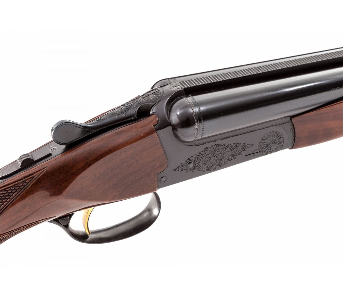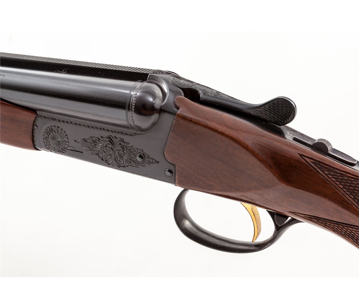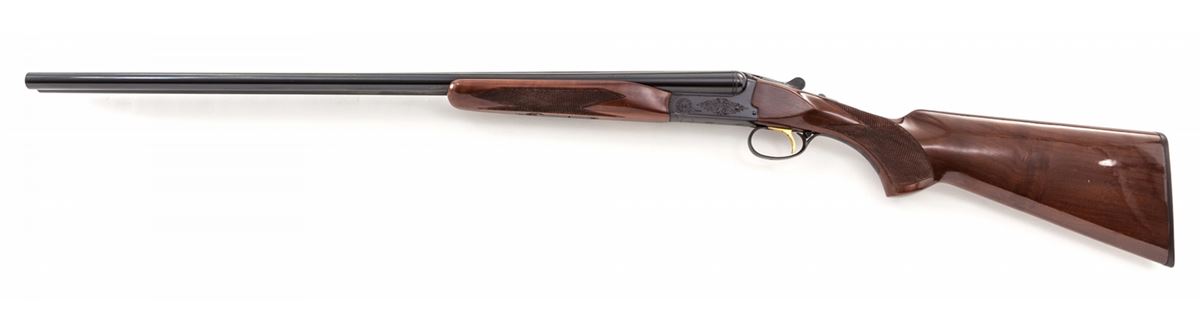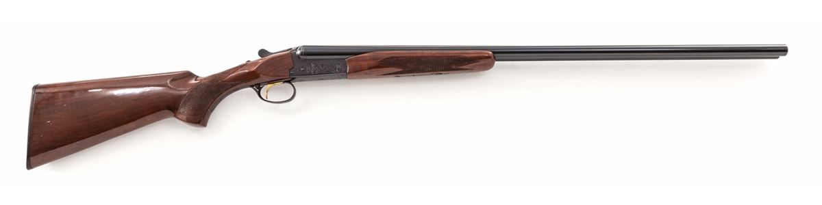 Browning B-S/S Side-by-Side Boxlock Shotgun, #03936PZ168, 20 ga., 3'' chs., blue finish, 28'' barrels with silver front bead, Full/Mod. chokes, automatic sliding top tang safety, single gold-plated trigger with triggerguard barrel selector, light scroll engraving on the frame; checkered gloss finish walnut pistol grip stock and beavertail forend with a 14-1/4'' length of pull over a plastic Browning buttplate. Mfg'd 1981. Mechanically sound, showing light use with beginning plum toning to blued metal surfaces along with a few handling marks. Est.: $900-$1,200. (Modern)
