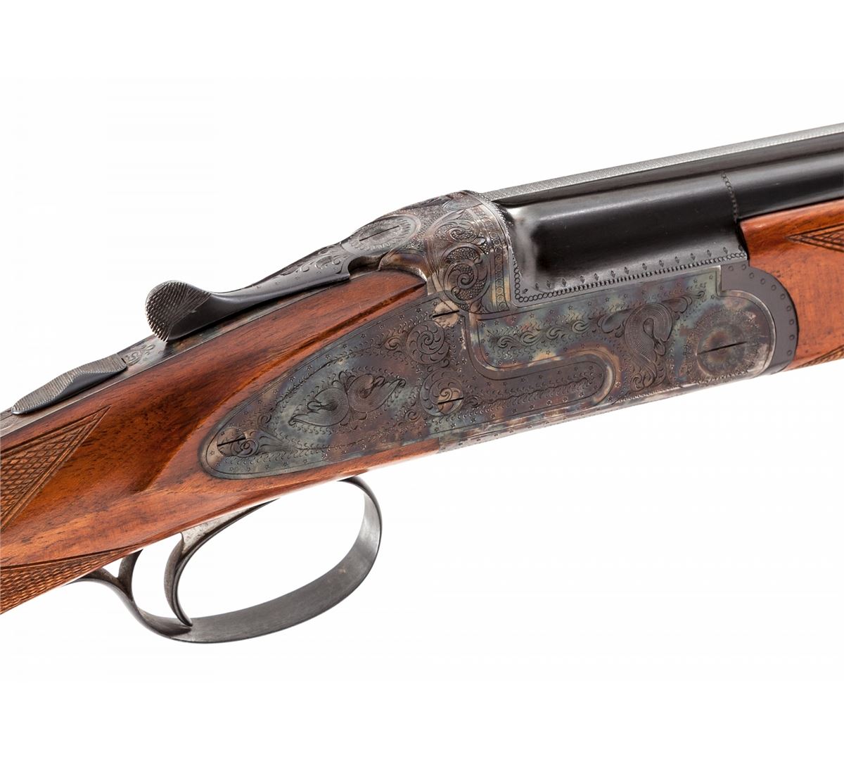 Abercrombie & Fitch Over/Under Sidelock Shotgun, by Zoli, Italy, #4994, 28'' ga. choked Mod./Imp., 2-3/4'' chambers, 26'' vent rib blue barrels, Italian engraved with near full coverage to case hardened sidelock frame, extractors, auto safety, checkered walnut stock with Prince of Wales pistol grip and factory checkered black plastic buttplate. Condition is excellent retaining approx. 98% original blue with one small area of discoloration to right side just forward of forend. Stock with light scratches and impressions. Action is good, bores are bright. Length of pull 14-3/8''. Est.: $2,000-$3,000. (C&R)