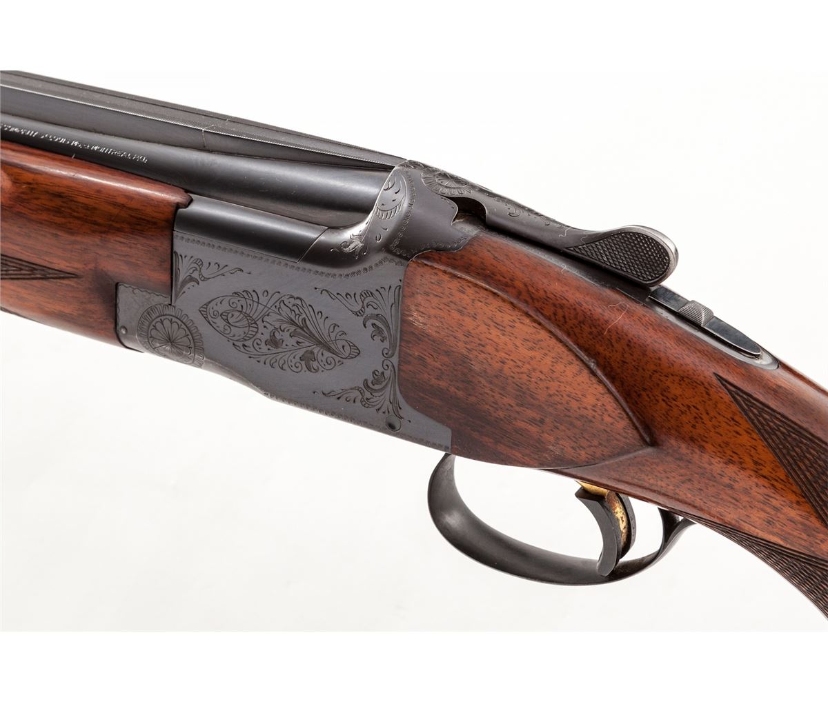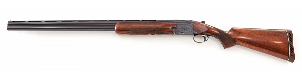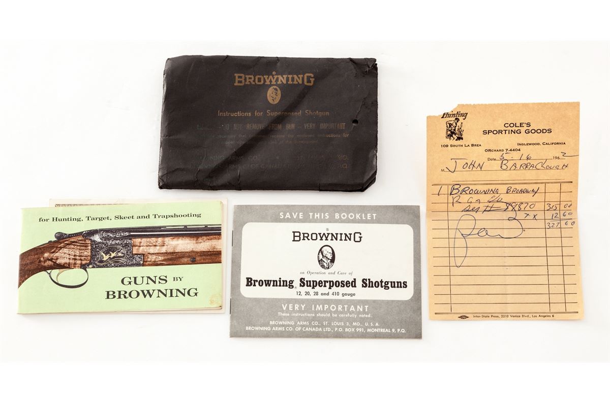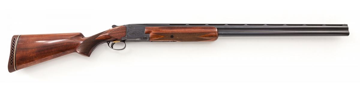 Browning Grade 1 Superposed Over/Under Shotgun, #89876, 12 ga., 32'' barrel with Broadway vent rib, choked Full/Imp. Mod., 2-3/4'' chambers, blue finish, factory checkered walnut stock with original Browning Trap forend, long tang, square knob, with original Browning brown rubber butt pad. Mfg'd 1961. Original instructions included as well. This shotgun was used by our consignor to tie for 1st Place and 2nd in shoot-off in the 1964 Los Angeles Olympic Trap Tryouts for Tokyo. Condition is excellent retaining approx. 97% lightly thinning blue to barrels; receiver shows thinning at balance point and to rear portion of triggerguard tang. Stock with light scuffs and scratches and thinning to varnish at cheek area of comb. Action is crisp, bores are bright. Length of pull: 14-1/2'' to end of pad; 1-3/8'' drop at comb, and 1-3/4'' drop at heel. Est.: $800-$1,200. (C&R)