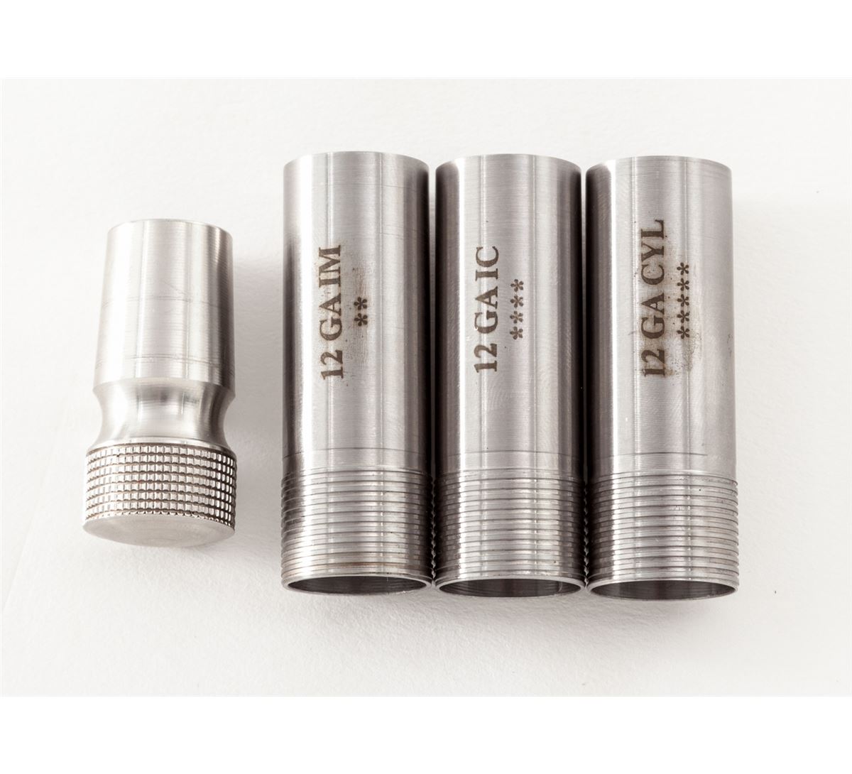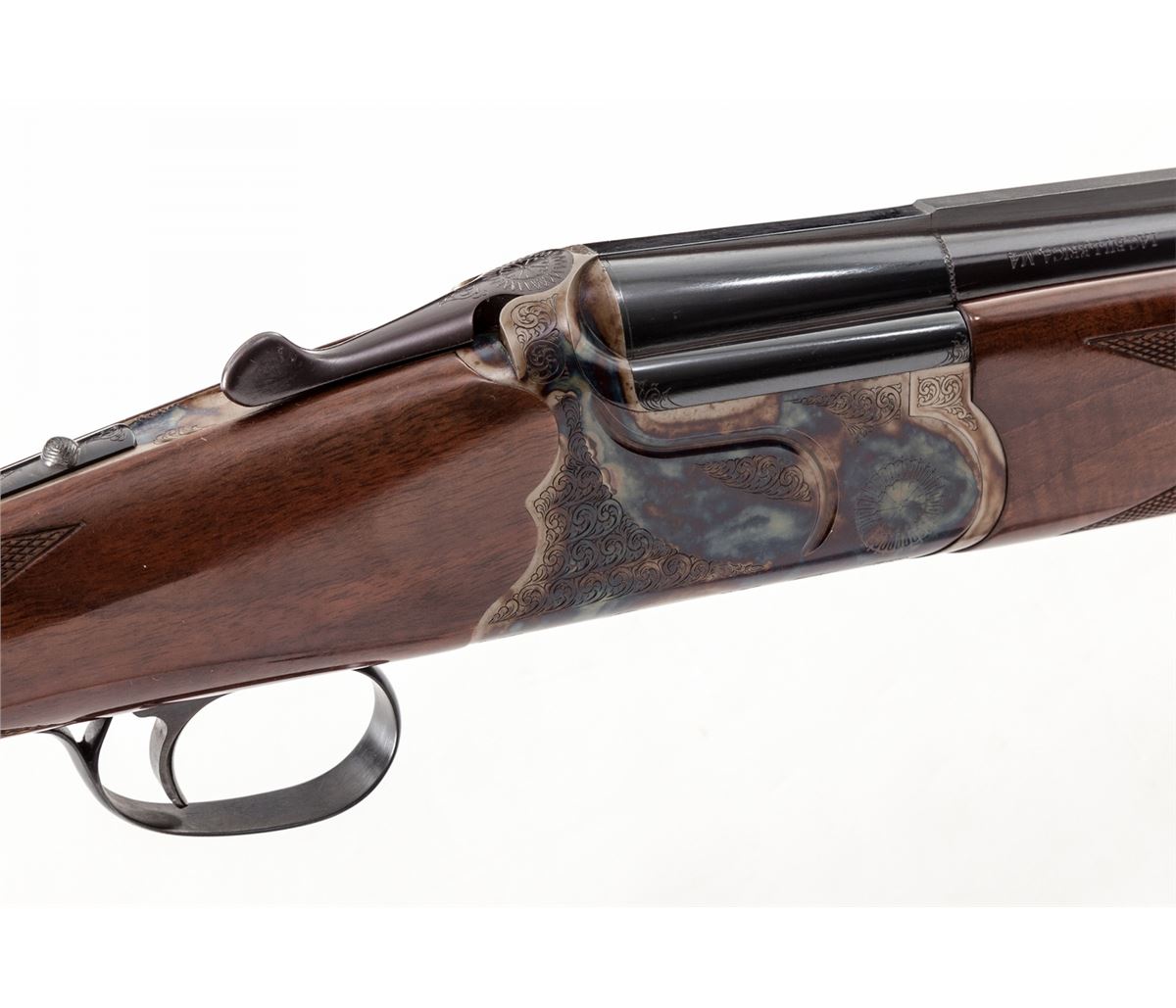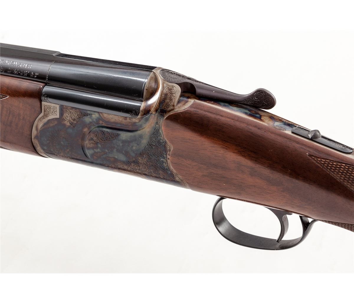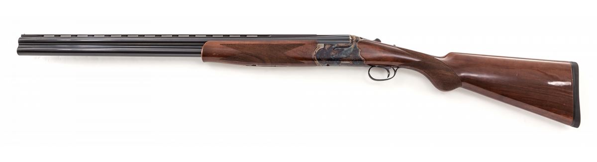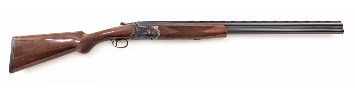 Dickinson Arms Over/Under Shotgun, #UCB0674, 12 ga., 28'' vent rib barrels for 2-3/4'' & 3'' shells, blue and case hardened finish, dark stained checkered walnut stock with Prince of Wales grip. In original box with chokes tubes. Condition is excellent, appearing as new, showing only light marks from handling. Box shows light tape marks and minor thinning at corners. Retails @ approx. $1,000. Est.: $600-$800. (Modern)