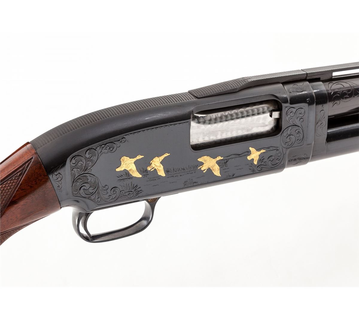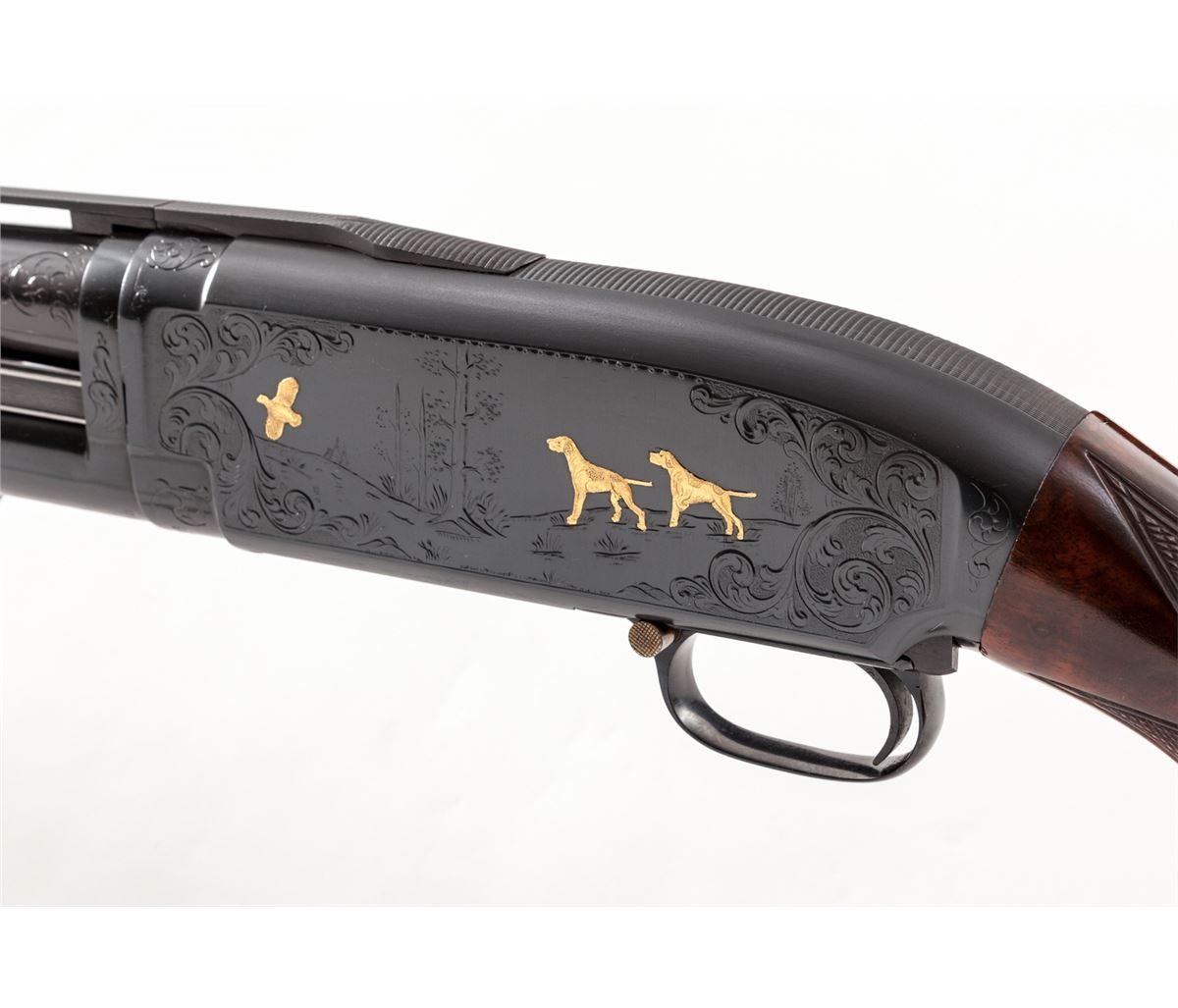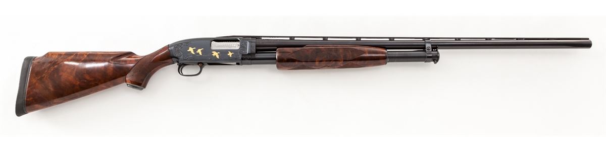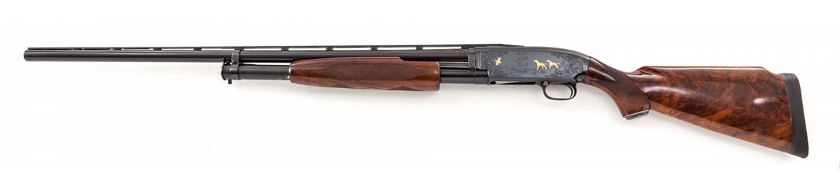 Custom Engraved and Gold Inlaid Winchester Model 12 Slide Action Trap Shotgun, #1435138, 12 ga., 2-3/4'' chamber, bright blue finish, 30'' barrel with factory matted ventilated rib, middle white bead, missing front bead, Full choke, gold-plated manual button safety in triggerguard, bright engine-turned bolt, carrier and extractor/ This circa 1954 gun is engraved in a style similar to the original Winchester No. 12-5 factory pattern having the receiver assembly and barrel chamber area engraved with broad foliate scroll and punch dot backgrounds bordering four gold inlaid mallards in flight over wetlands on the right side of the frame, with a gold inlaid grouse and two gold inlaid English Pointers on the left side; lower receiver extension has a lightly engraved pigeon; engraver's initials ''L.C.'' are just forward of the loading port. The Monte Carlo pistol-grip stock and handle are semi-gloss finish, dark burl figure AAA claro walnut with 18-line-per-inch checkering and plain steel grip cap. Length of pull is 14'' over a 3/4'' solid black Pachmayr recoil pad; drop at comb: 1-1/2''; drop at M.C.: 1-1/2''; drop at heel: 1-7/8''; weight is 8-1/4 lbs. Condition remains very fine as enhanced and refinished showing moderate use with tight action and bright bore, 98% reblue with scattered hairline scratches and indentations along rib sides and barrel, original grip cap finish fading and chipped, original blue worn on magazine tube, underside of receiver oxidizing, screw heads generally marred. Stock revarnish has areas of clouding over the earlier finish and a few very small handling marks. Est.: $2,800-$3,600. (C&R)