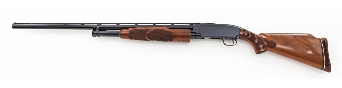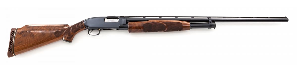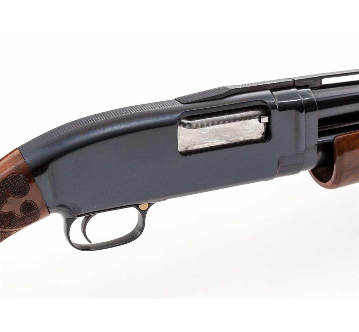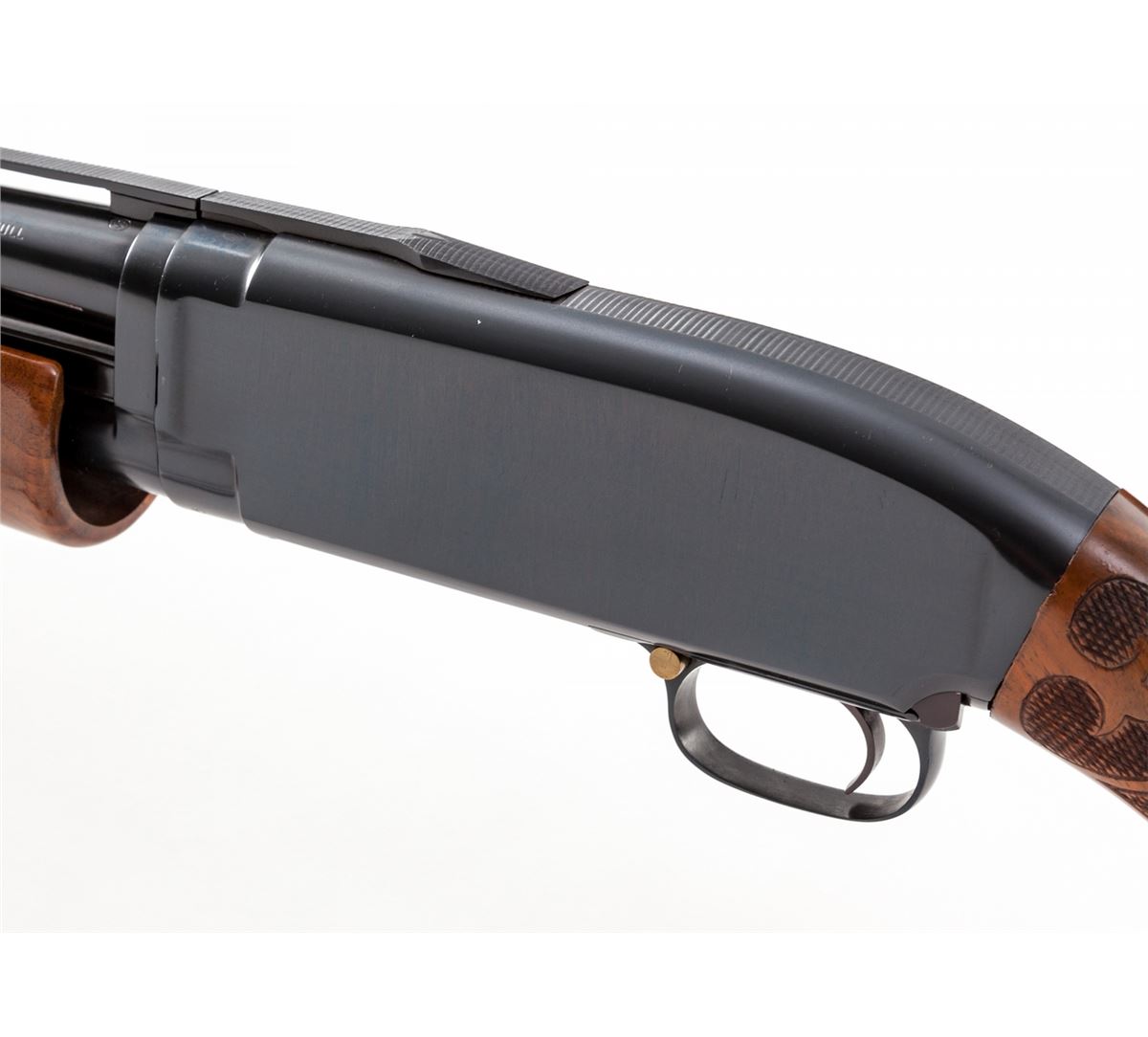 Customized Winchester Model 12 Slide Action Shotgun, #1400535, 12 ga., 2-3/4'' chamber, blue finish, 30'' barrel with matted ventilated rib, front and middle white beads, Full choke, gold-plated triggerguard safety button (locked in ''Fire'' position), bright engine-turned bolt, carrier and extractor, engraved pigeon on the lower receiver extension; replacement pistol-grip semi-gloss finish Monte Carlo walnut stock and handle with original Winchester hard rubber grip cap, 20-line-per-inch fleur-de-lis and ribbon checkering. Length of pull is 14'' over a 1'' brown Pachmayr ventilated recoil pad; drop at comb: 1-5/8'': drop at M.C.: 1-3/4''; drop at heel: 2-1/2''; weight is 8-1/4 lbs. Mfg'd circa 1954. Overall condition as redone is very good with tight action needing repairs to safety button and trigger assembly, bore is bright, polishing worn on bolt, reblue is 99% with earlier scratching and marring along the sides of the rib, grip cap toning olive with accumulated old varnish. Wood is 99% with light handling marks. Est.: $800-$1,200. (C&R)