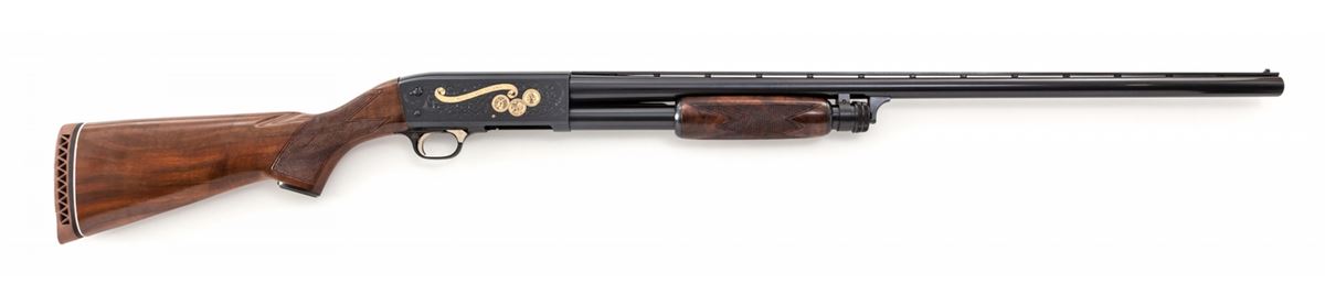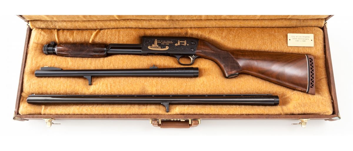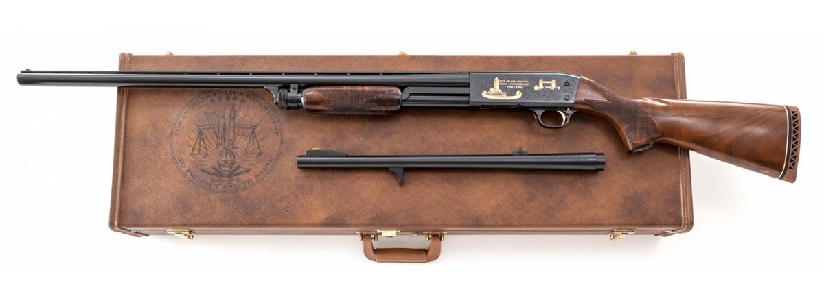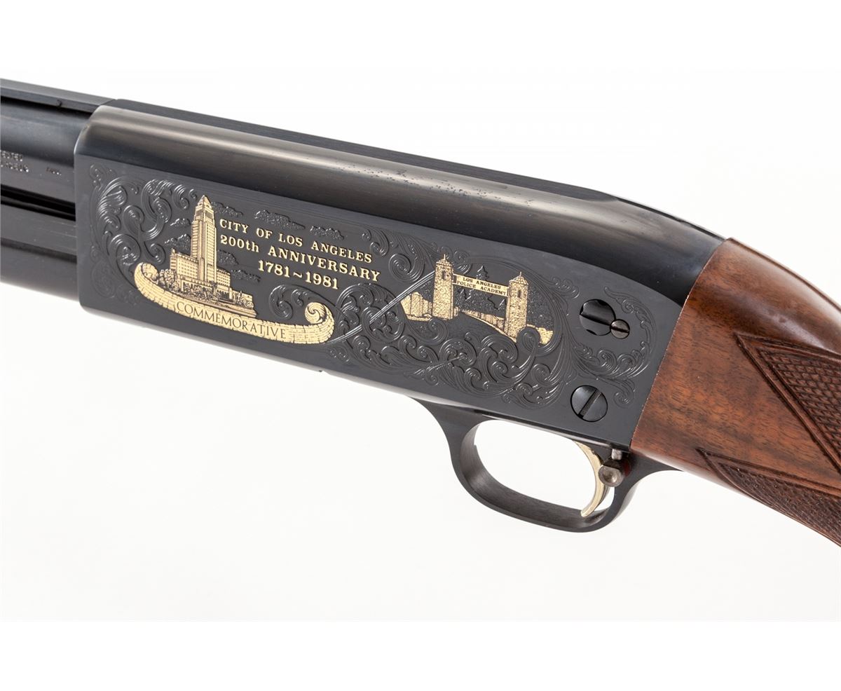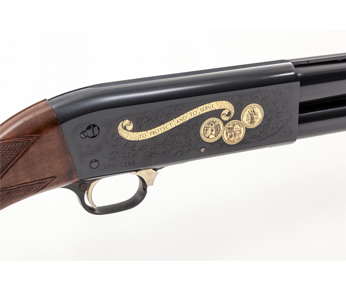 City of Los Angeles 200th Anniversary & LAPD Commemorative Ithaca Model 37 Featherlight Pump Action Shotgun, (1781-1981), #LAPD-1286, 12 ga., 18-1/2'' slug barrel, and 28'' vent rib barrel choked Mod.; blue finish with applied gold City Hall, Police Academy, City medallions, and ''To Protect and To Serve'' motto in riband, with rolled scroll engraving as well; checkered walnut stock with factory brown rubber butt pad, and facsimile of LAPD Centurion shield as pistol-grip cap. Complete in its original factory case, with shipping box. Mfg'd 1981. Condition is excellent, as new in its original case. Case with some minor patination to brass-plated hardware. Est.: $600-$800. (Modern)