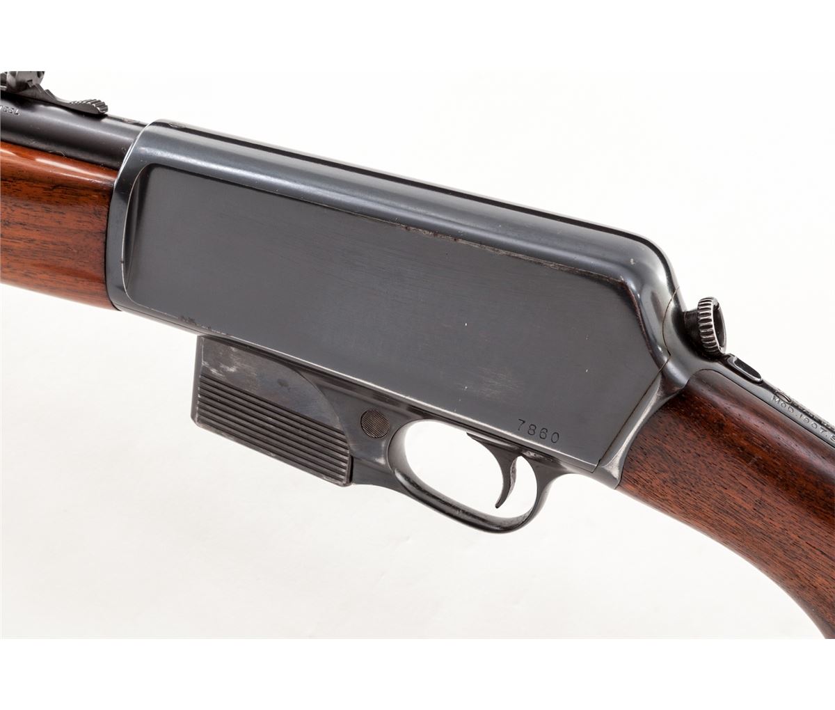 Exceptional Winchester Model 1907 Self-Loading Rifle, #7860, .351 cal., 20'' barrel, blue finish, walnut stock, factory hard rubber butt pad, with original magazine. Mfg'd 1907. Condition is excellent retaining approx. 97% original factory blue, with light wear at muzzle and high edges and thinning to magazine. Stock with light scuffs and scratches, and very light thinning and small losses to varnish. Action is crisp, bore is bright. Est.: $750-$1,000. (C&R)