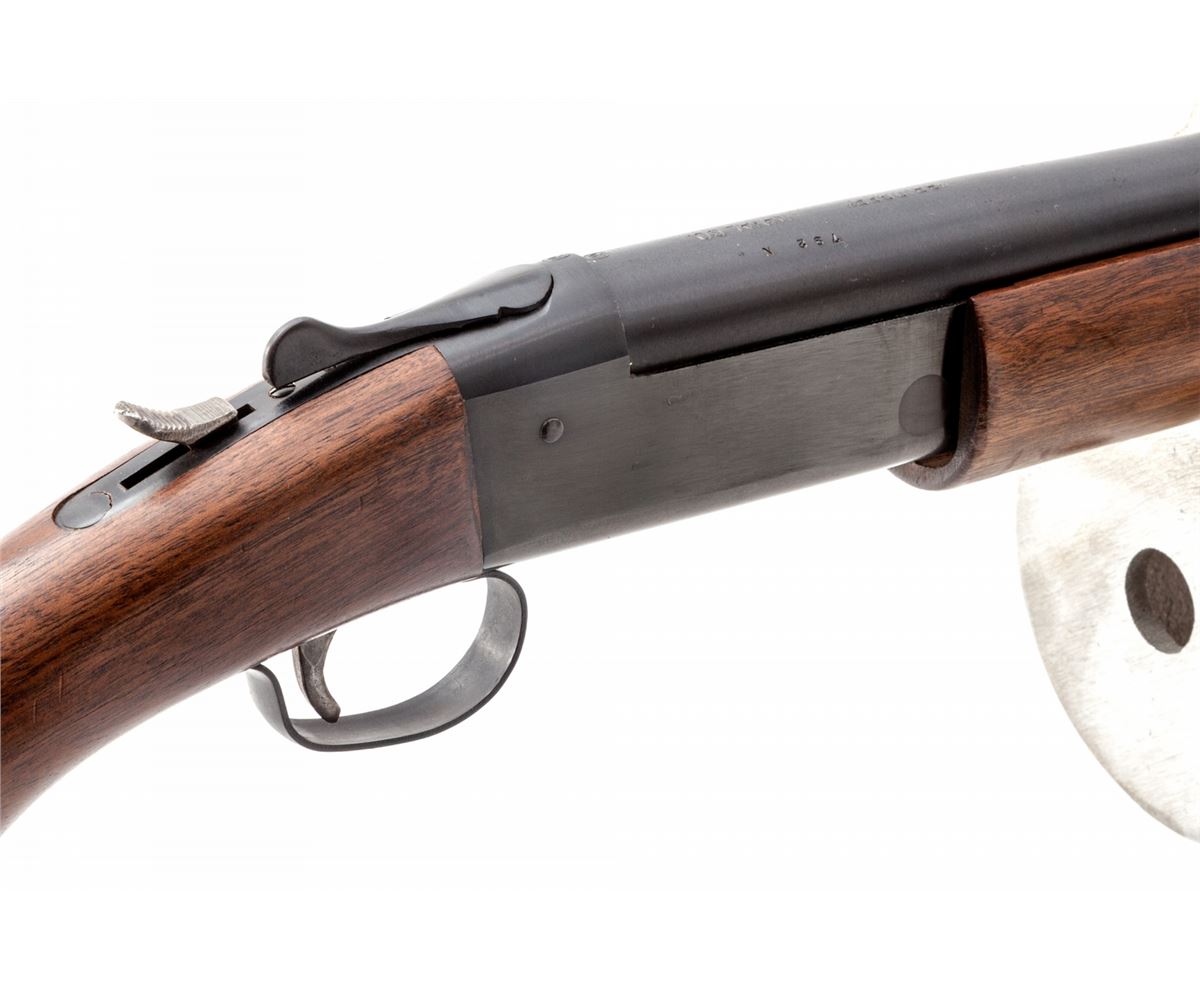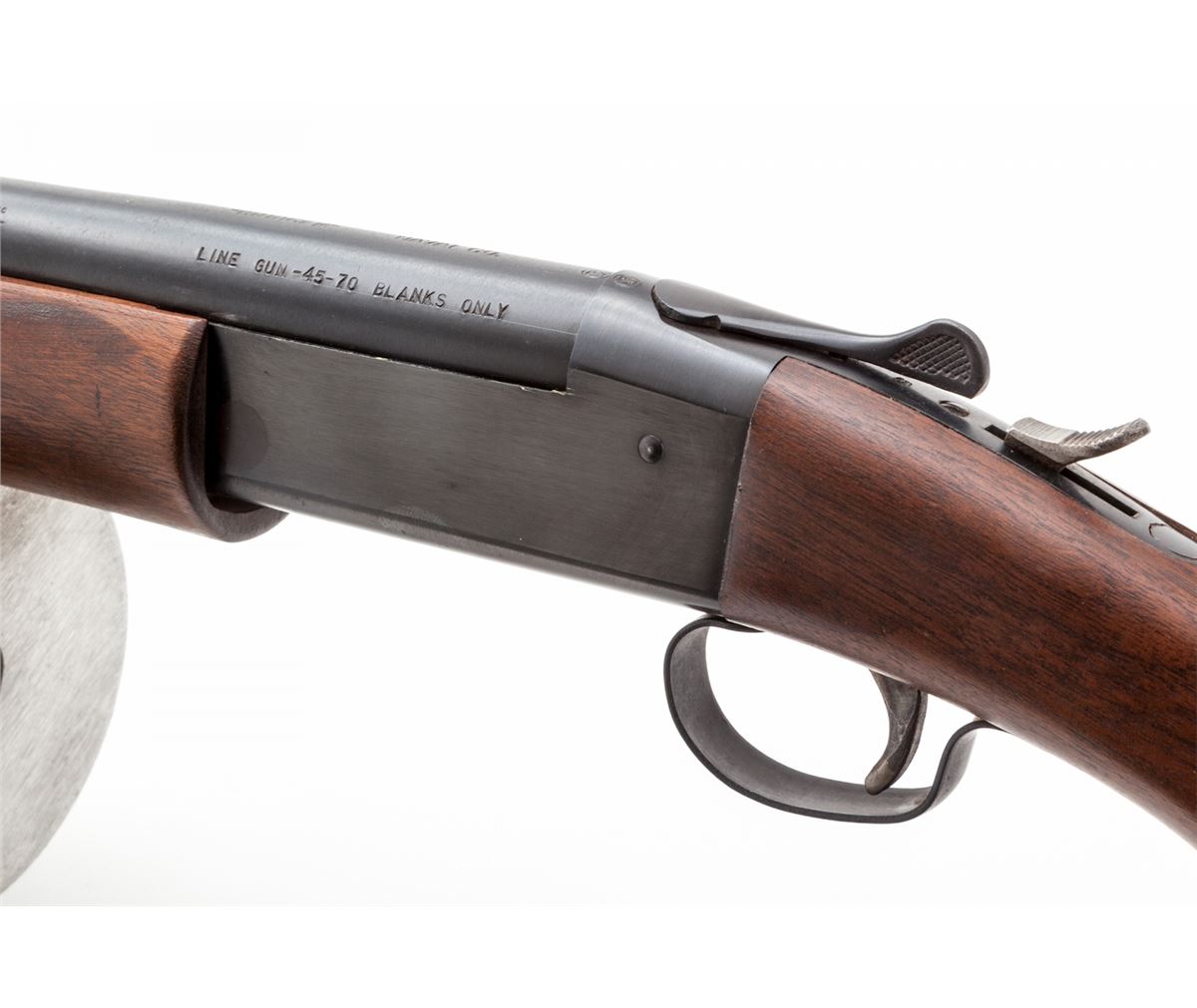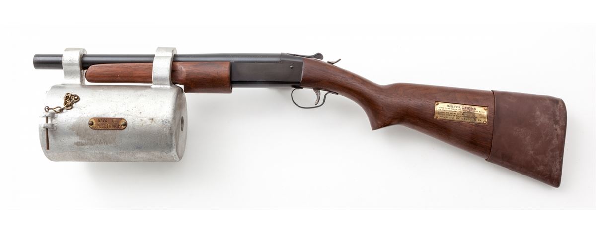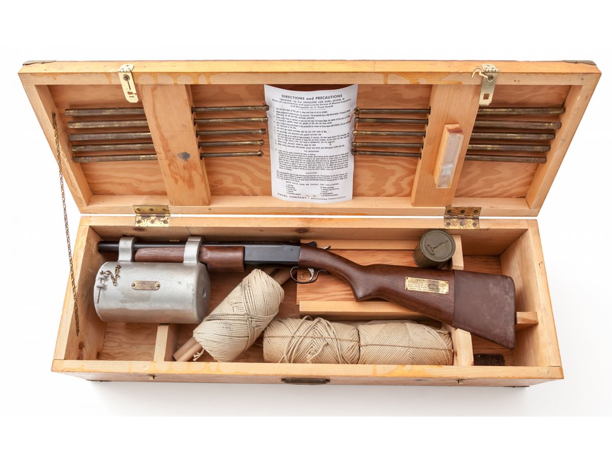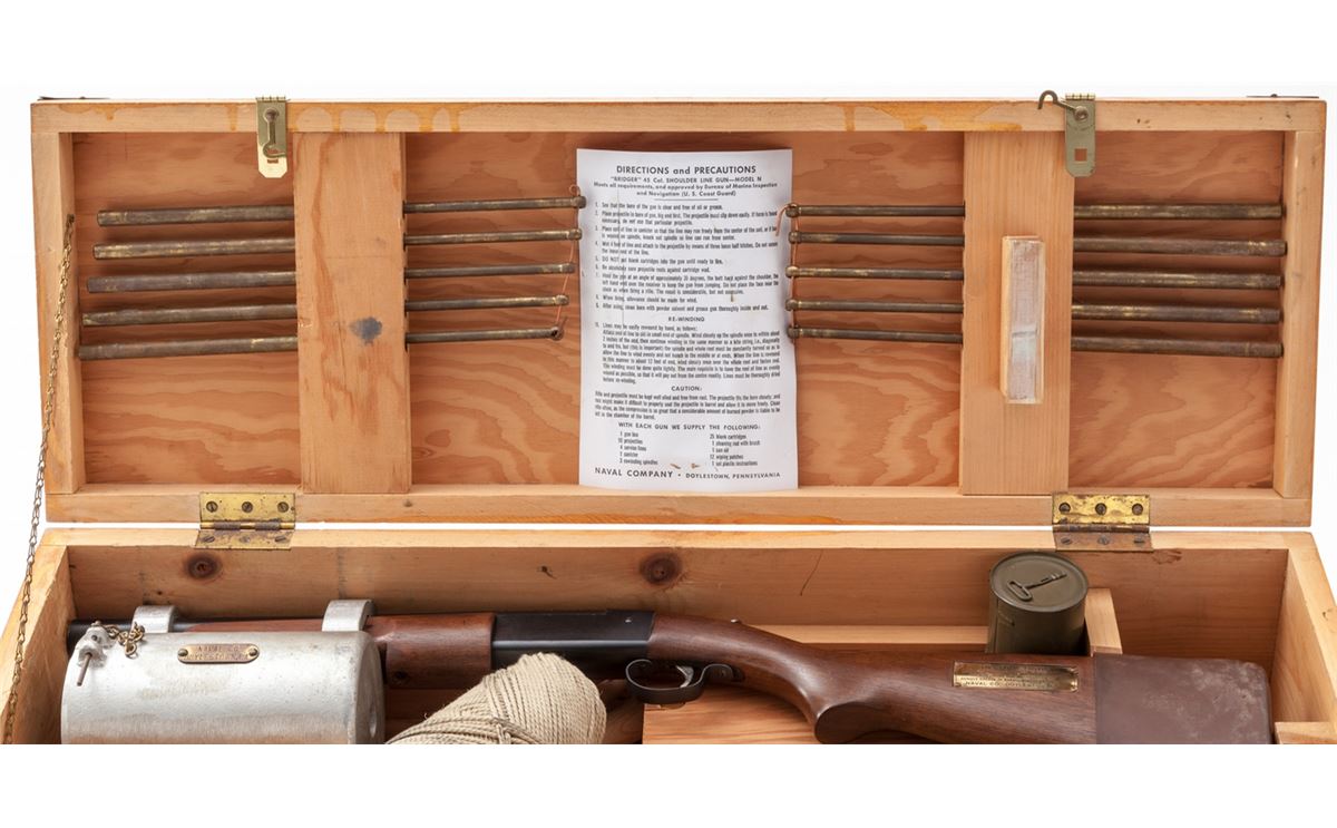 Bridger/Winchester Line Thrower, .45-70 blank, 14'' barrel, blue finish, walnut stock and forend. Brass plaque to left cheekpiece area, with original waterproof instructions, all in original plywood case marked ''Bridger Shoulder Line Gun, Naval Co., Doylestown, PA'', with accessories. Line throwing blanks dated 1953. Condition is excellent showing little use. Missing canister cover. Exterior of case with scuffs and scratches to lid. Est.: $750-$1,000.