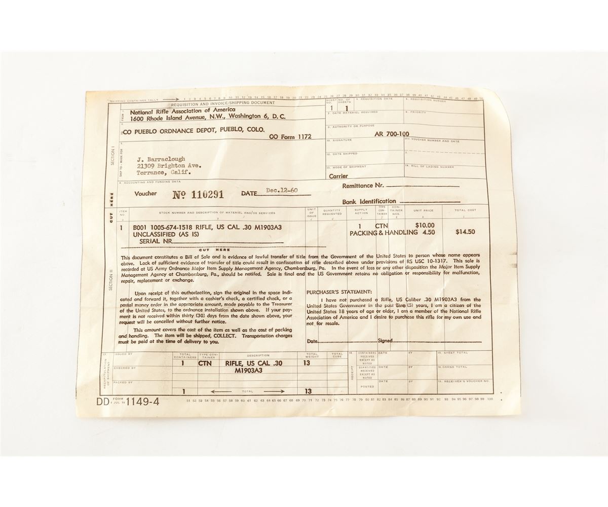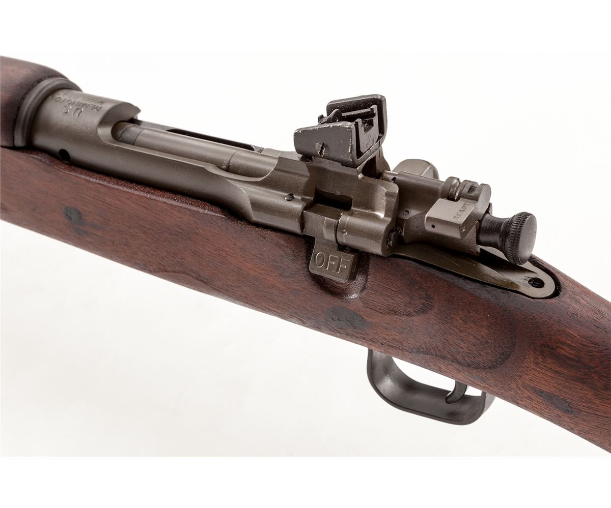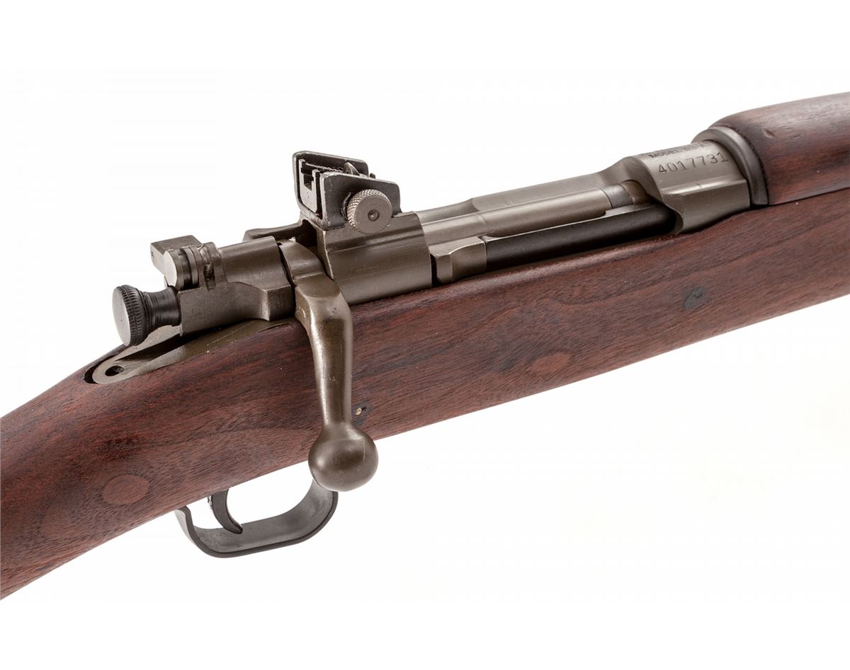 U.S. Model 03-A3 Bolt Action Rifle, by Remington, #4017731, .30-06 cal., 24'' RA barrel dated 9-43, parkerized finish, straight walnut stock, with boxed ''OG'' cartouche for Ogden Arsenal, with original DCM paperwork dated Dec. 12, 1960, as consigned from its original recipient. Condition is excellent, appearing as new and unused, with only the lightest marks from handling. Est.: $600-$800. (C&R)