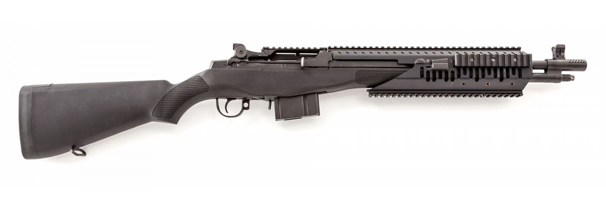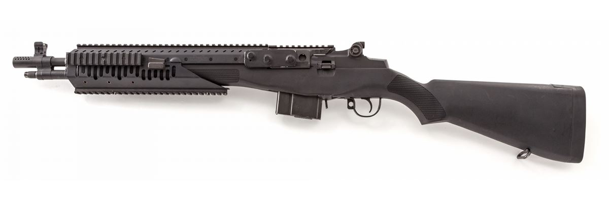 Springfield M1A Socom II Semi-Automatic Rifle, #182992, .308 cal., 16'' barrel with muzzlebrake, modified with Picatinny upper handguard and removable lower rail, parkerized finish with Zytel type stock. M14 style buttplate has been replaced by rubber replacement, with hooded rear sight aperture. Condition is fine as modified showing light to moderate field use, with crisp action and mirror bright bore. Est.: $1,000-$1,500. (Modern)