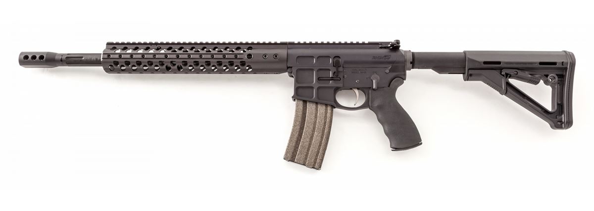 Rhino Arms RA-4R Semi-Automatic Rifle, #SC01189, 5.56mm, 16'' Wilson Combat barrel with compensator, telescoping stock, Picatinny top rail, bullet button configuration with 10-round magazine. Condition is excellent, appearing as new and unused, with only light marks from handling. Sights not included. Retails @ $2,699. Est.: $1,800-$2,400. (Modern) (Field Time)