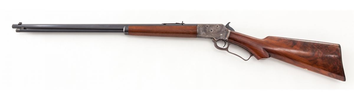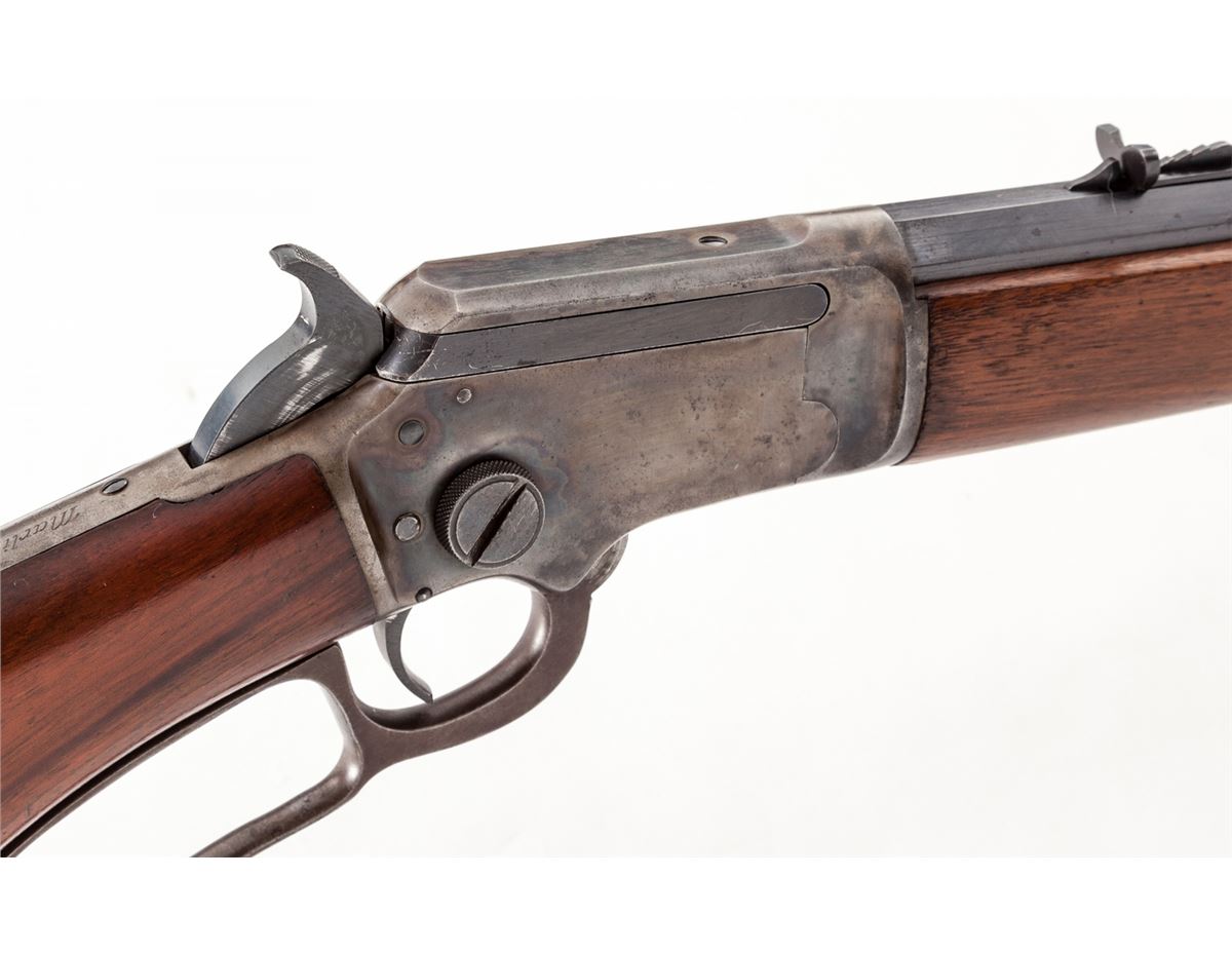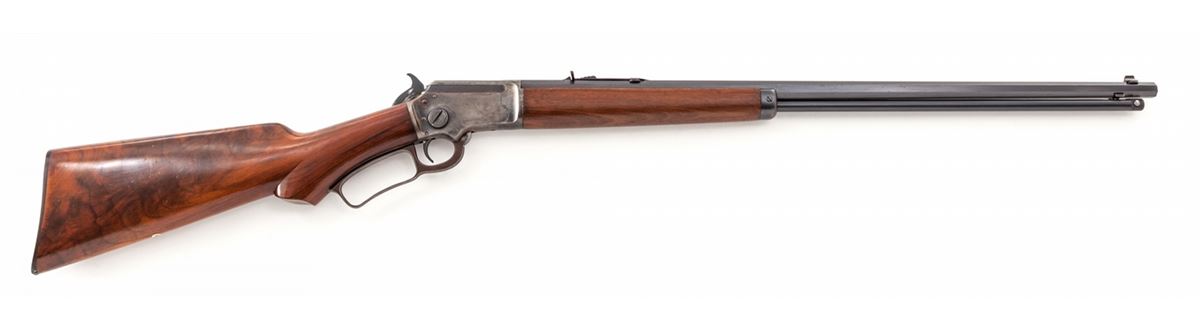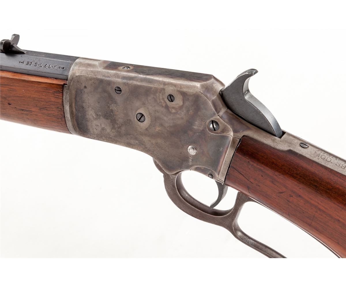 Early Semi-Deluxe Marlin Model 39 Lever Action Rifle, #S3752, .22 SL/LR cal., blue and case hardened finish, 24'' octagonal barrel, rear semi-buckhorn and blade front sight with white bead, upper tang with correct inspector star mark and factory tapped for peep sight. Semi-pistol grip ''S'' curve stock is flame figured extra-fancy walnut with matching straight grain through the wrist and forearm, in medium glass finish with early checkered Marlin hard rubber buttplate. Mfg'd ca. 1926-1927. Condition is excellent with smooth functioning action and minimal signs of actual use, having a bright bore and sharp rifling; 98%+ blue finish with friction losses on hammer, trigger and near sight elevator. Barrel flats and edges have faint scattered oxidation but remain largely unmarred as do the screw heads; muzzle has oxidation spots. Case colors are muted to 75% with losses generally on upper tang, lower receiver and lever edges; balance of lever with darkening patina. Stock and forearm are 98% with fine scratching and light impressions appearing to be mainly from rack or cabinet storage; toe of buttplate has a small area of light chipping. Overall, a very appealing and desirable Model 39. Est.: $1,800-$2,400. (C&R)