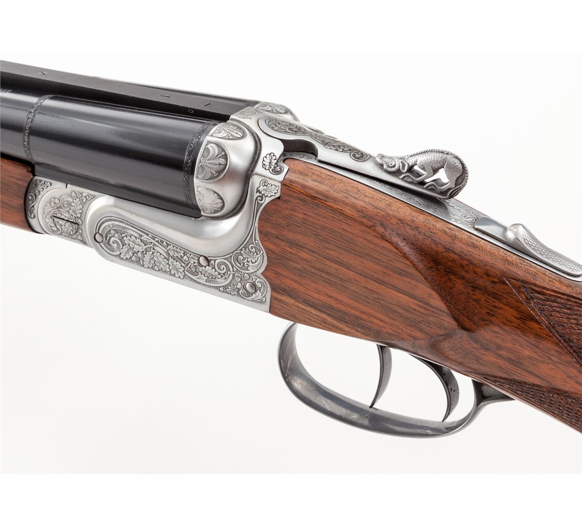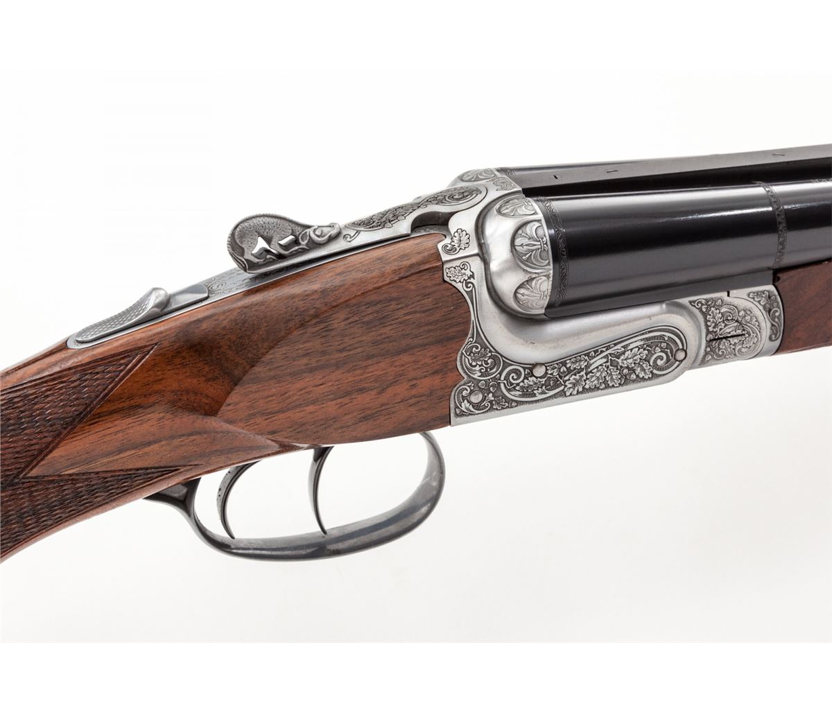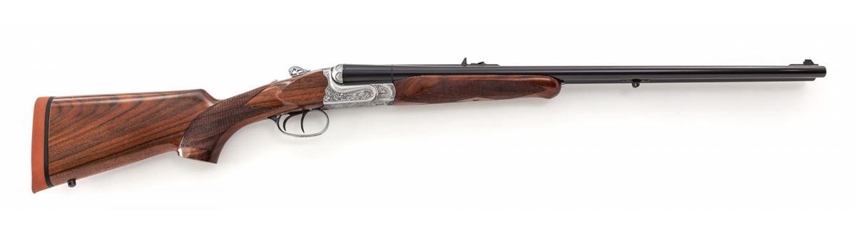 Safari Model Double Rifle, by Sabatti, #CAB0428, .450/400 NE cal., 24'' blue barrels, Italian engraved frame showing oakleaf, scroll and acorn motif; pierced dog-shaped lever, finely checkered walnut stock with cheekpiece, and red Pachmayr Decelerator red rubber butt pad with black spacer. Three-leaf Express rear sight with gold bead front sight. Rear portion of rail drilled and tapped for scope mount, which is included. Condition is excellent showing little use, with very small losses to rear portion of upper edge of forend, which detracts little. Action remains crisp, bores are mirror bright. In original hard case with instructions, snap caps, certificate and test target. Est.: $2,500-$3,500. (Modern)