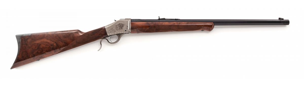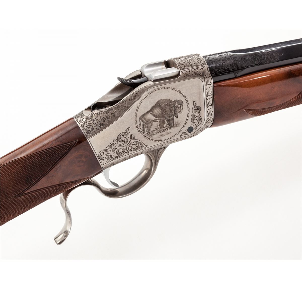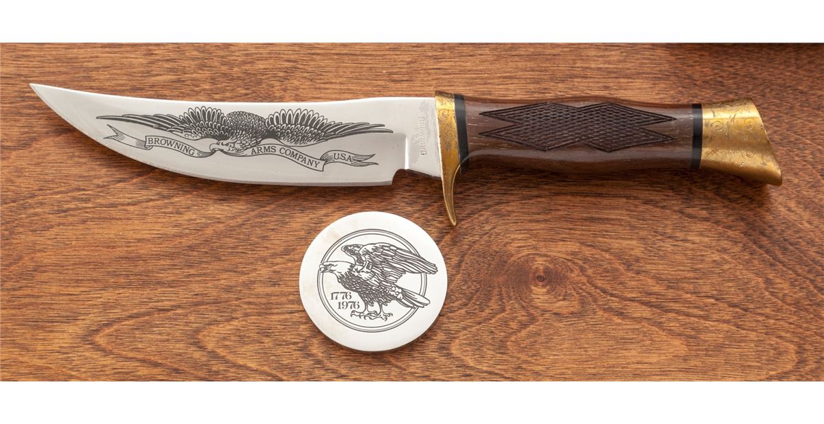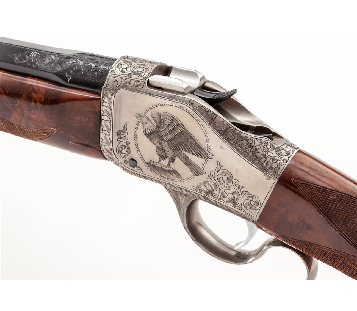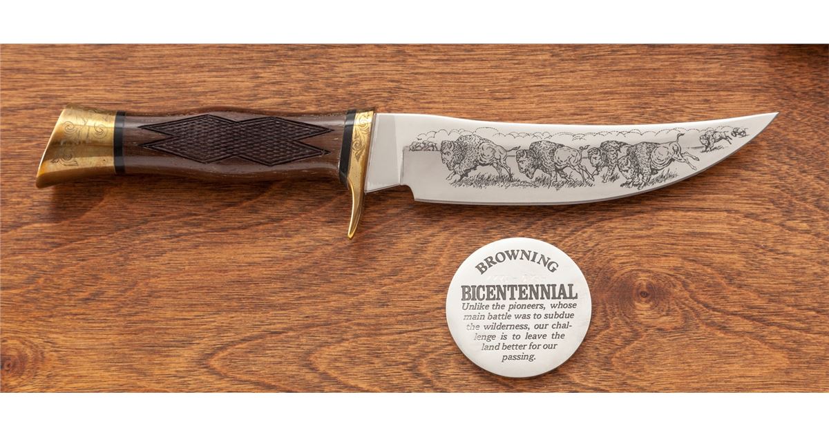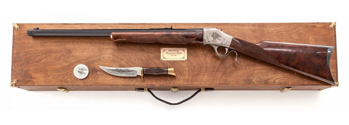 Browning Model B-78 BiCenntenial Edition 1 of 1000 (1776-1976) Single Shot Rifle, 1776#0788, .45-70 cal., 24'' octagonal barrel, coin finished frame, beautifully scroll engraved with bison and bald eagle scene to receiver flat, fancy checkered walnut stock with engraved blue buttplate. Muzzle and breech area of barrel additionally scroll engraved. Mfg'd in Japan, finished in Belgium. In presentation case with similarly adorned Browning USA skinning knife, and individually numbered commemorative coin. Condition is excellent showing only the slightest marks from handling. In original red velvet-lined pine case with external plaque. Original factory box, instructions and shipping sleeve is included. Exterior of original box with some water damage that shows as mild wrinkling. Est.: $2,000-$3,000. (Modern)