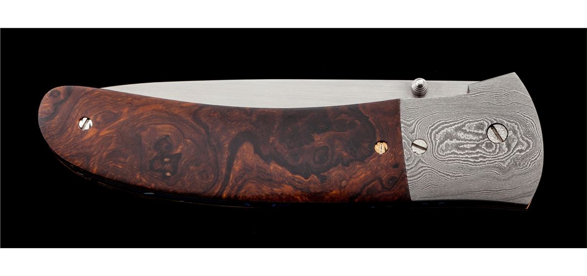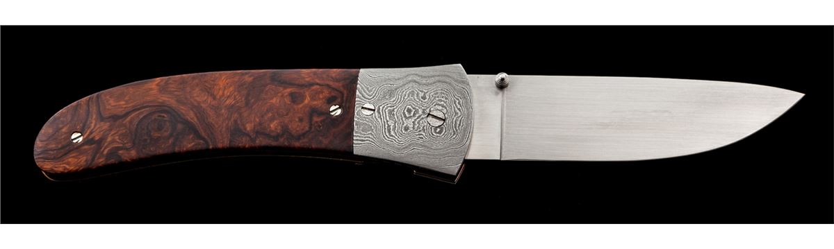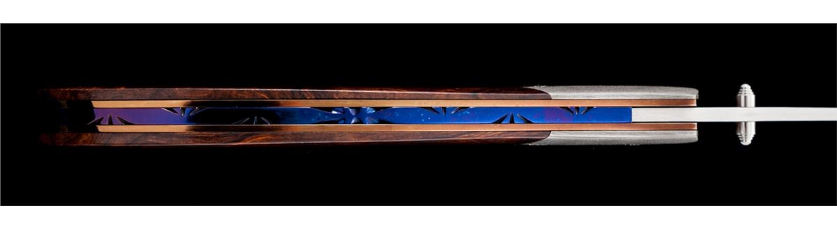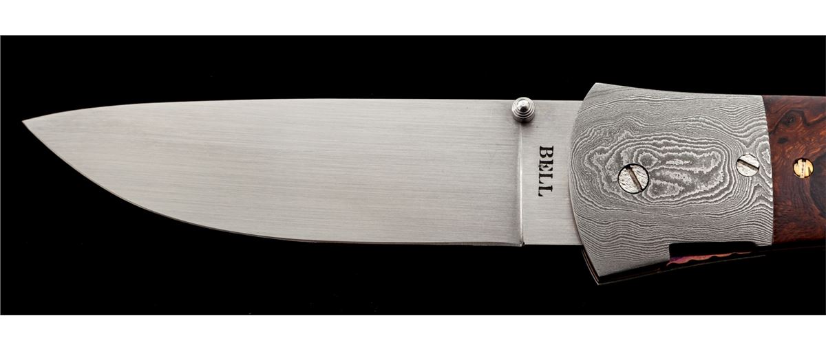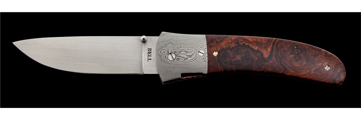 Custom Liner Lock Folding Knife, by Don Bell, 3-3/4'' drop-point blade marked on ricasso ''BELL'', 5'' overall closed length, dual thumb studs, damascus bolsters, iron wood scales, with polished copper-colored liners. Condition is excellent appearing as new and showing no use. Est.: $400-$600. (Ian Shein estate)