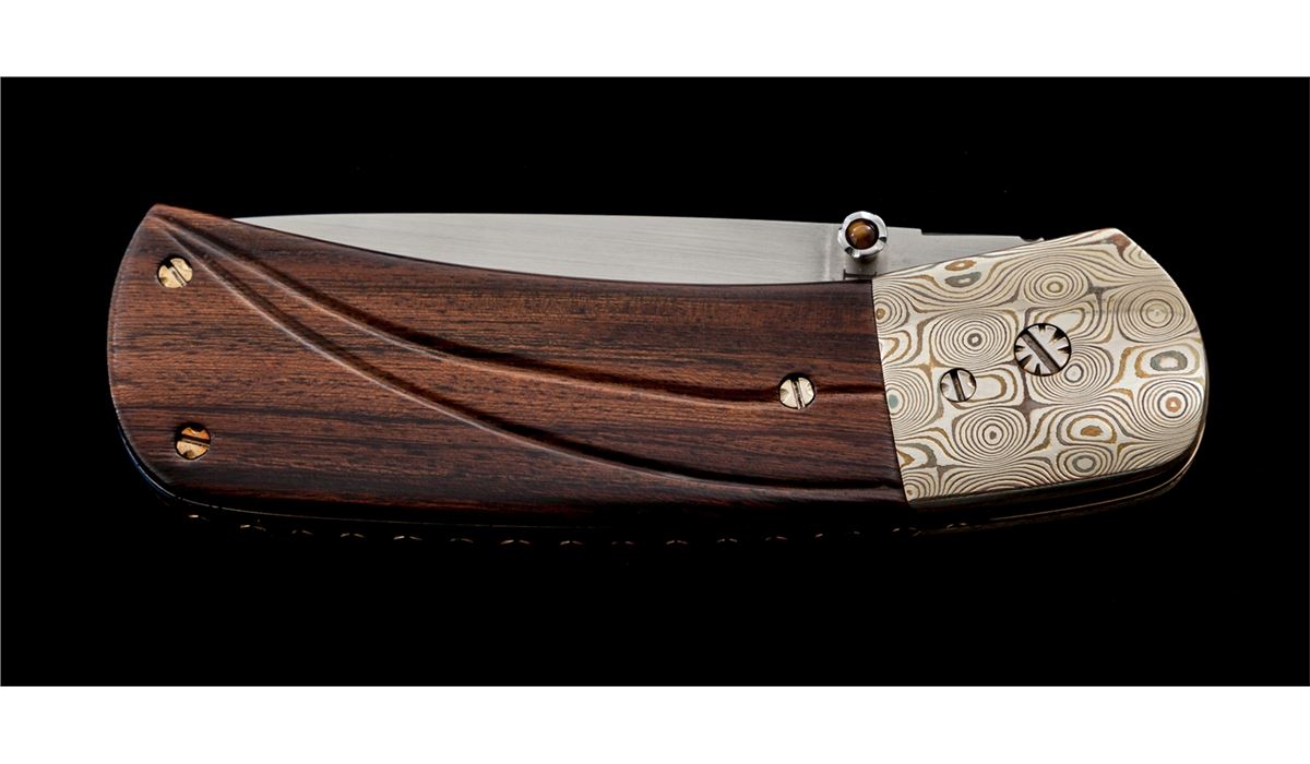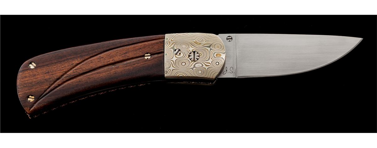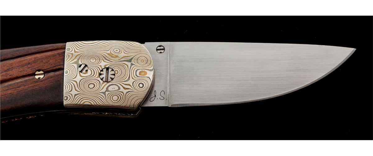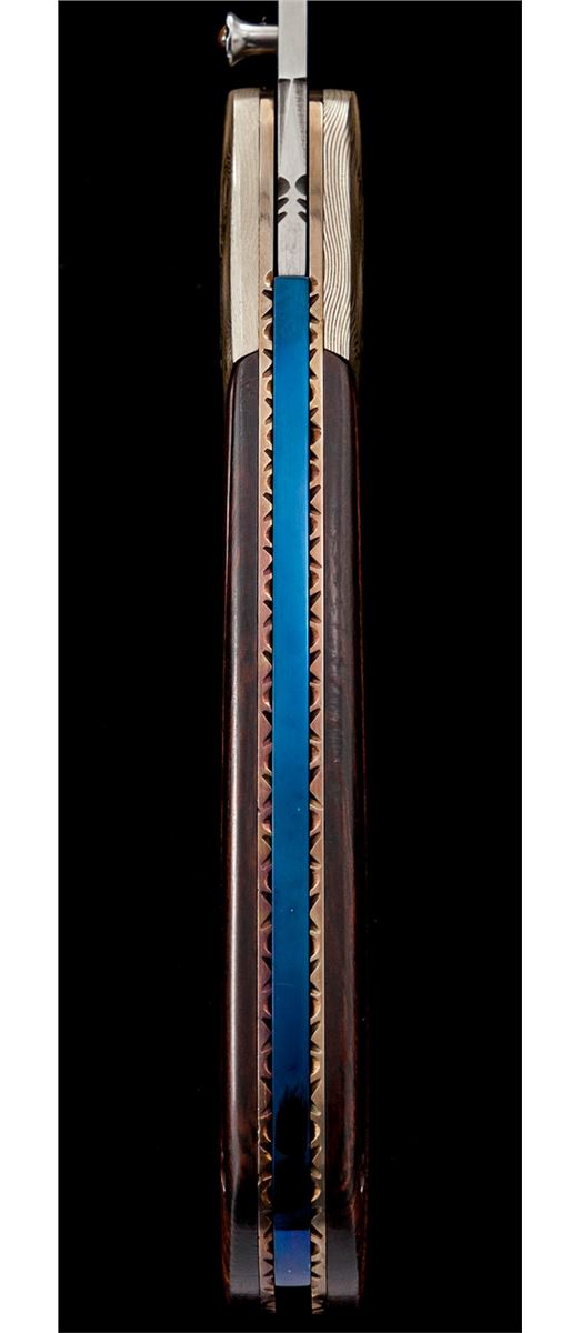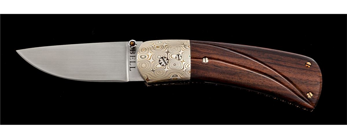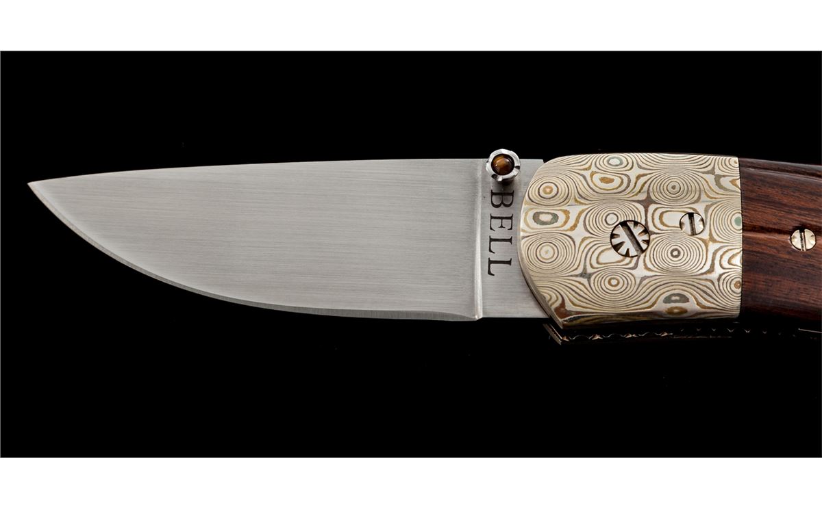 Beautiful Custom Liner Lock Folding Knife, by Don Bell, 2-3/4'' drop-point blade marked on ricasso ''BELL''; reverse is marked ''JS''; 4-1/8'' overall closed length, tiger's eye thumb stud, damascus bolsters, decorative wood scales with file worked screws, and file worked copper-colored liners. Condition is excellent appearing as new and showing no use. Amazing craftsmanship displayed on this one-of-a-kind knife. Est.: $650-$800. (Ian Shein estate)
