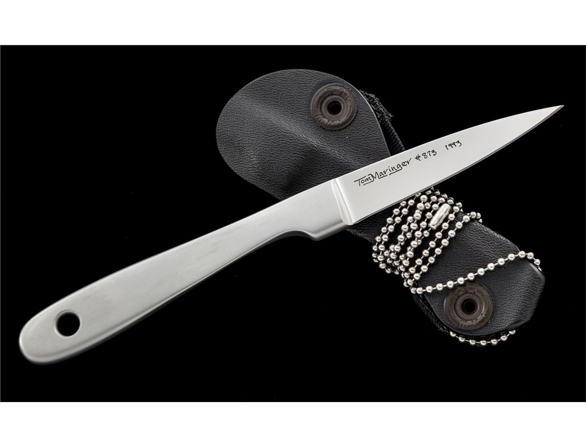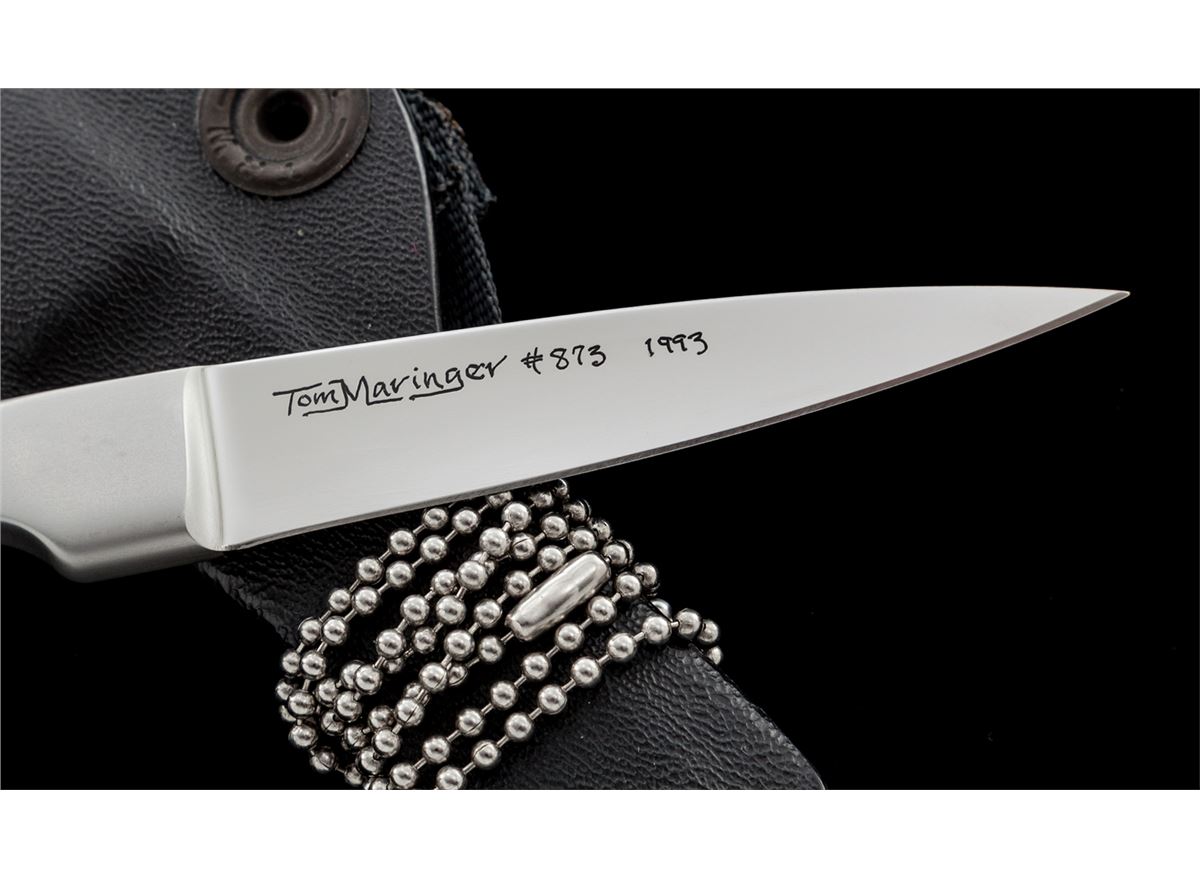 Rare Tom Maringer ''Vorpal Super Scalpel'', 2-7/8'' blade is etched ''Tom Maringer #873 1993'', 7'' overall length, made of stainless steel with an integral handle. Included is the original Kydex sheath, belt loop, and neck chain. Condition is excellent. Blade retains the original edge, with moderate amounts of micro-scratching and scuff marks to the blade from either light use or contact with the Kydex sheath. Est.: $400-$600.