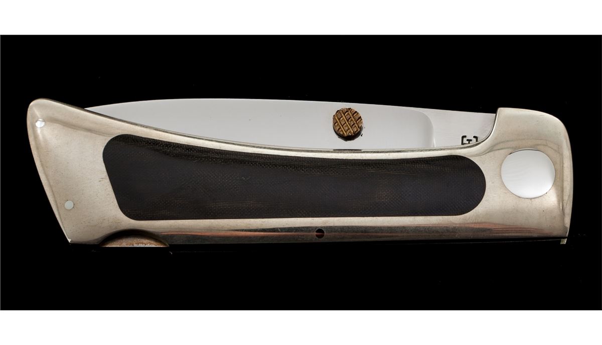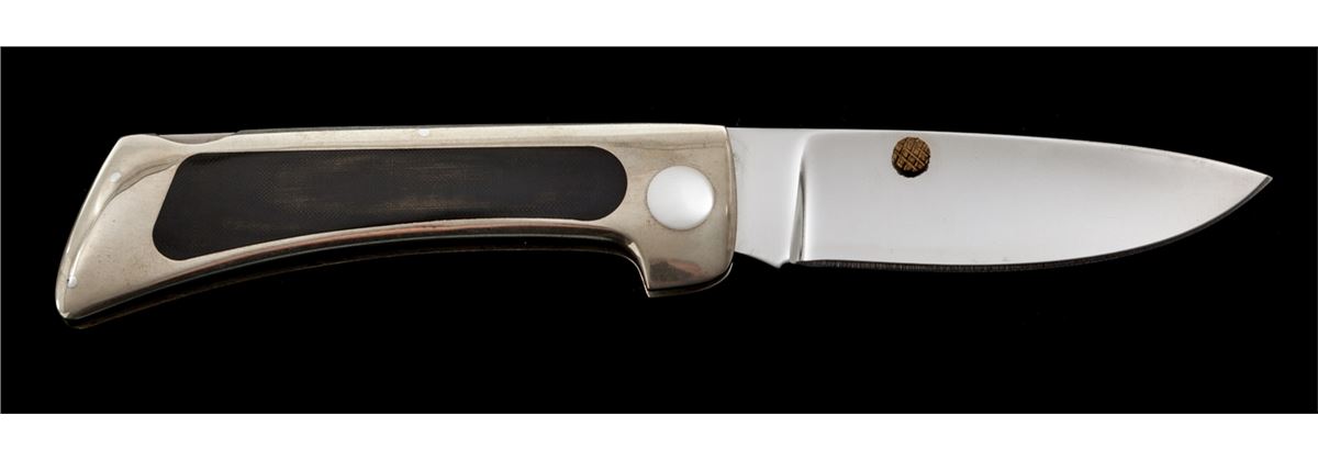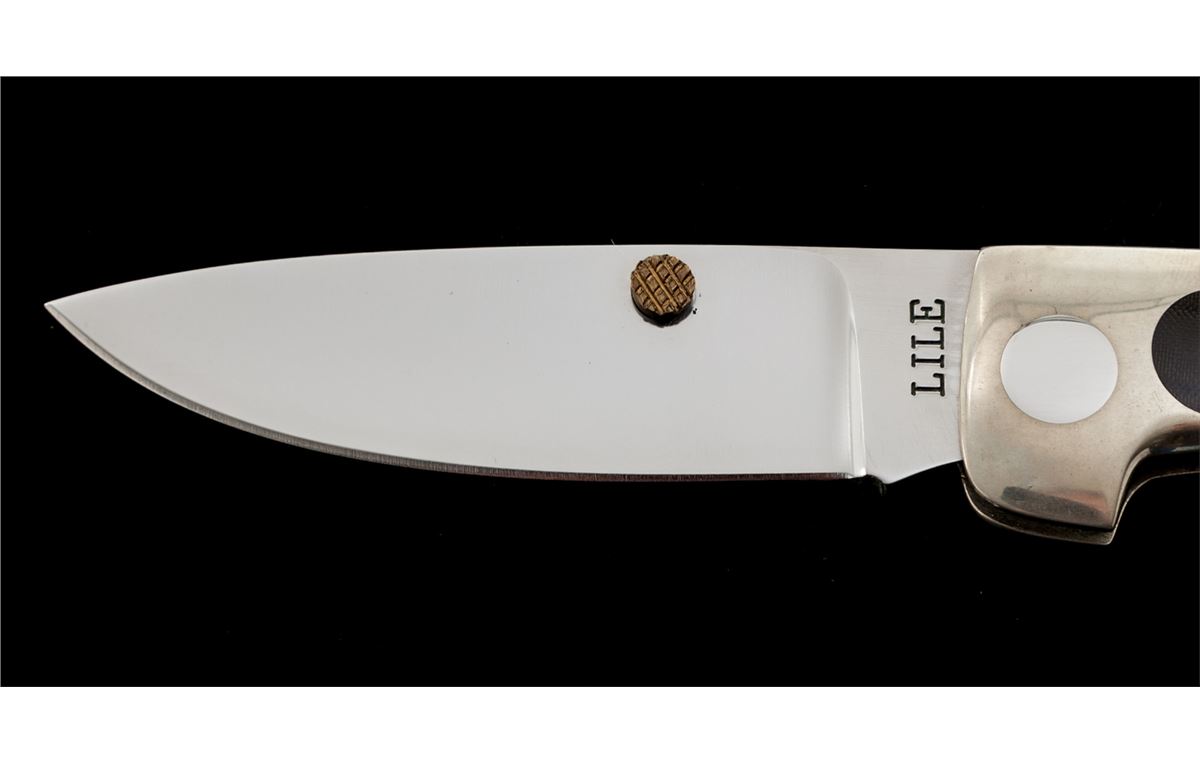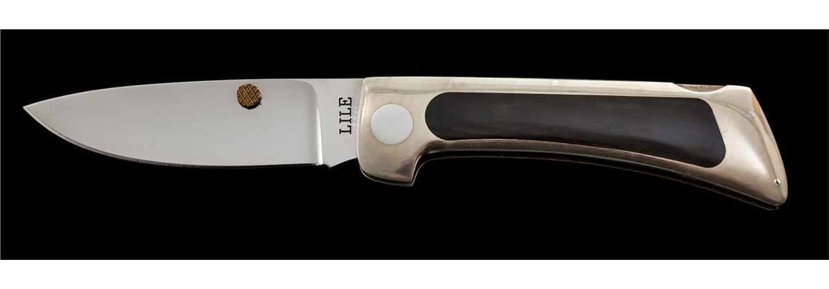 Custom ''E-Z Open Folder'', by James Lile, with lock back mechanism, 3'' drop-point blade marked on ricasso ''LILE'', 3-7/8'' overall closed length, dual thumb studs, nickel silver frame with black micarta inlays. Condition is excellent showing no use. Frame with light marks from handling. Est.: $450-$650. (Ian Shein estate)