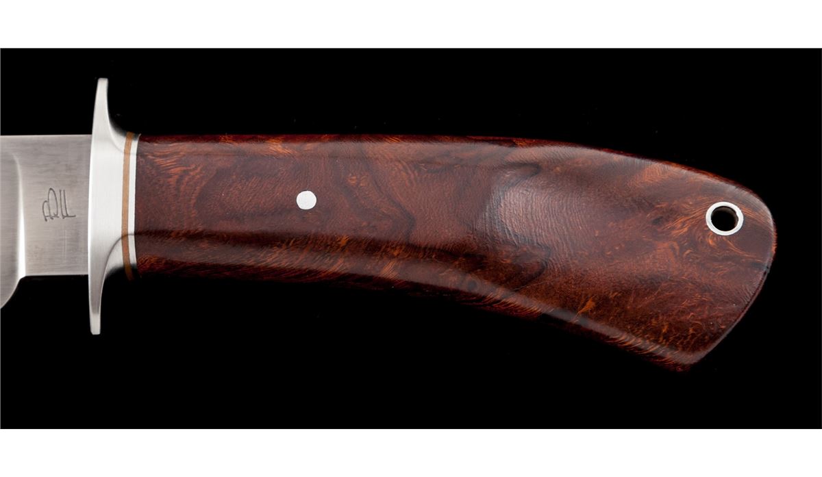 Early Custom Hunting Knife, by Burt Foster, 6-3/4'' clipped point blade has been polished to show the clay hardening line and is marked ''BF''; reverse is marked ''20JS04''; 11-5/8'' overall length, desert ironwood handle, stainless steel full guard with single copper spacer, nickel silver pins and wrist thong ferrule, in custom tooled BF leather sheath stamped ''BURT FOSTER/BRISTOL, VA''. Condition is excellent overall appearing as new and showing no use, with very light overall marks from handling. Est.: $400-$600. (Ian Shein estate)