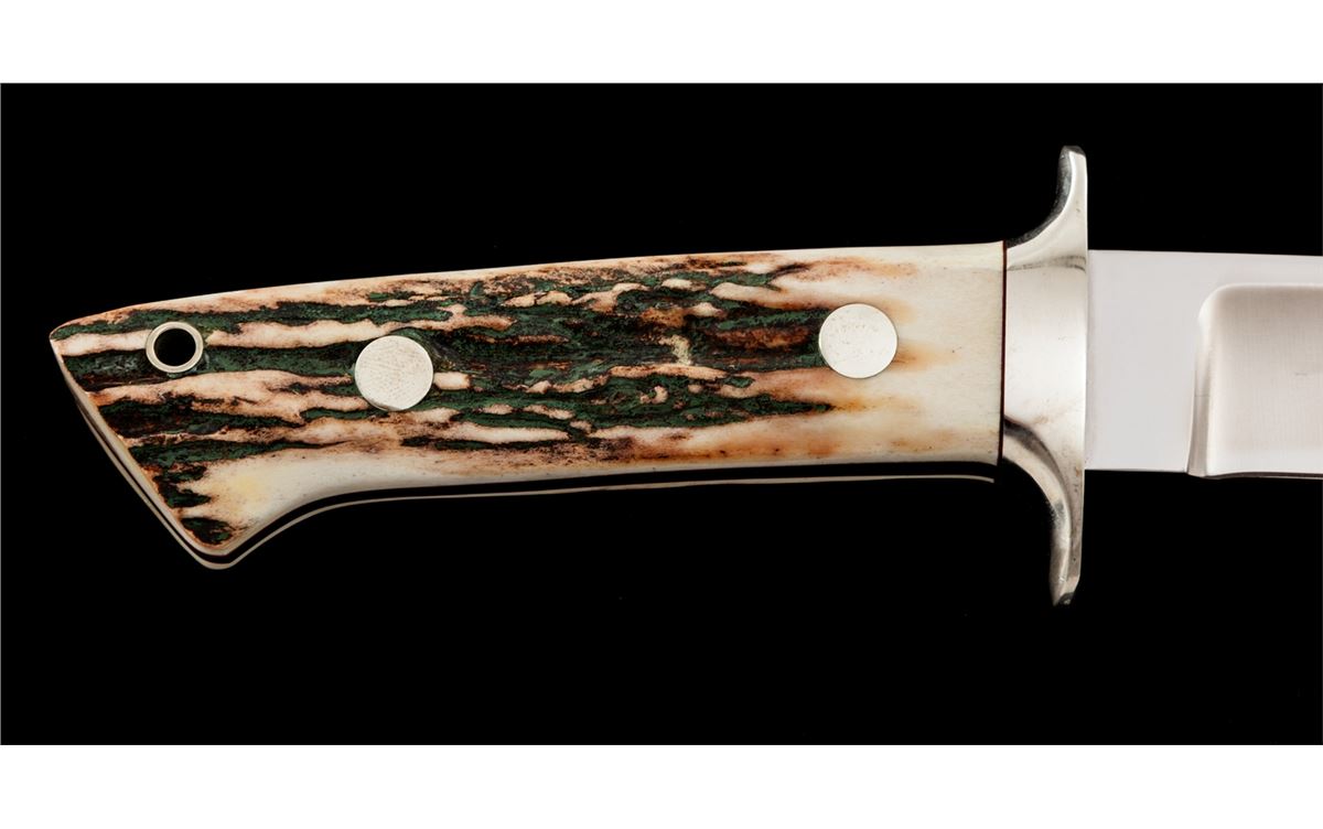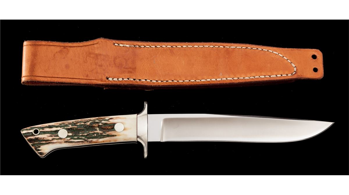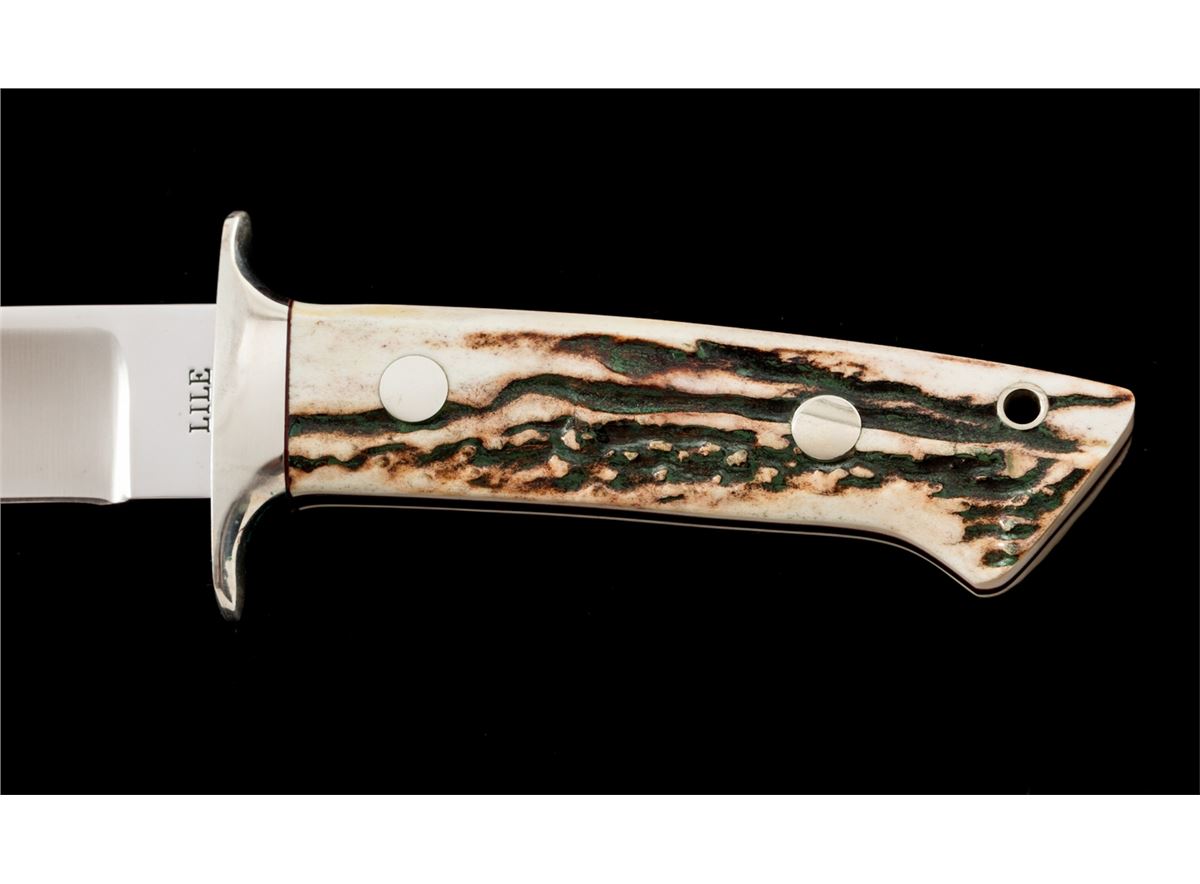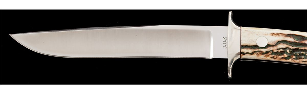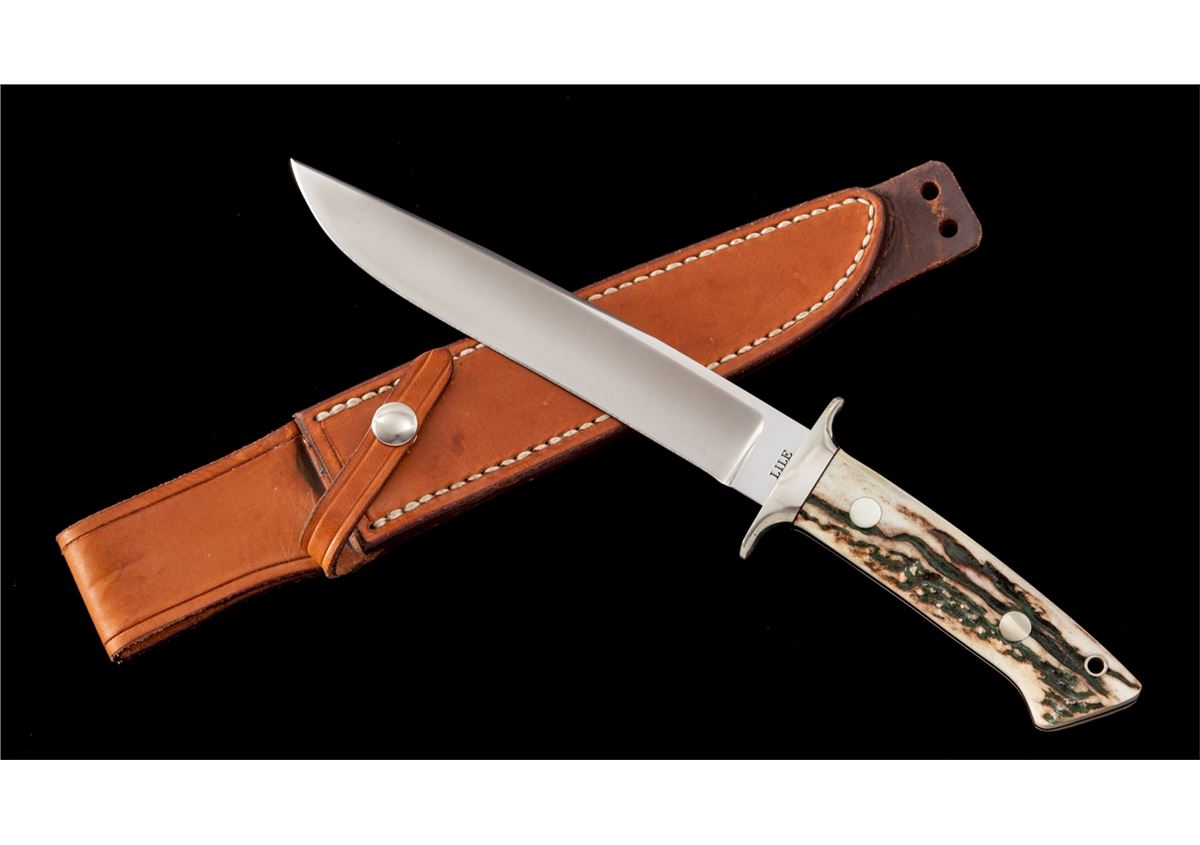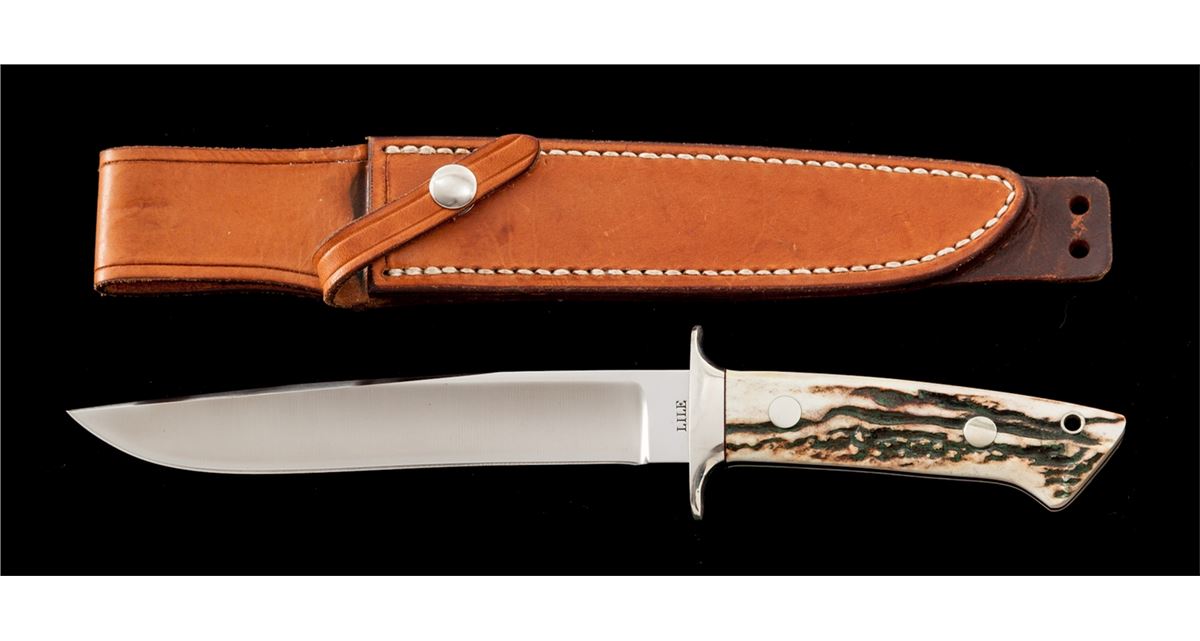Custom Hunting/Fighting Knife, by James Lile, 6-7/8'' blade marked on ricasso ''LILE'', 11-1/2'' overall length, nickel silver full guard, tapered tang, stag handles with red liners, nickel silver pins and wrist thong ferrule, in unmarked leather sheath. Condition is excellent showing no use. Guard with moderate amounts of micro-scratching and toning due to prolonged contact with leather sheath. Pins and exposed tang with light marks from handling. Leather sheath with light scuffs and scratches, and trace amounts of verdigris present at the throat; stitching and seams remain tight. Est.: $700-$1,000. (Ian Shein estate)