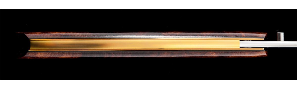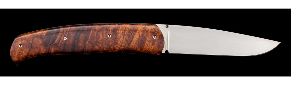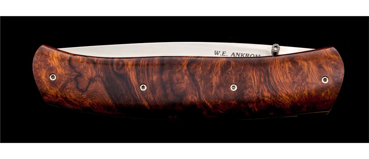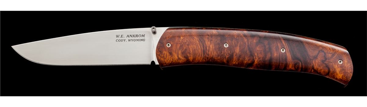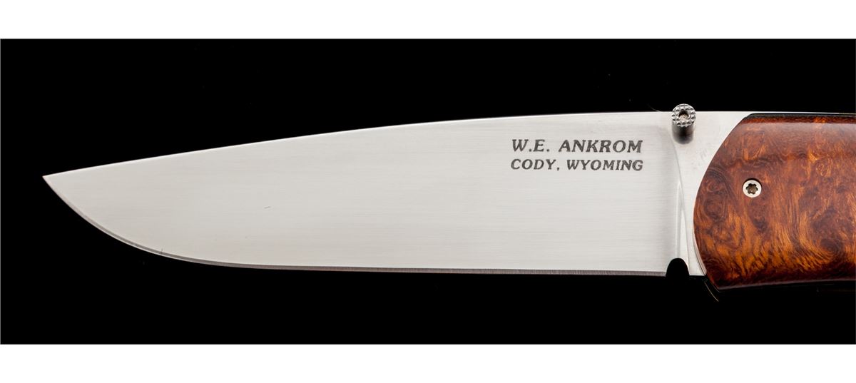 Custom Liner Lock Folding Knife, by W.E. (Bill) Ankrom, 3-3/8'' blade marked ''W.E. ANKROM/CODY, WYOMING''; 4-1/2'' overall closed length, single thumb stud, copper colored liners, with desert iron wood scales. Condition is excellent appearing as new and showing no use. Scales show light marks from handling. Est.: $450-$600. (Ian Shein estate)