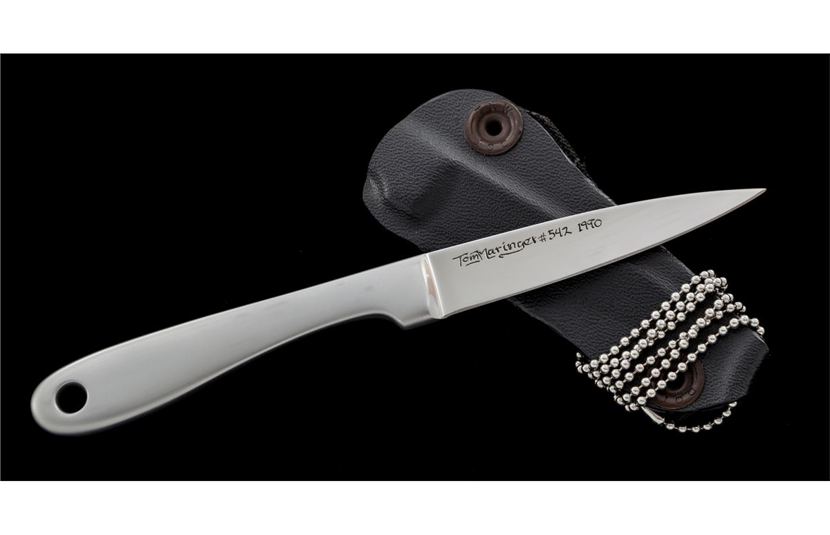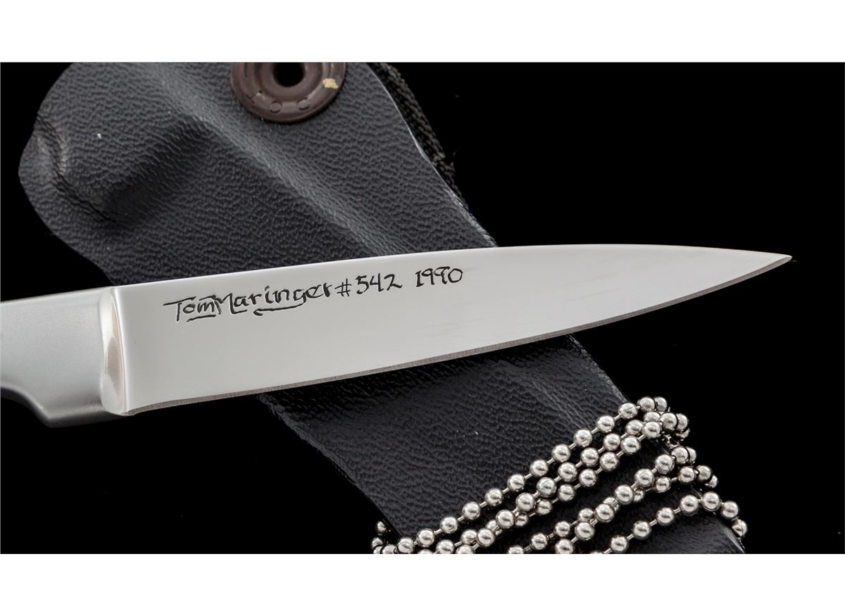 Rare Tom Maringer ''Vorpal Super Scalpel'', 3'' blade etched ''Tom Maringer #542 1990'', 7'' overall length, made of stainless steel with an integral handle. Included is the original Kydex sheath, belt loop, and neck chain. Tom Maringer is a retired knife maker who is known not only for his knife making but also for his early work and development of formed Kydex sheaths. Condition is excellent. Blade retains original edge with moderate amounts of micro-scratching and scuff marks from either light use or contact with the Kydex sheath. Est.: $400-$600.