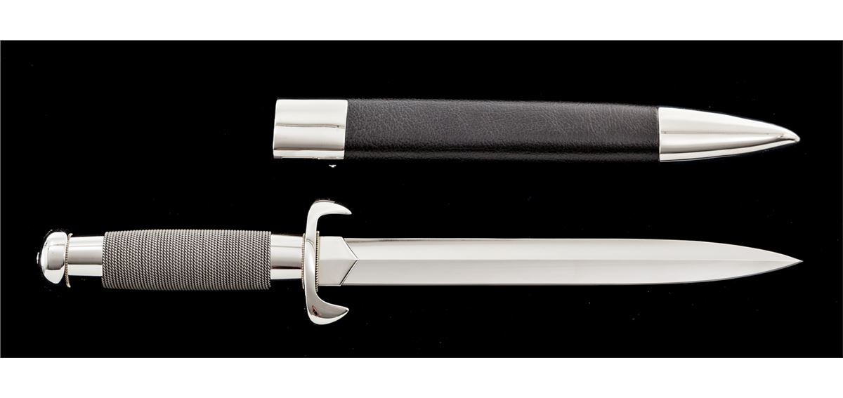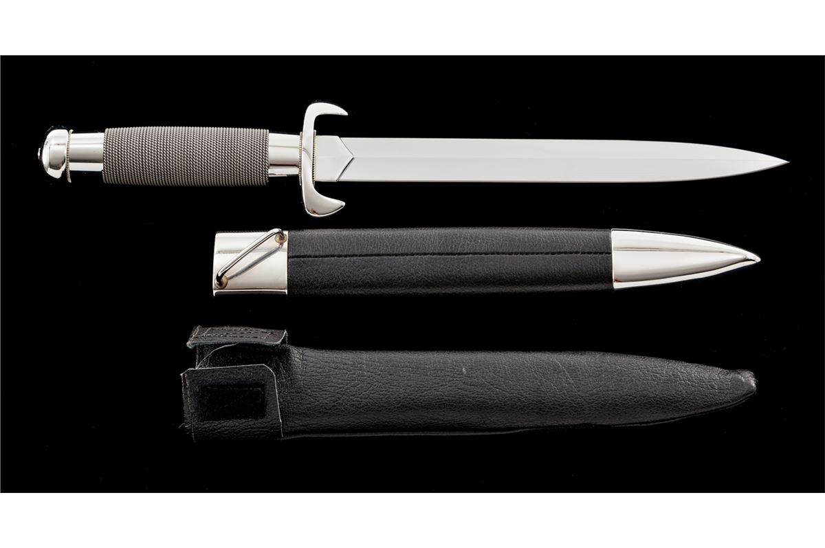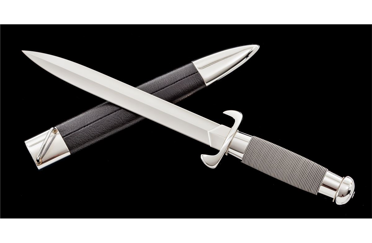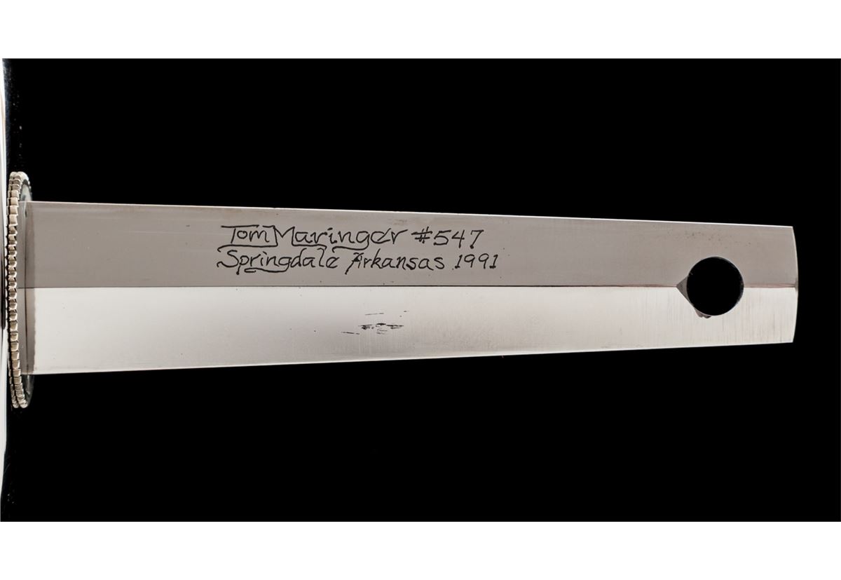 Extremely Rare Tom Maringer Custom Dagger, 9-1/2'' blade, 15'' overall, with tang marked ''Tom Maringer #547/Springdale Arkansas 1991''; mirror polished finish, wire wrapped handle, full curved guard, decorative spacers at both the guard and pommel, in black leather sheath with mirror polished throat and chape and additional leather outer cover. Condition is excellent. Metal surfaces with overall light marks and micro-scratching from handling. Est.: $1,000-$1,500.