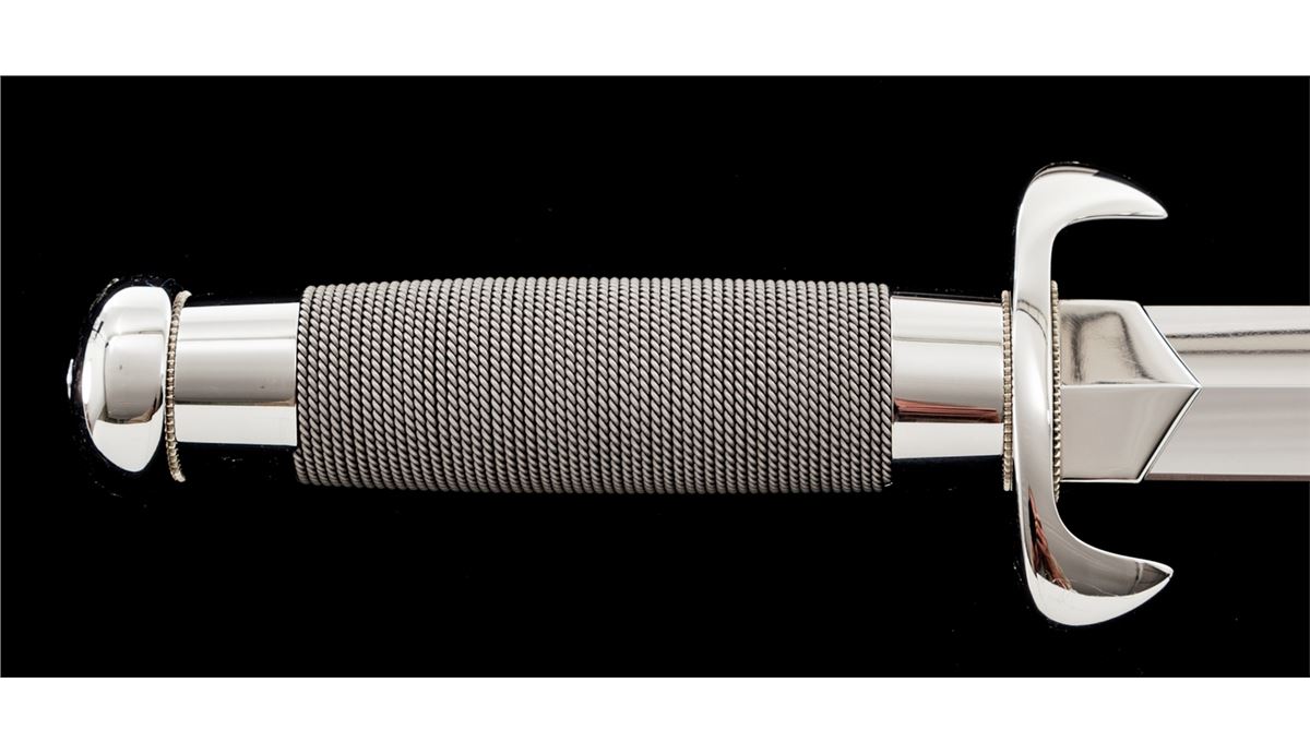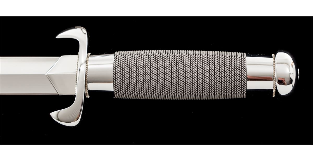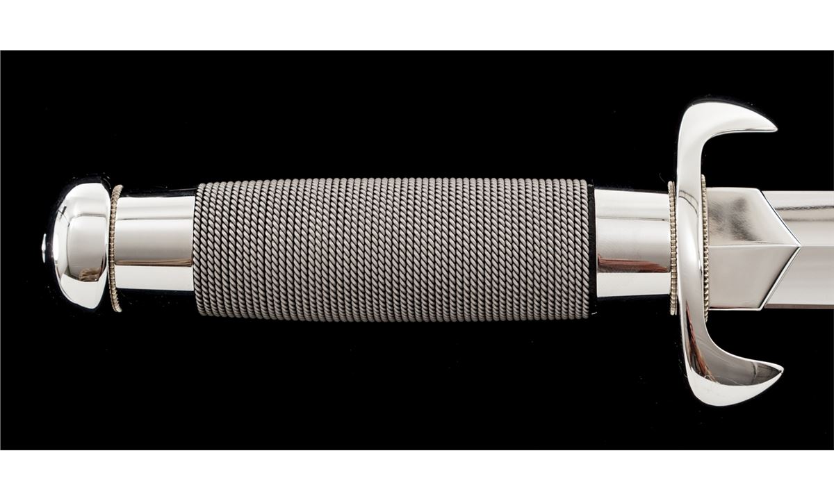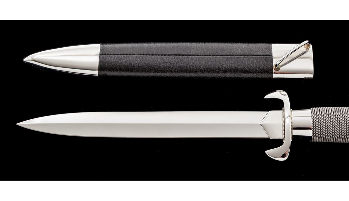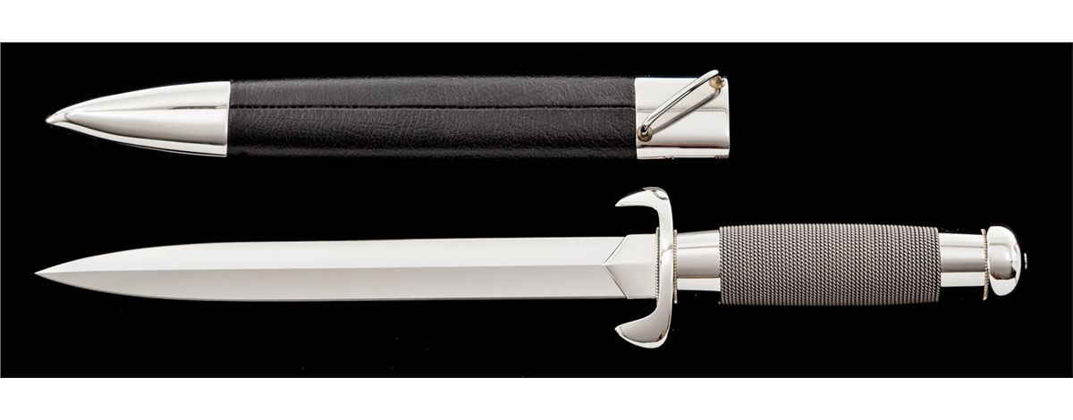 Extremely Rare Tom Maringer Custom Dagger, 9-1/2'' blade, 15'' overall, with tang marked ''Tom Maringer #547/Springdale Arkansas 1991''; mirror polished finish, wire wrapped handle, full curved guard, decorative spacers at both the guard and pommel, in black leather sheath with mirror polished throat and chape and additional leather outer cover. Condition is excellent. Metal surfaces with overall light marks and micro-scratching from handling. Est.: $1,000-$1,500.