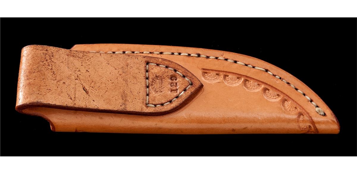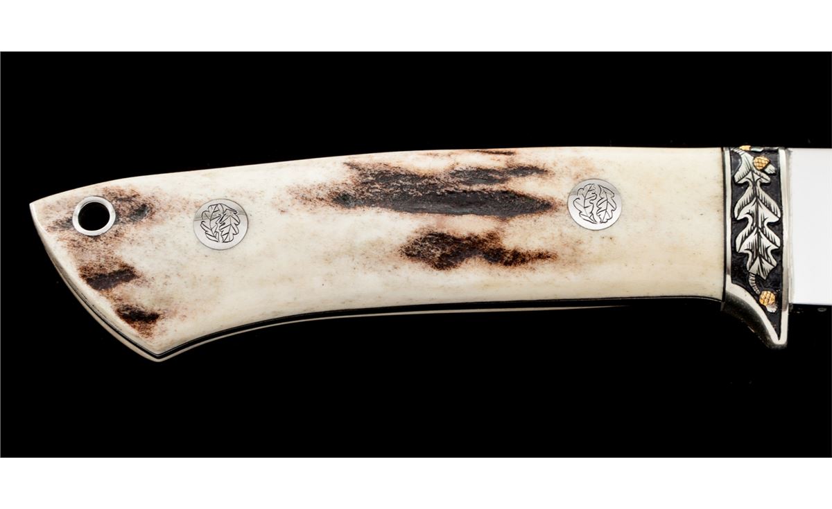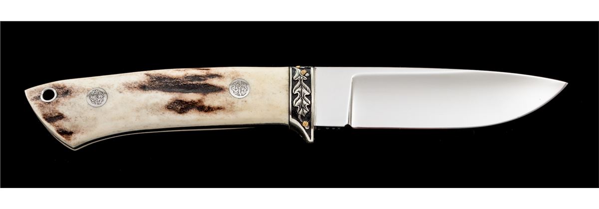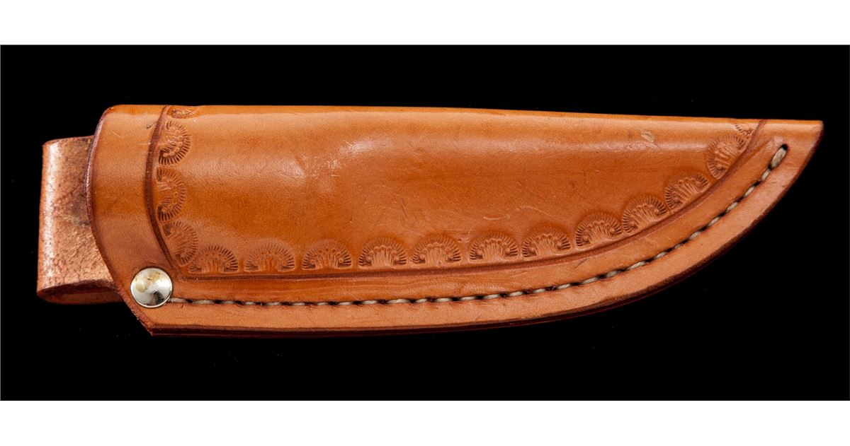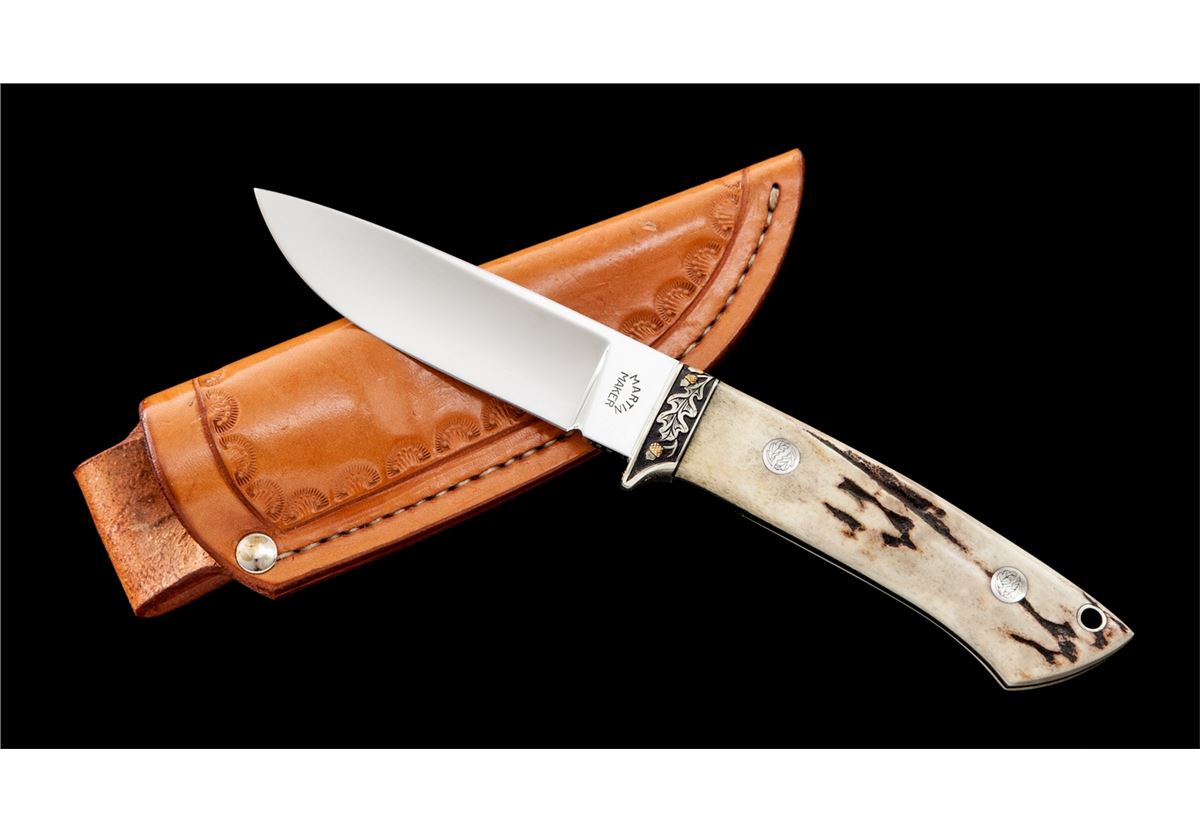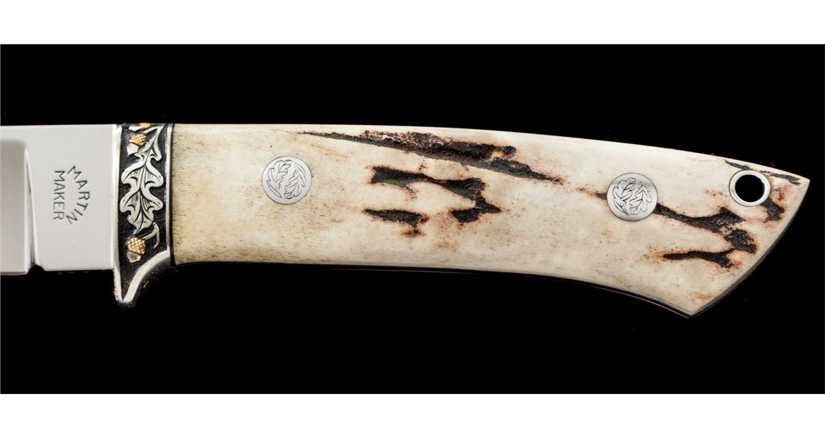 Custom Drop Point Knife, by Martin and engraved by Gil Rudolph, 4'' mirror polished blade marked on ricasso ''MARTIN/MAKER''; bottom edge of ricasso also marked ''129''; 8-1/2'' overall length, acorn and leaf engraved front bolster, tapered tang, stag grips, with engraved pins and the original tooled ''Martin'' sheath also numbered ''129''. Stag grips are signed on bottom edge ''Rudolph-Eng. 90''. Condition is excellent showing no use. Blade with scattered light micro-scratching; sheath with light impressions. A high quality custom knife, engraved by a well-known artist. Est.: $500-$700.
