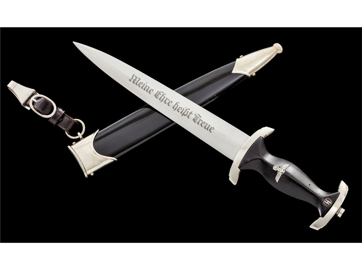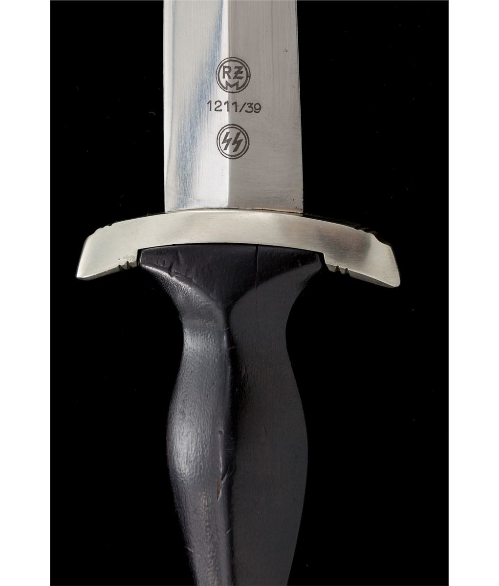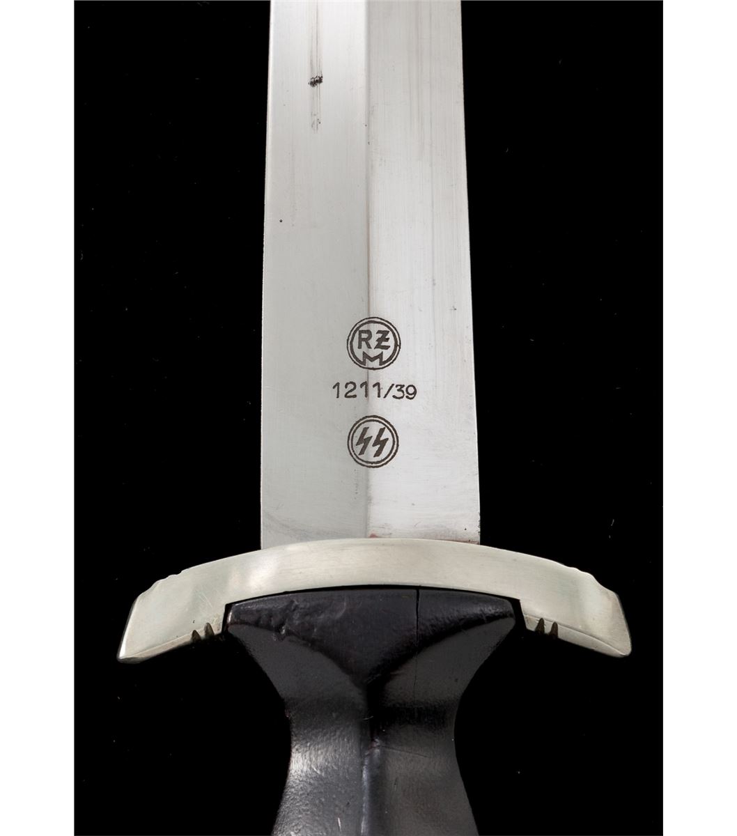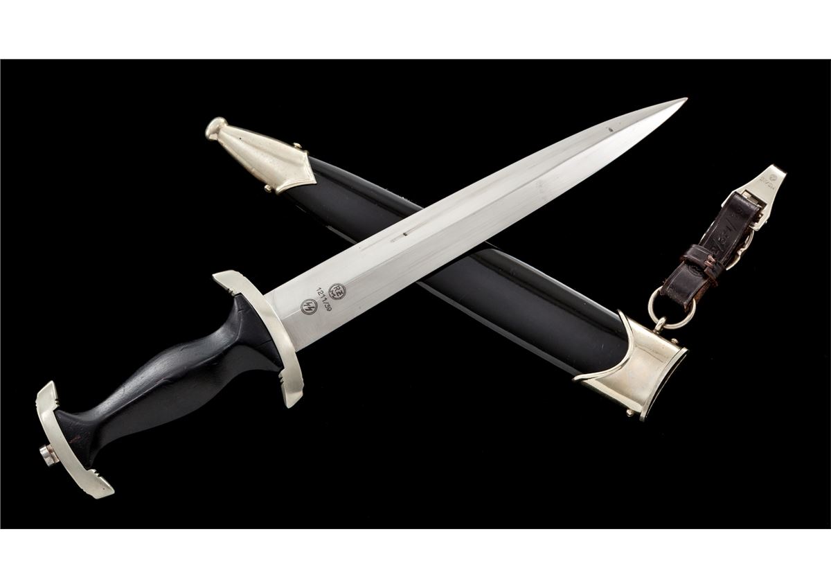 SS Enlisted Man's Dagger, by E. Pack & Sohn, 8-3/4'' blade, 13-5/8'' overall, with standard ''Meine Ehre Heipt Treue'' motto; reverse of blade marked ''RZM 1211/39'' over ''Runes''. Black stained wooden handle with eagle and runes affixed. Black lacquered scabbard with nickeled throat and chape. Clip marked ''M5/25''; strap marked ''RZM/L2/371/39''. Condition is about fine showing micro-scratching near crossguard and light runner lines to blade. Small fissure to reverse of grip from general shrinkage and age. Scabbard is mostly pristine with very light micro-scratching, and one minor scratch to backside near center. Est.: $2,000-$3,000.