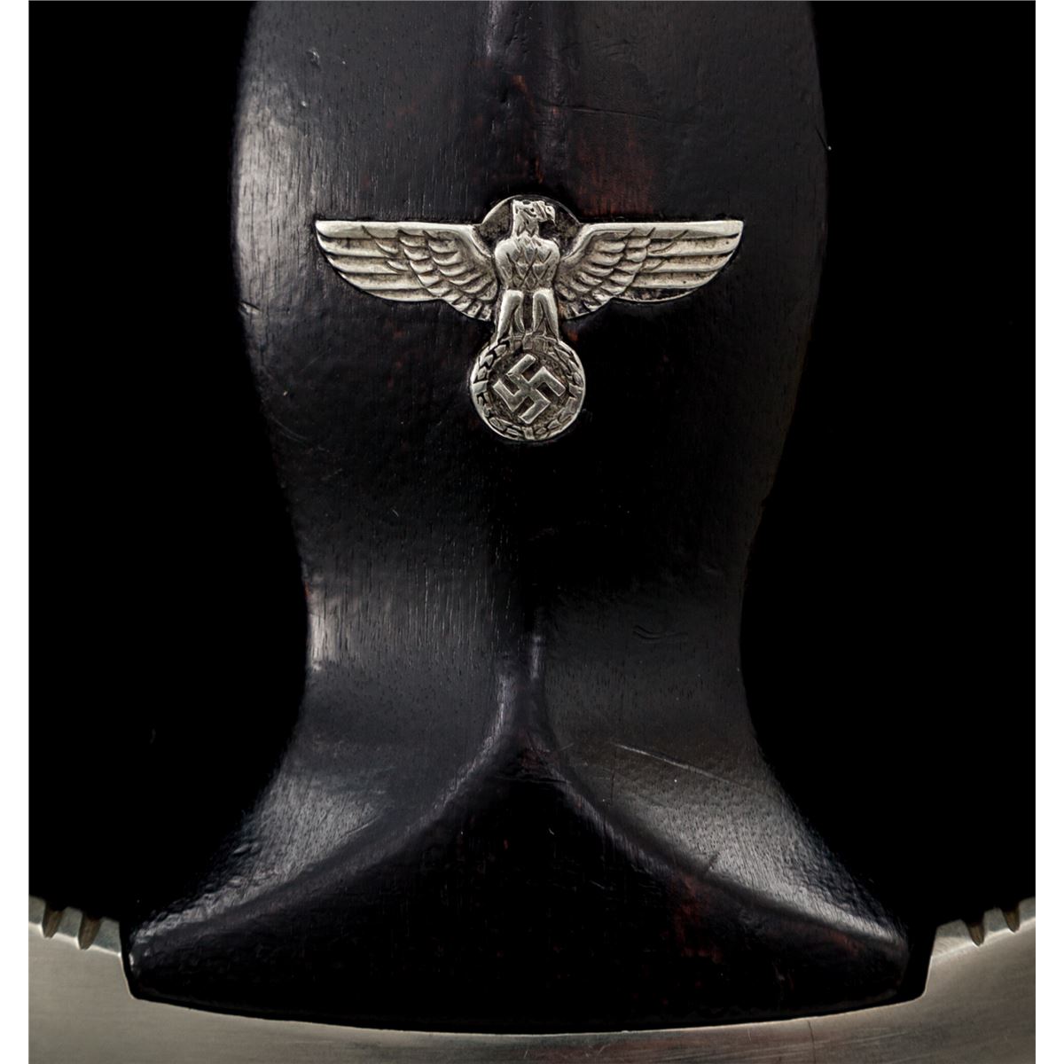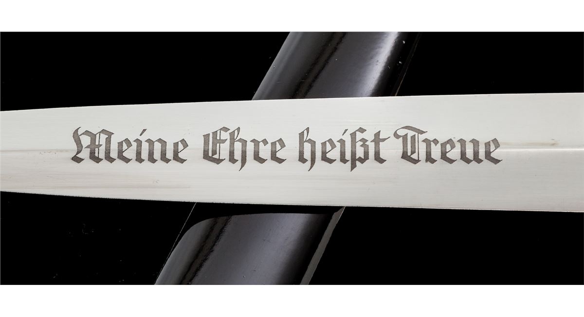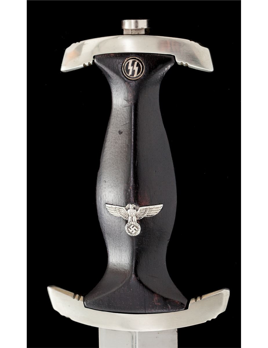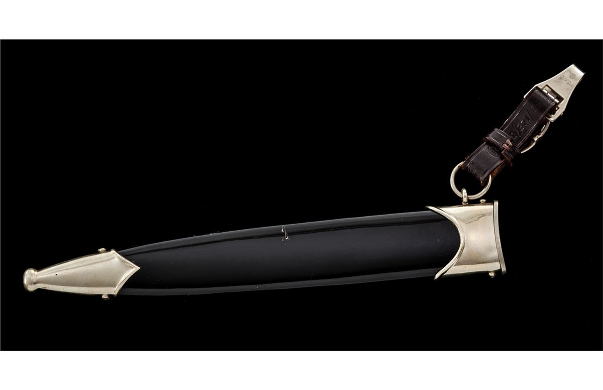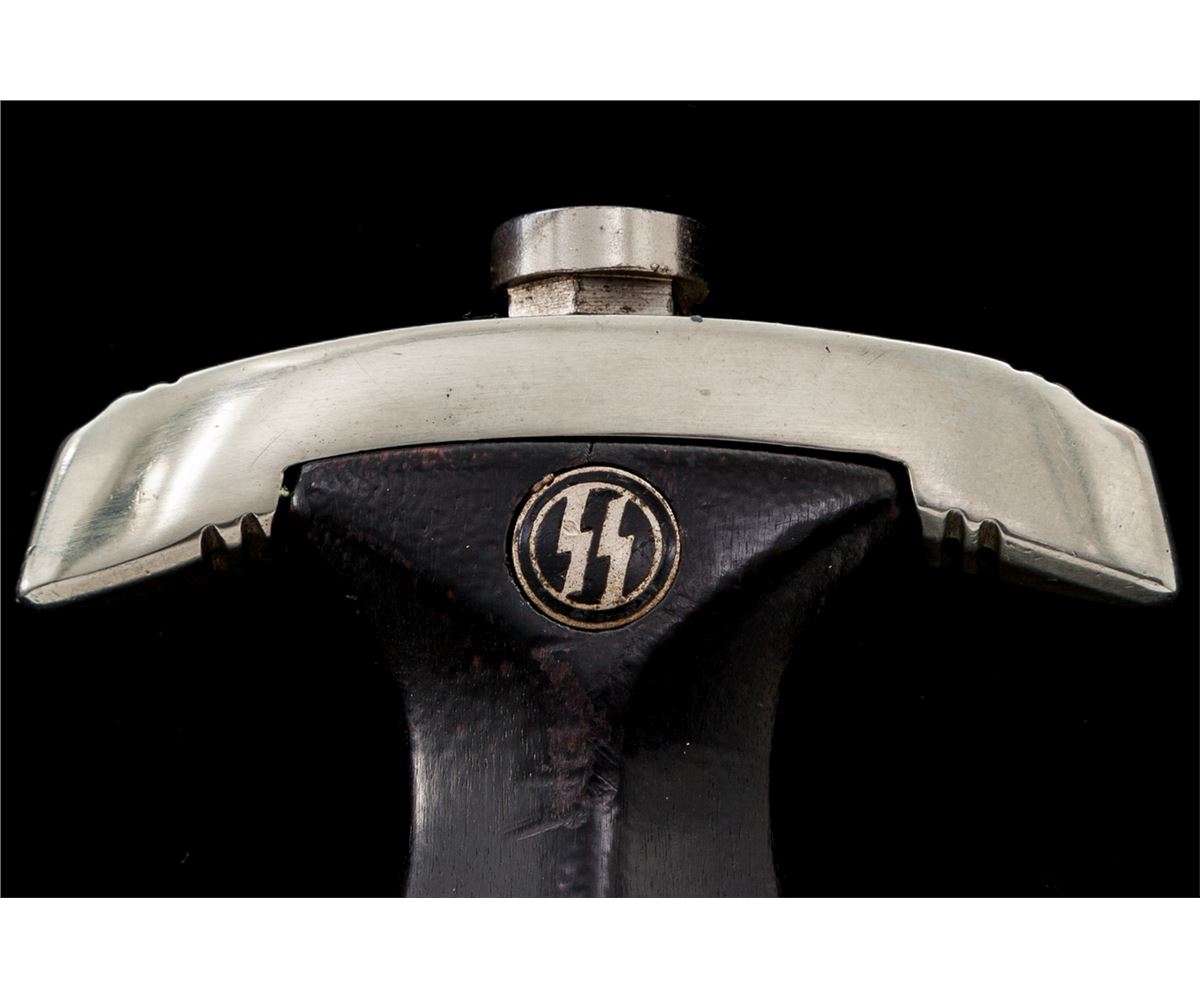 SS Enlisted Man's Dagger, by E. Pack & Sohn, 8-3/4'' blade, 13-5/8'' overall, with standard ''Meine Ehre Heipt Treue'' motto; reverse of blade marked ''RZM 1211/39'' over ''Runes''. Black stained wooden handle with eagle and runes affixed. Black lacquered scabbard with nickeled throat and chape. Clip marked ''M5/25''; strap marked ''RZM/L2/371/39''. Condition is about fine showing micro-scratching near crossguard and light runner lines to blade. Small fissure to reverse of grip from general shrinkage and age. Scabbard is mostly pristine with very light micro-scratching, and one minor scratch to backside near center. Est.: $2,000-$3,000.
