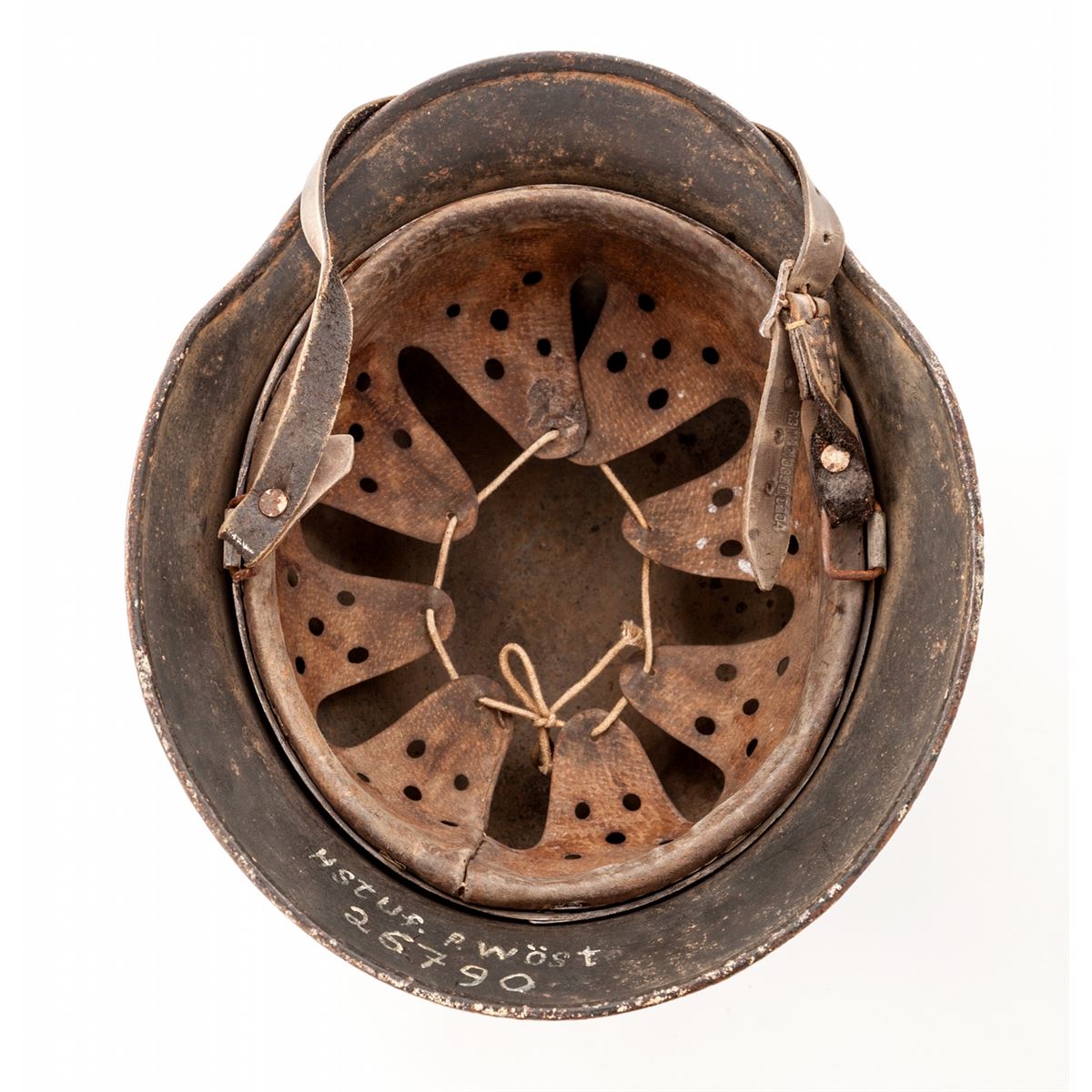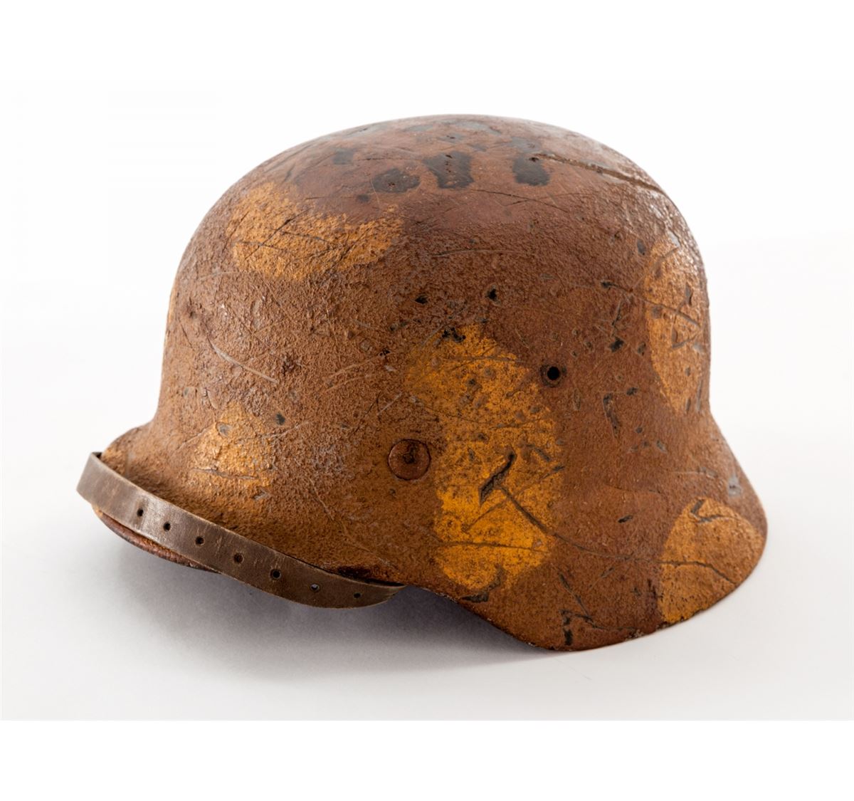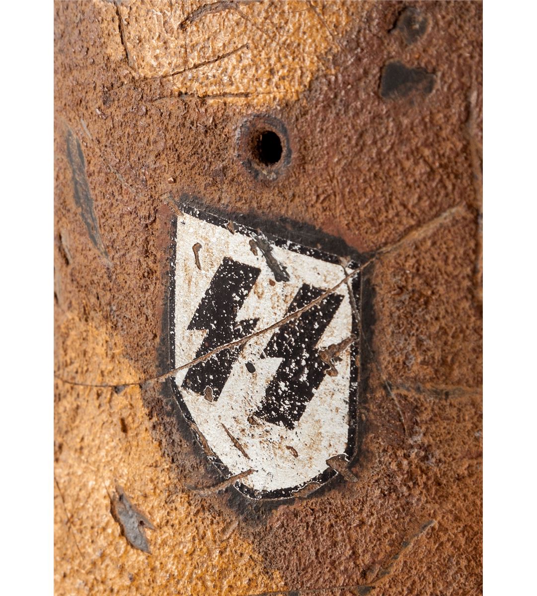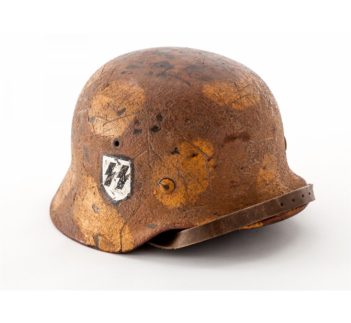 WWII German M40 Helmet, with SS decal and desert type camouflage; liner and chinstrap intact, as well as soldier's name and ID number inside rear portion of brim. Condition is very good with thick yellow and tan paint in a semi-giraffe pattern. Decal shows high metallic content and very narrow border. Est.: $800-$1,200.