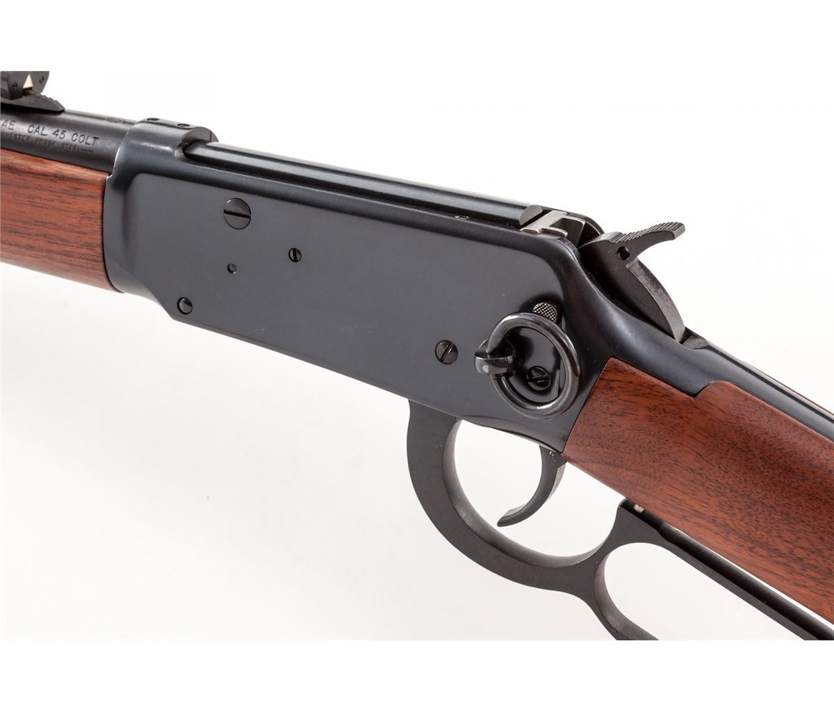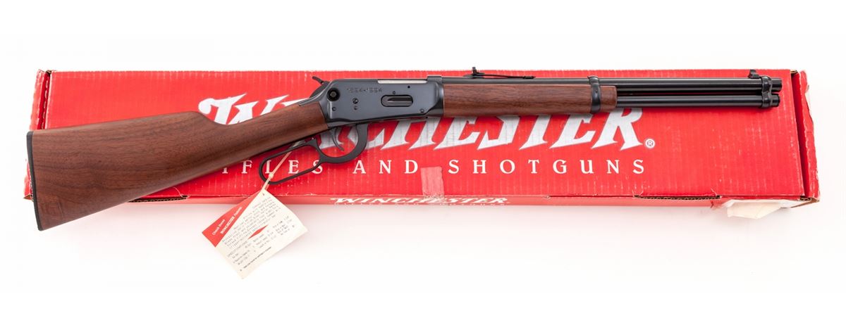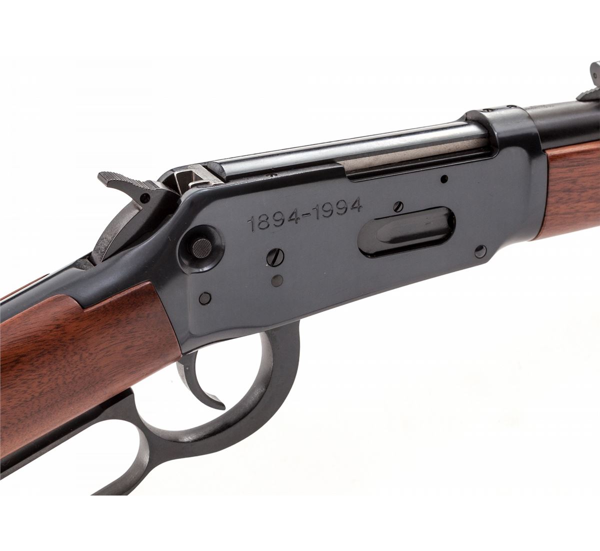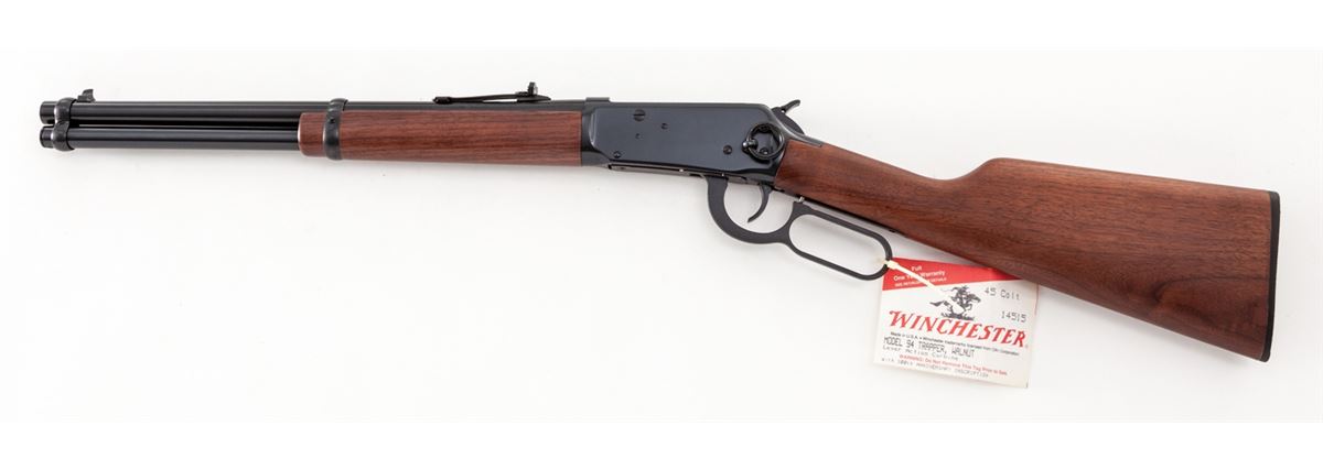 Winchester Model 94AE SRC 100th Anniversary Lever Action Rifle, #6158224, .45 Colt cal., 16'' barrel, blue finish, receiver marked ''1894-1994'', smooth walnut stock and forend, Winchester hard rubber buttplate, crossbolt safety, adjustable semi-buckhorn rear sight, dovetailed front sight, in original box with matching end label and owner's manual. Condition is excellent and as new, with very few faint marks from handling. Box with moderate damage. Est.: $600-$800. (Modern)
