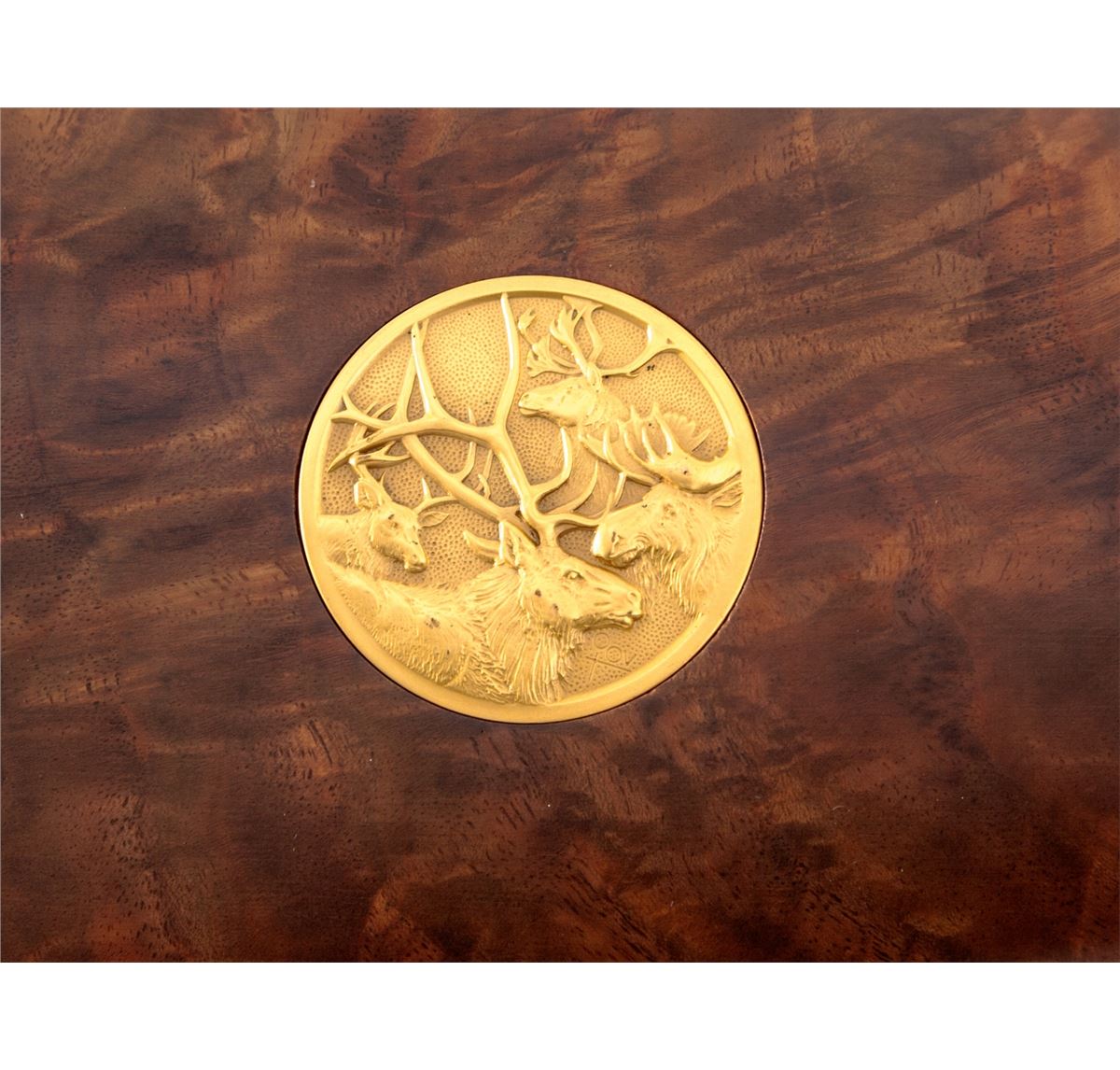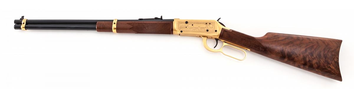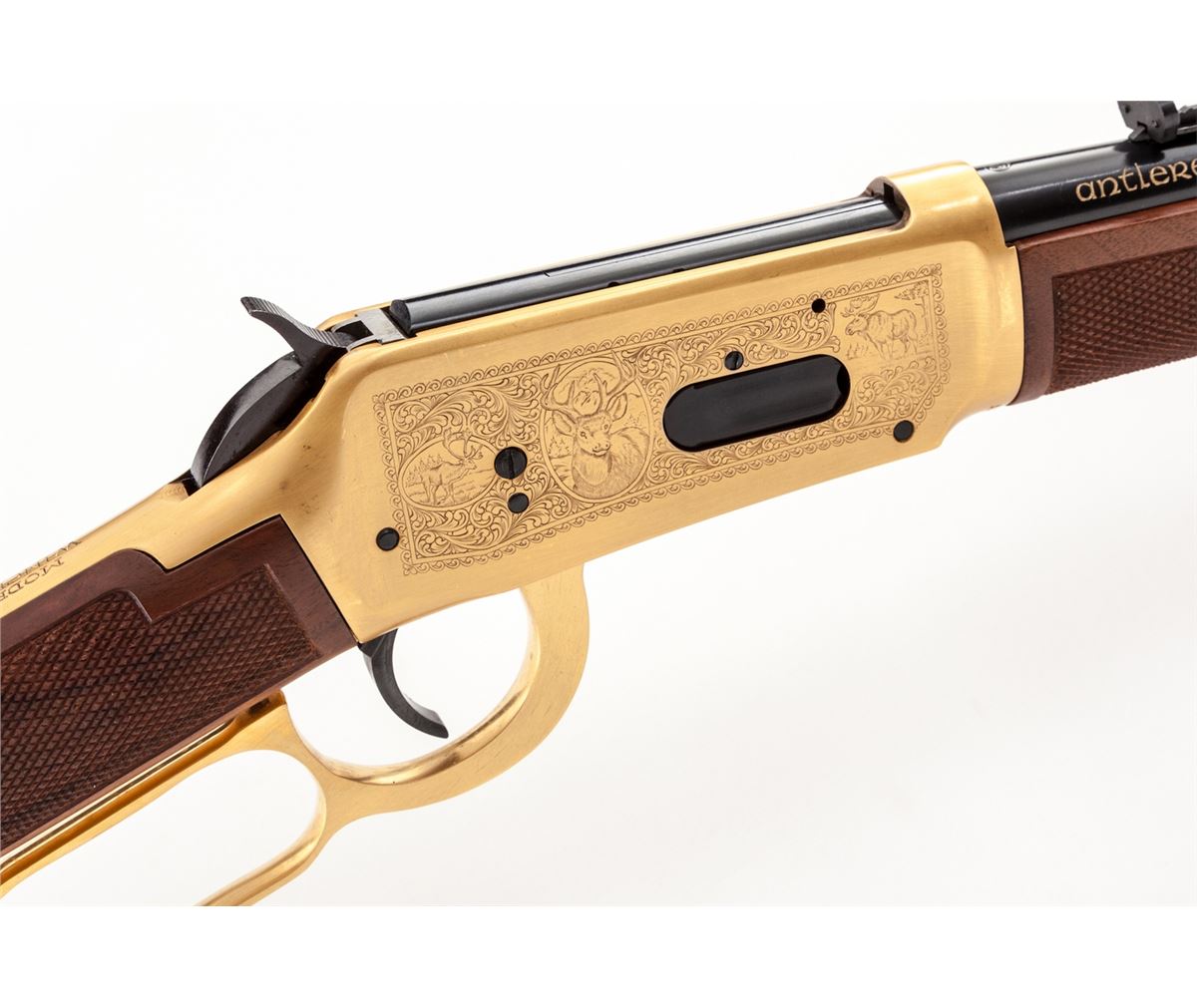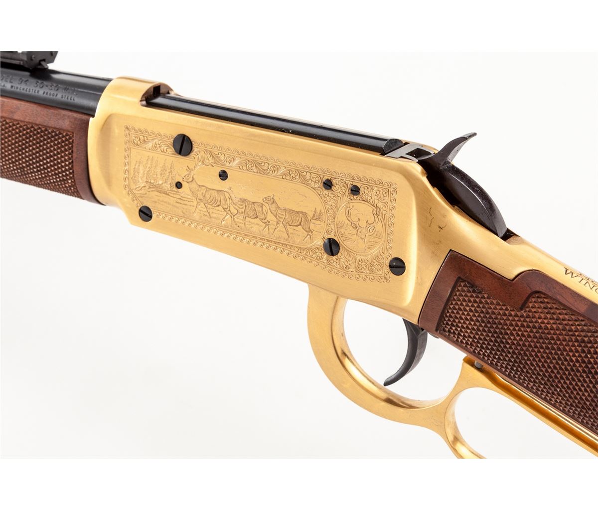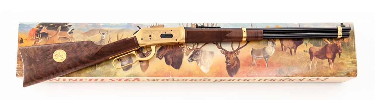 Winchester Model 1894 Antlered Game Commemorative Lever Action Rifle, #AG17691, .30-30 cal., 20'' blue barrel, satin finish, American walnut stock with deep-cut checkering. This commemorative features an extended forend, straight checkered grip, with wraparound blue buttplate. Round barrel is engraved with ''Antlered Game'' in gold letters. The antiqued gold-plated receiver features roll engraving finish to both sides with pictures featuring images of North America's antlered game animals and scrollwork. Dating from the late 1970s. Condition is excellent, in its original box with slipcover. Slipcover is in very good condition with minor scuffs and light sun fading. Est.: $750-$1,000. (Modern)