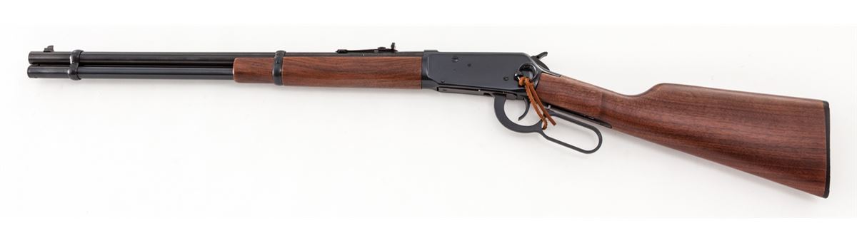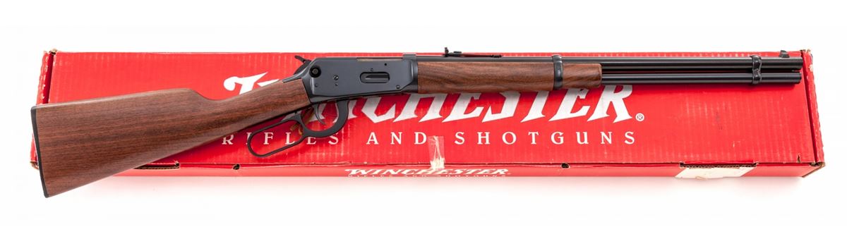 Winchester Model 94AE Trails End SRC Lever Action Rifle, #6243078, .45 Colt cal., 20'' barrel, blue finish, smooth walnut stock and forend, Winchester hard rubber buttplate, crossbolt safety, adjustable semi-buckhorn rear sight, dovetailed front sight, in original box with matching end label and owner's manual. Condition is excellent and as new, with very few faint marks from handling. Est.: $600-$800. (Modern)