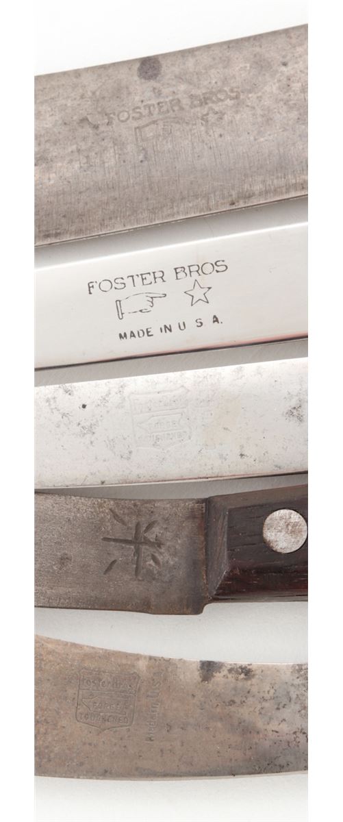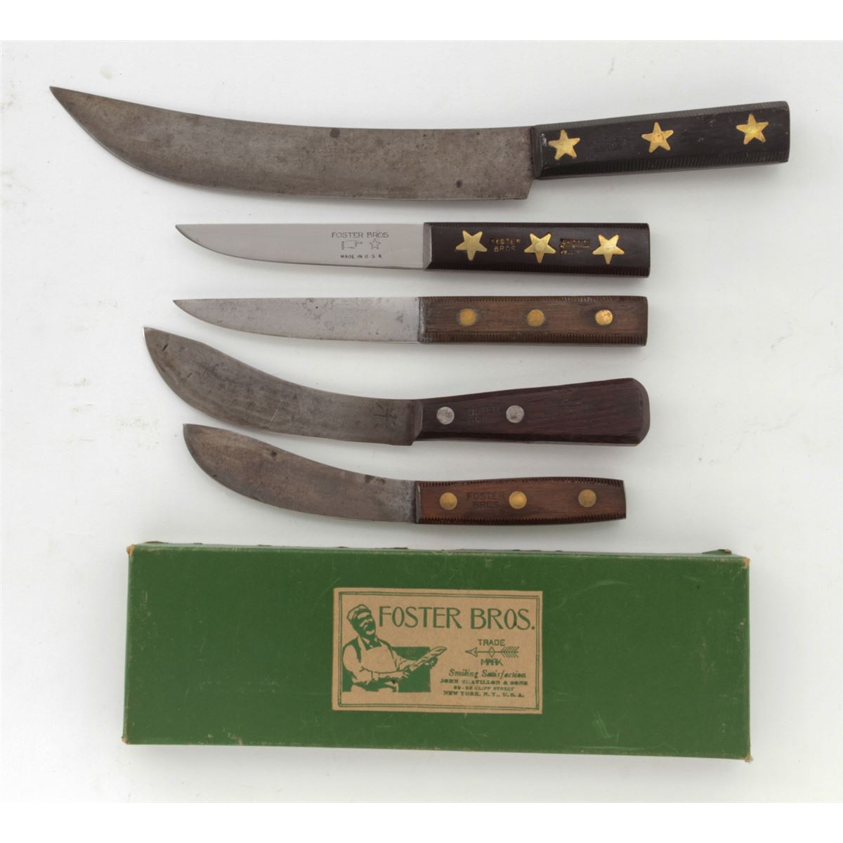 Lot of Five (5) Antique Foster Bros. Knives and one (1) box: 1.&2.) ''Gold Star'' butcher's knives, 5'' and 10'' long blades, wood handles with brass inlaid stars. 3.) ''Green Line'' skinning knife, 5-3/4'' blade, 10-1/4'' overall length. 4.&5.) ''Forge Toughened'' skinning/butcher's knives, 4-3/4'' & 5'' blades, with ribbed hickory handles. 6.) Green Foster Bros. boning knife box which originally held 6 knives #31E. With Foster Bros. top label, end label, and remnants of the original Foster Bros. sealing tape. Conditions range from very good to fine overall. Knives show varying amounts of age and use, including additional sharpening and some with moderate patination. Box with very light scuffs and scratches and clear labels; corners remain tight. Est.: $250-$350/lot.
