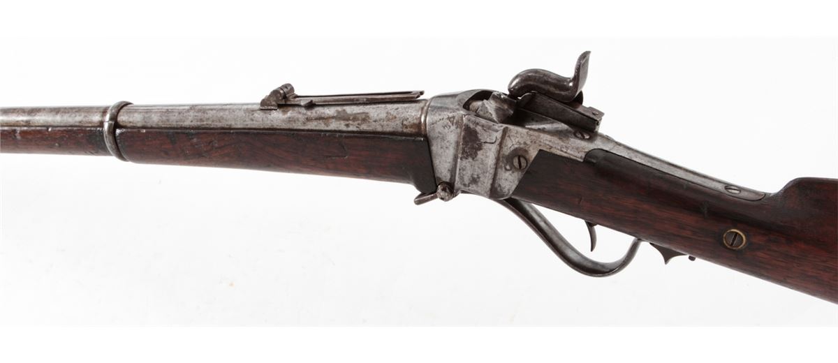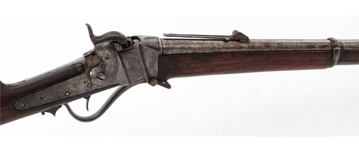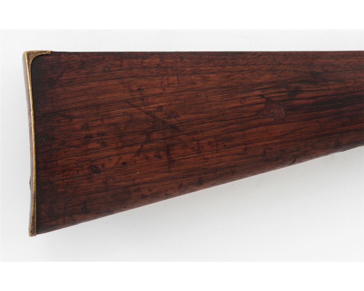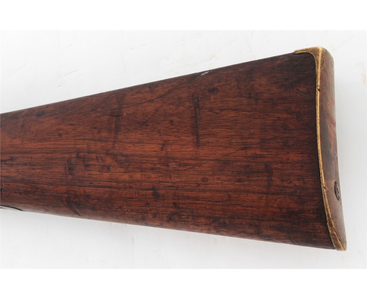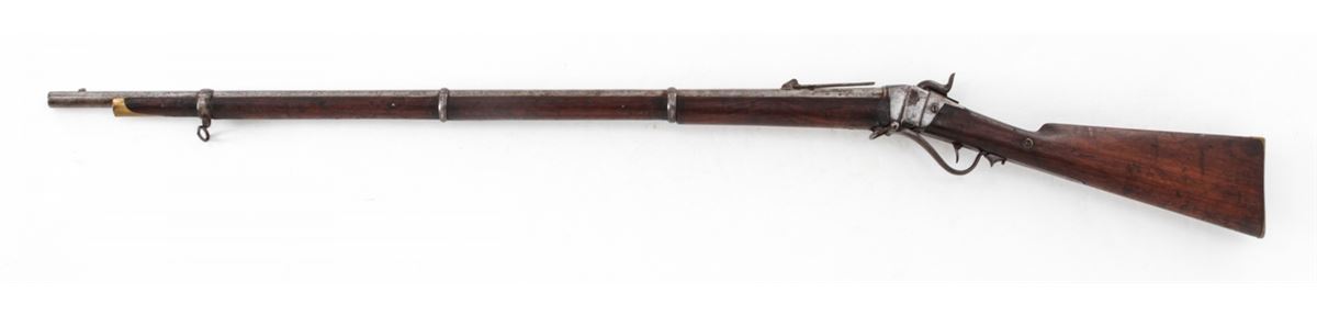 Nepalese Copy of Sharps Three-Banded Musket, NVSN, .52 cal., 40'' barrel, finished in the white, walnut stock and forend, three iron bands, brass buttplate and forend cap, with long-range rear sight and somewhat standard appearing front sight. Condition is very good with moderate general patination overall. Scuffs, scratches and oil darkening to wood. Action is good, bore is dark. Est.: $300-$500. (Antique)