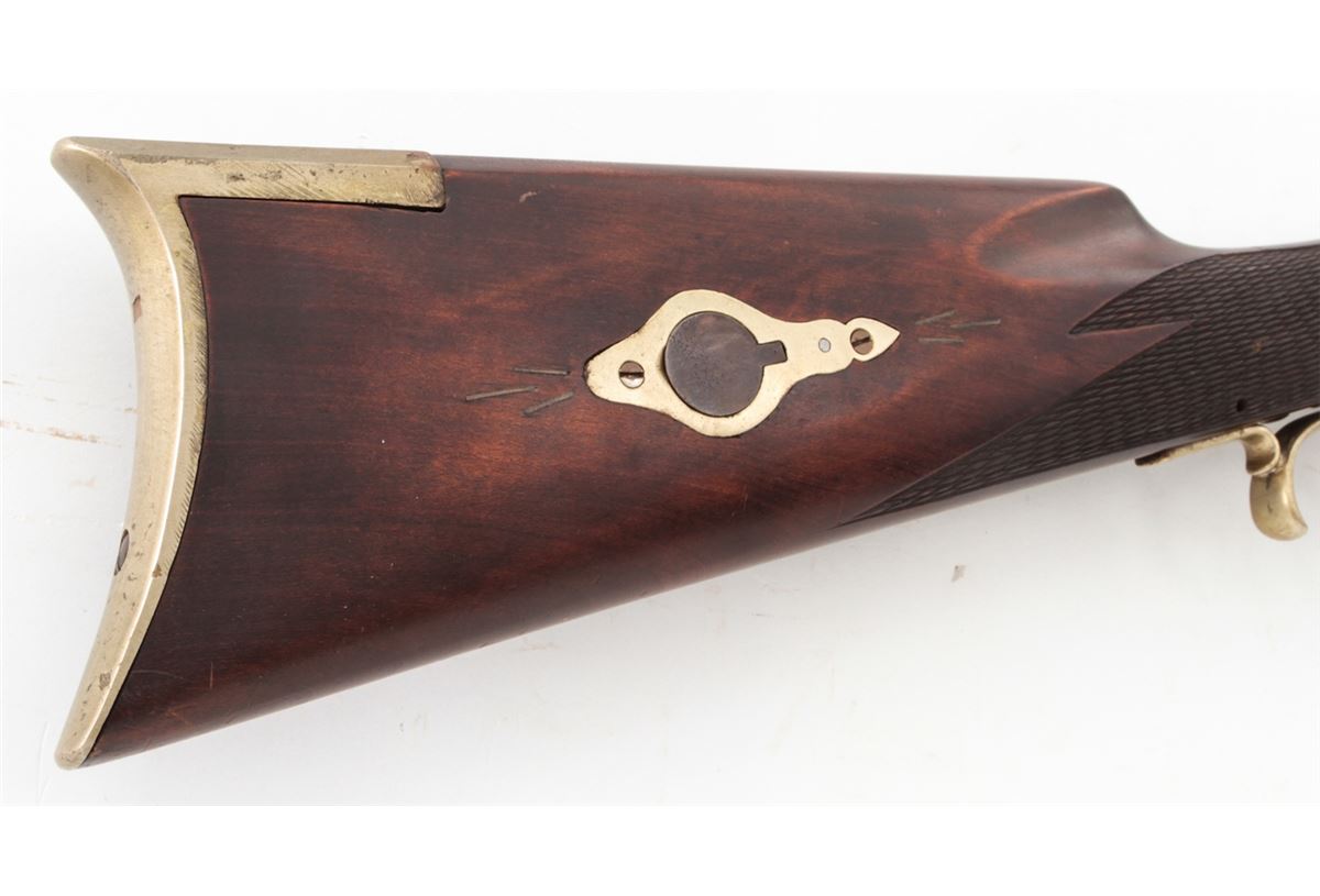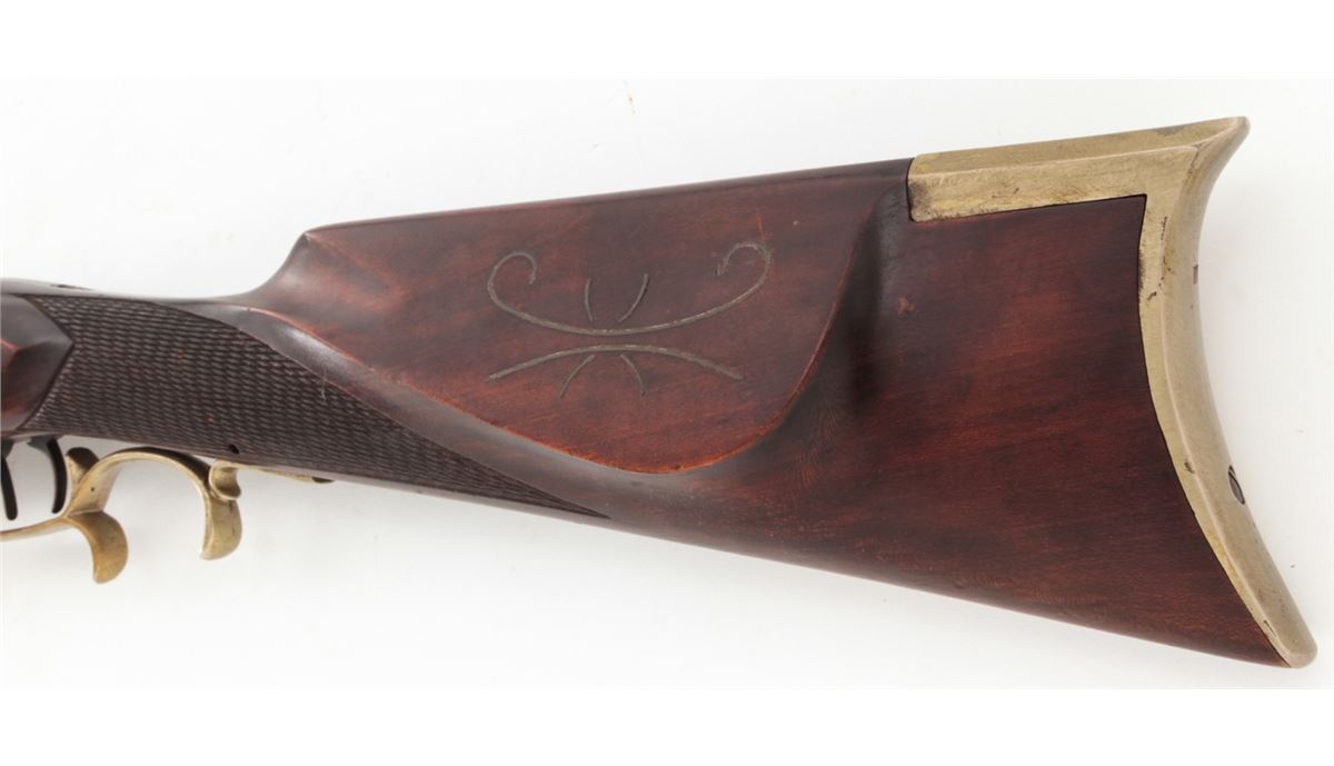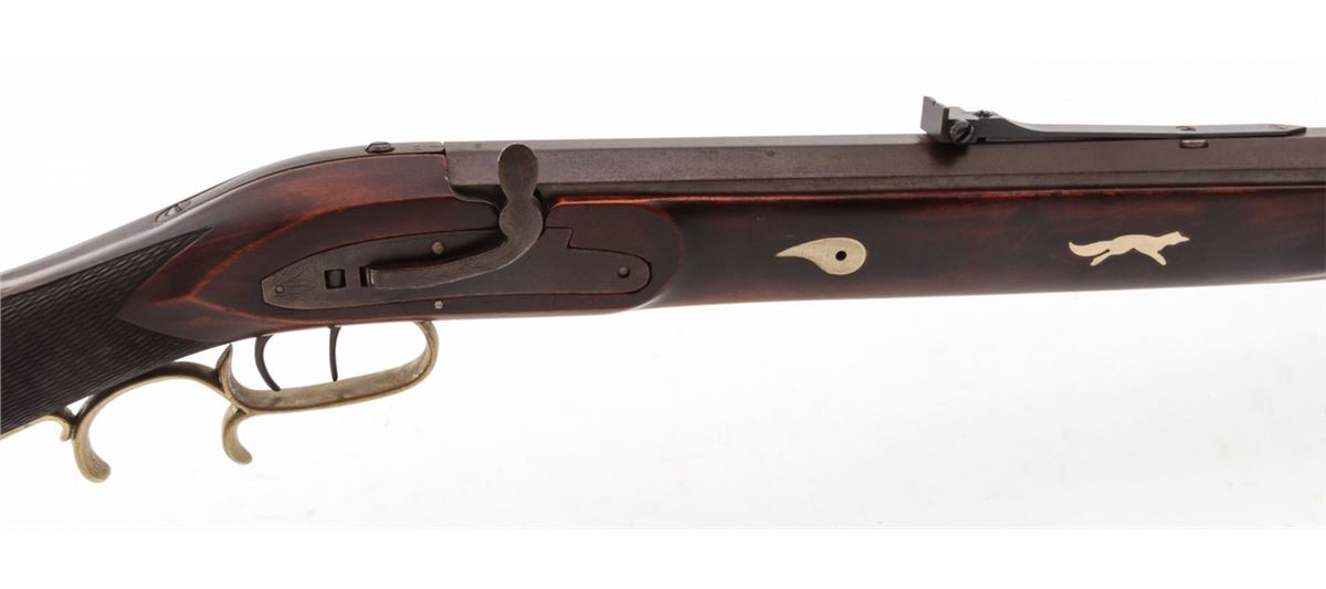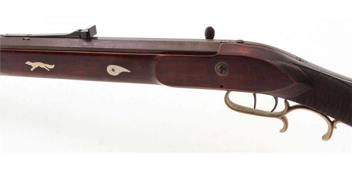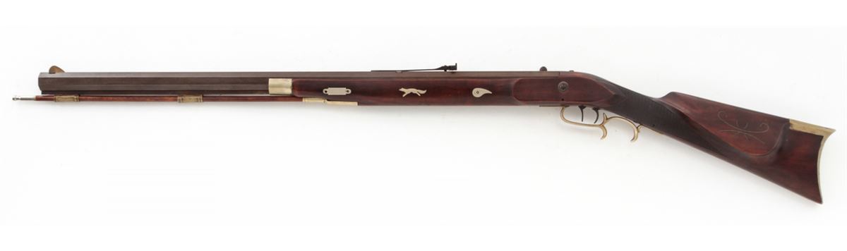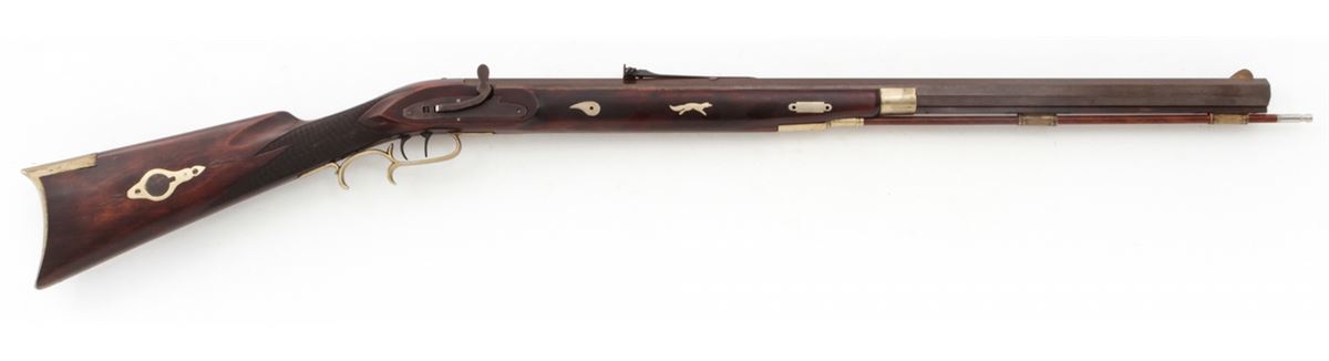 Custom Made Mule Ear Percussion Rifle, #11, .45 ball, 30'' octagonal heavy barrel, dark stained hardwood stock, nickel silver folk designs, double set trigger, brass blade front and adjustable rear sights. Condition is fine to near excellent showing light general marks to stock and needing some final fit and finishing. Est.: $400-$600. (Antique)