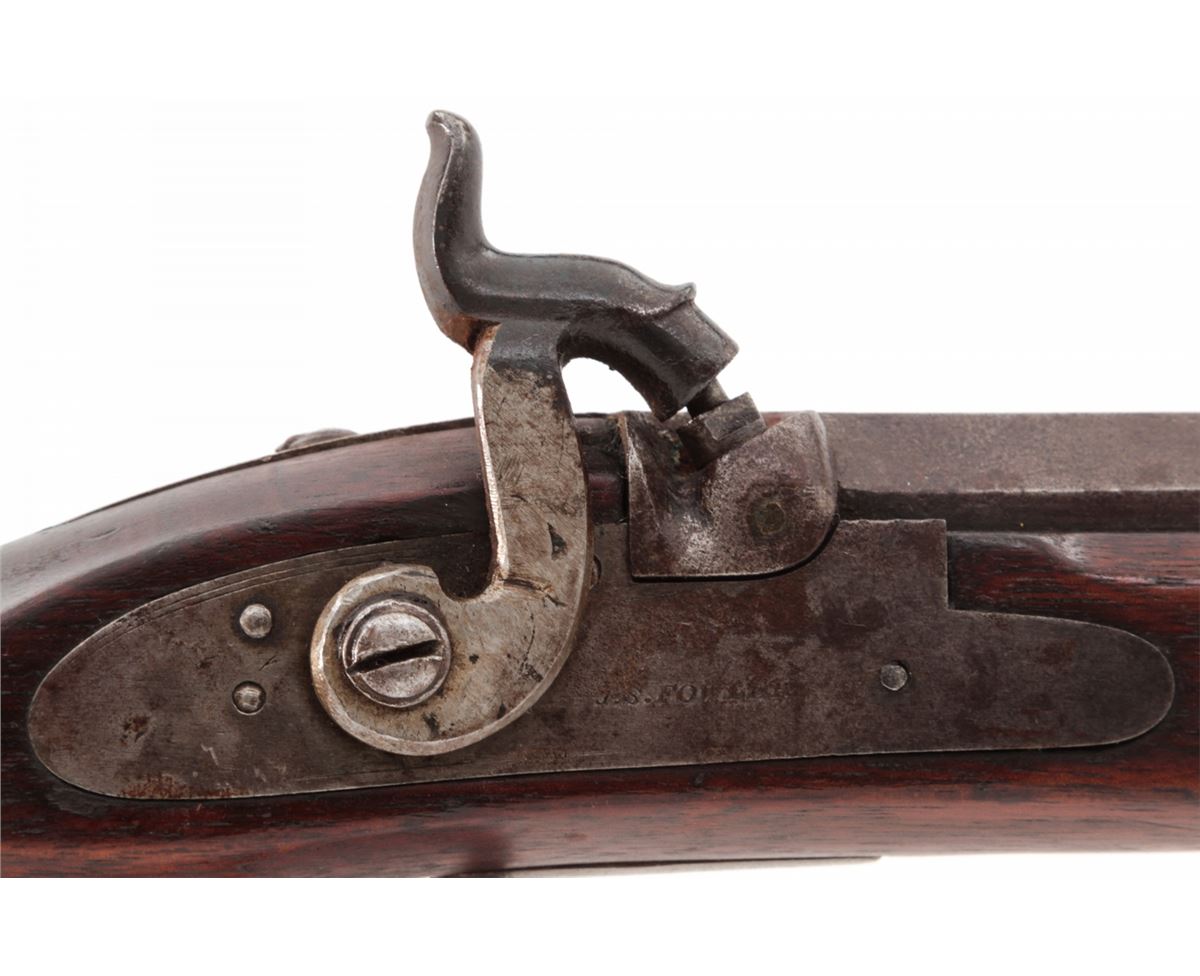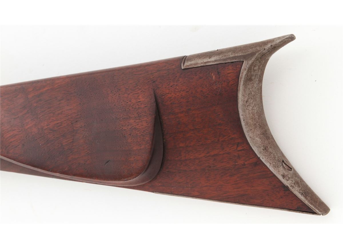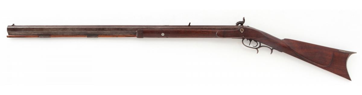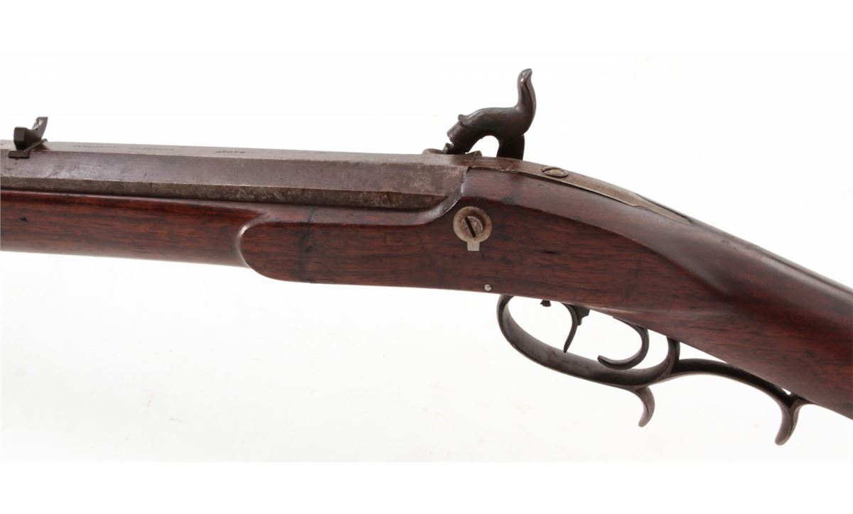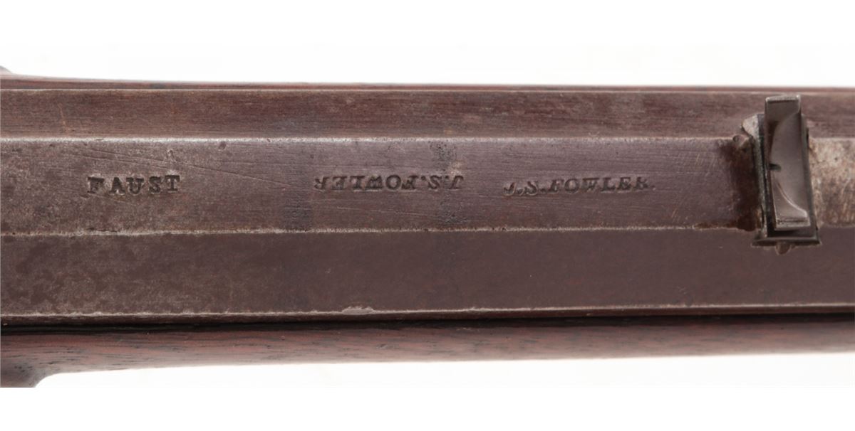 Single Shot Halfstock Percussion Target Rifle, by J.S. Fowler, .40 cal., 32'' heavy octagonal barrel, walnut halfstock with cheekpiece, double set trigger, steel triggerguard and buttplate, with hickory ramrod. Top of barrel additionally marked ''Faust''. Condition is very good. Barrel retains approx. 85% plum colors mixed in with some light erosion near nipple bolster. Stock shows oil darkening and light scuffs. Hammer with old repair. Good set trigger and fair bore. Est.: $450-$600. (Antique)