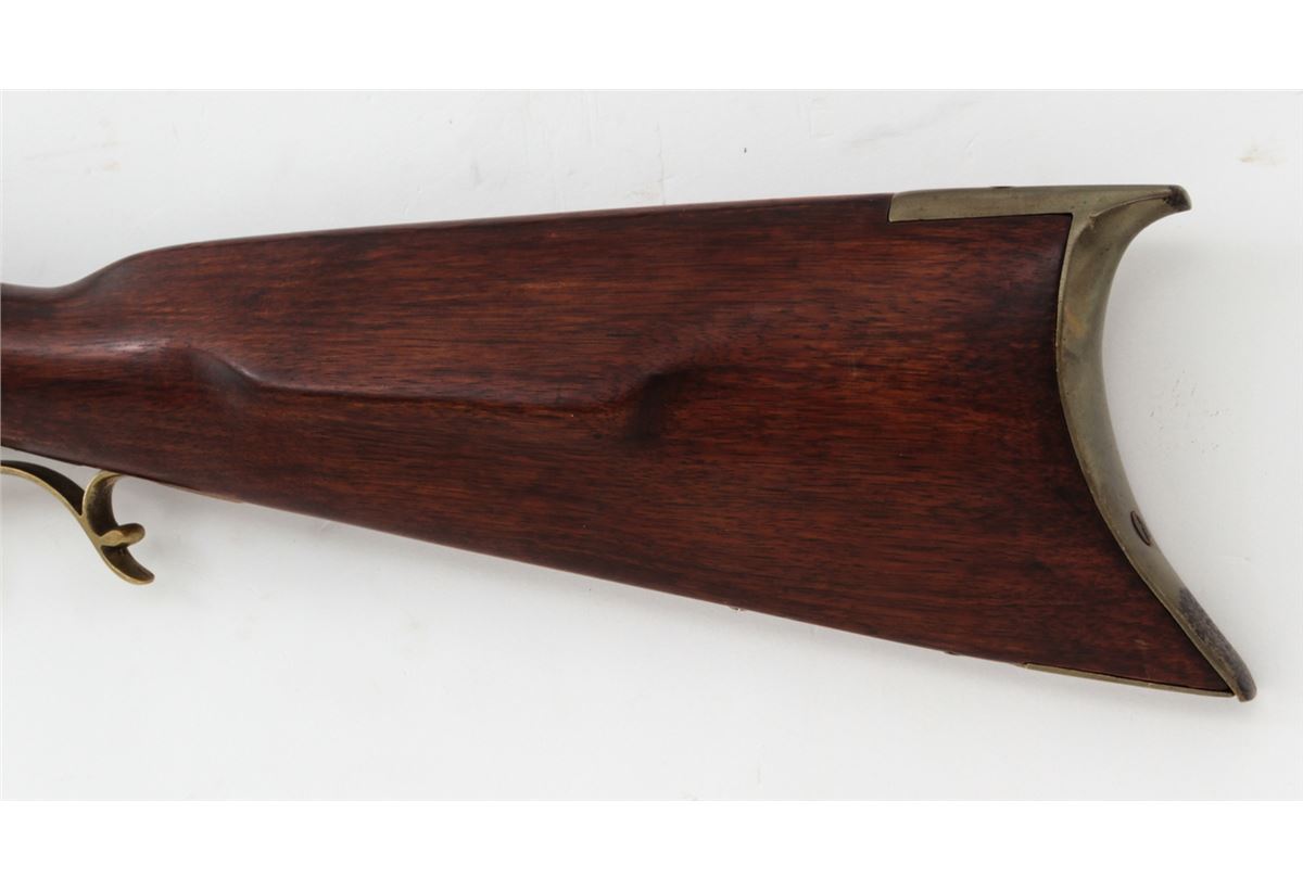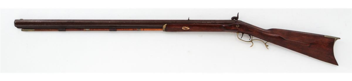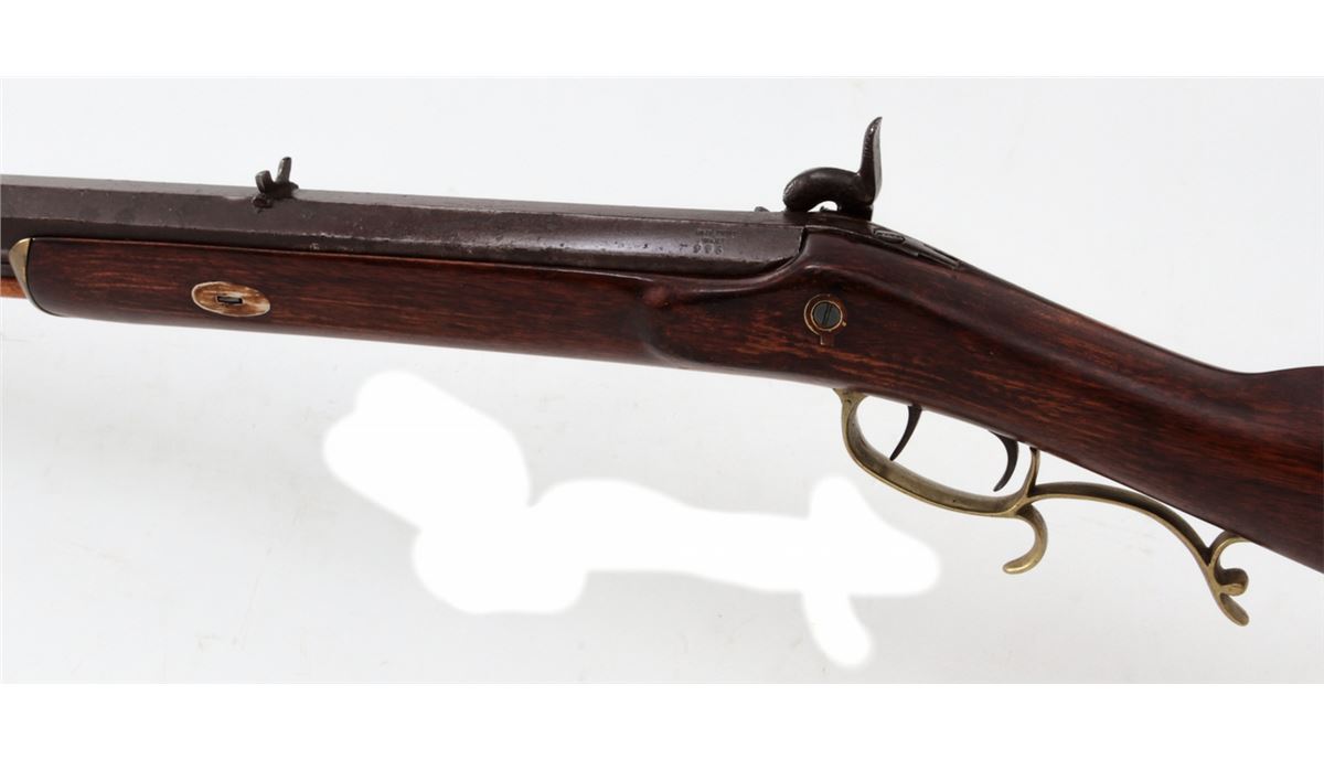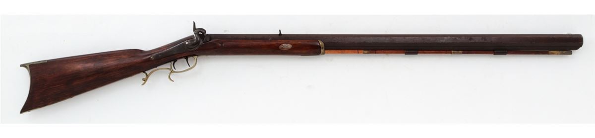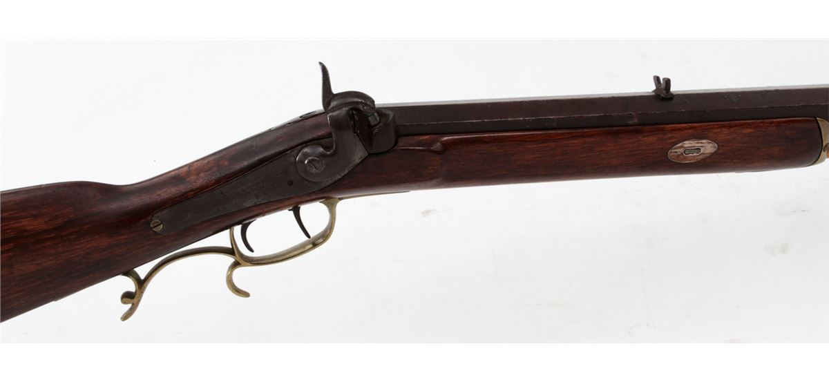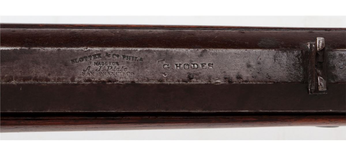 Single Shot Percussion Rifle, by Slotter & Co., Phila., additionally marked ''Made for A.J. Plate, San Francisco'', top barrel flat also marked ''G. Hodes''; left diagonal flat marked at breech ''Gain Twist/Wart/996'', .45 cal., 33'' barrel, backlock marked ''Slotter & Co., Phila'', double set trigger, smooth cheekpiece halfstock with brass forend, triggerguard and buttplate. Condition is very good as probably re-stocked. Metal surfaces with moderate patination to brown finish. Nice working set trigger, fair bore. Est.: $1,500-$2,000. (Antique)