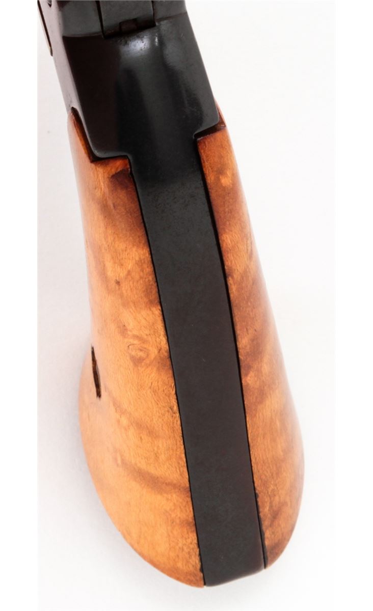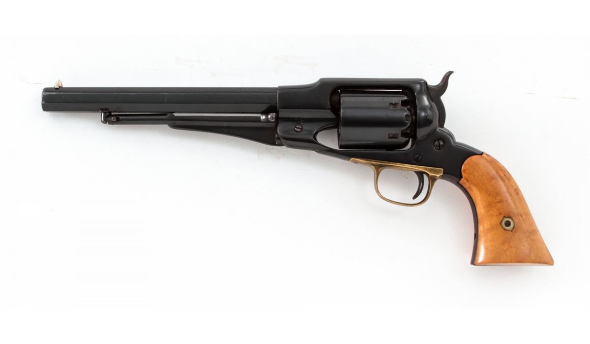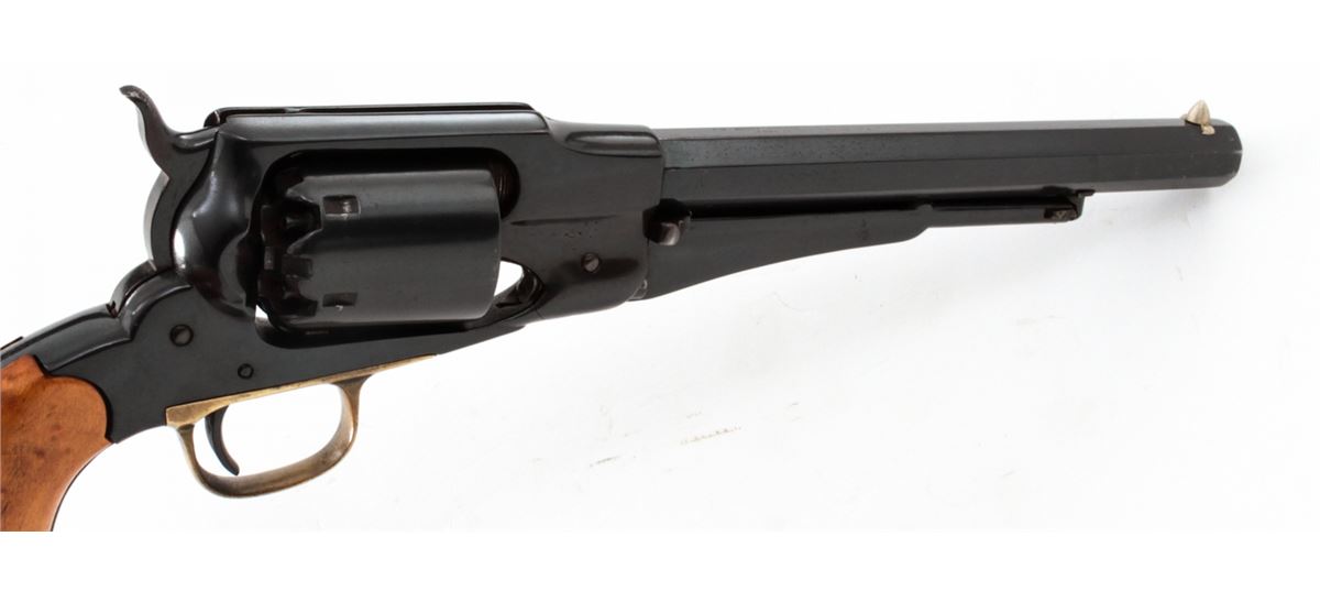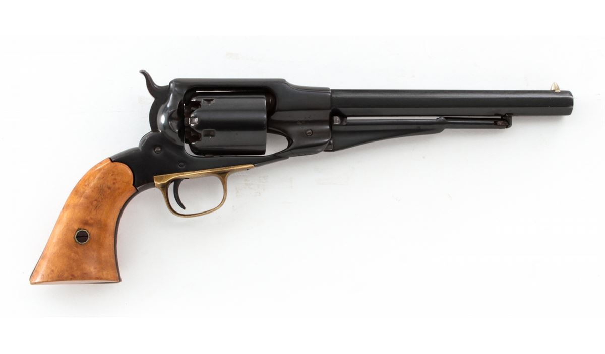 Remington New Model Army Percussion Revolver, #8169, .44 cal., 8'' barrel, blue finish, brass triggerguard, maple grips. Condition is very good as refinished with thinning to barrel nomenclature, and a small hairline crack to right forward portion of frame. Newly-made grips fit well with nice grain. Action is good, bore is fair. Est.: $400-$500. (Antique)