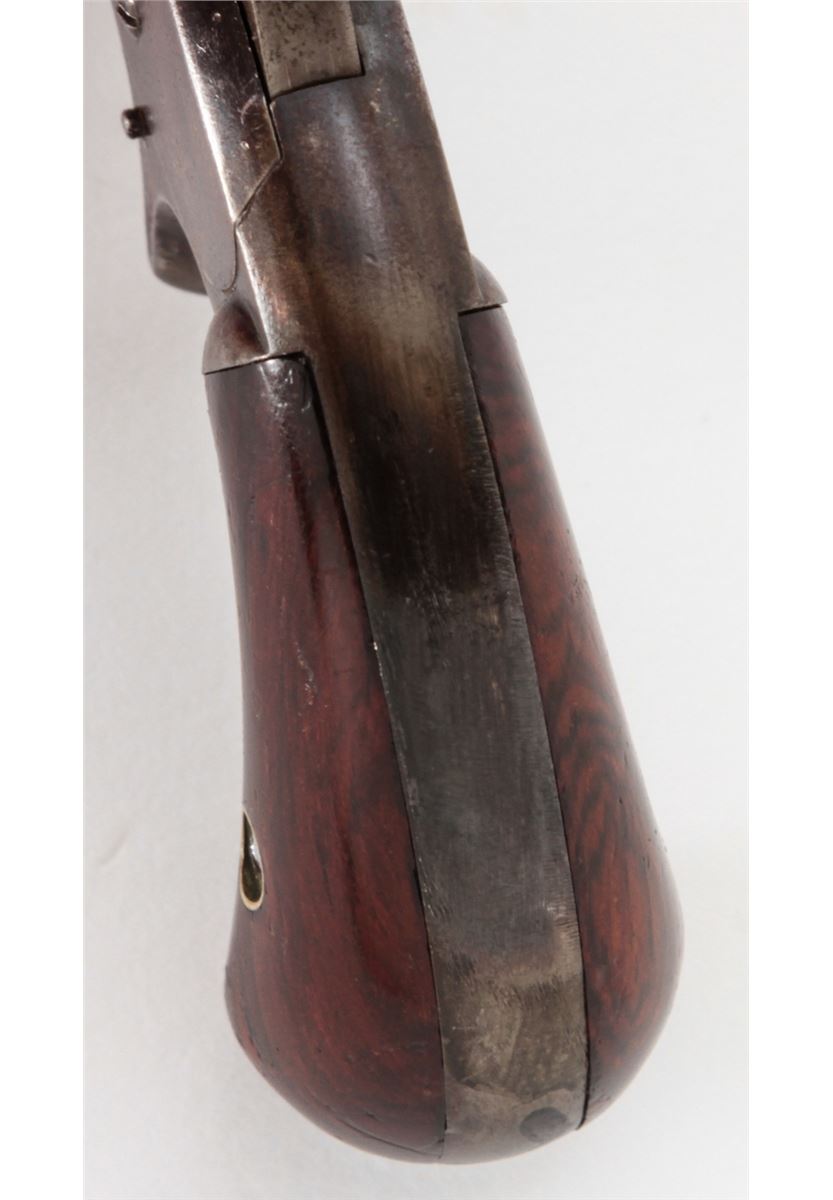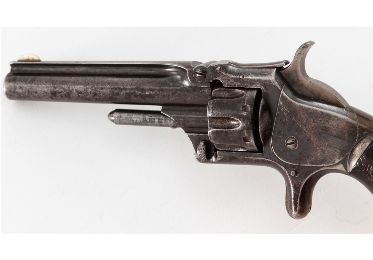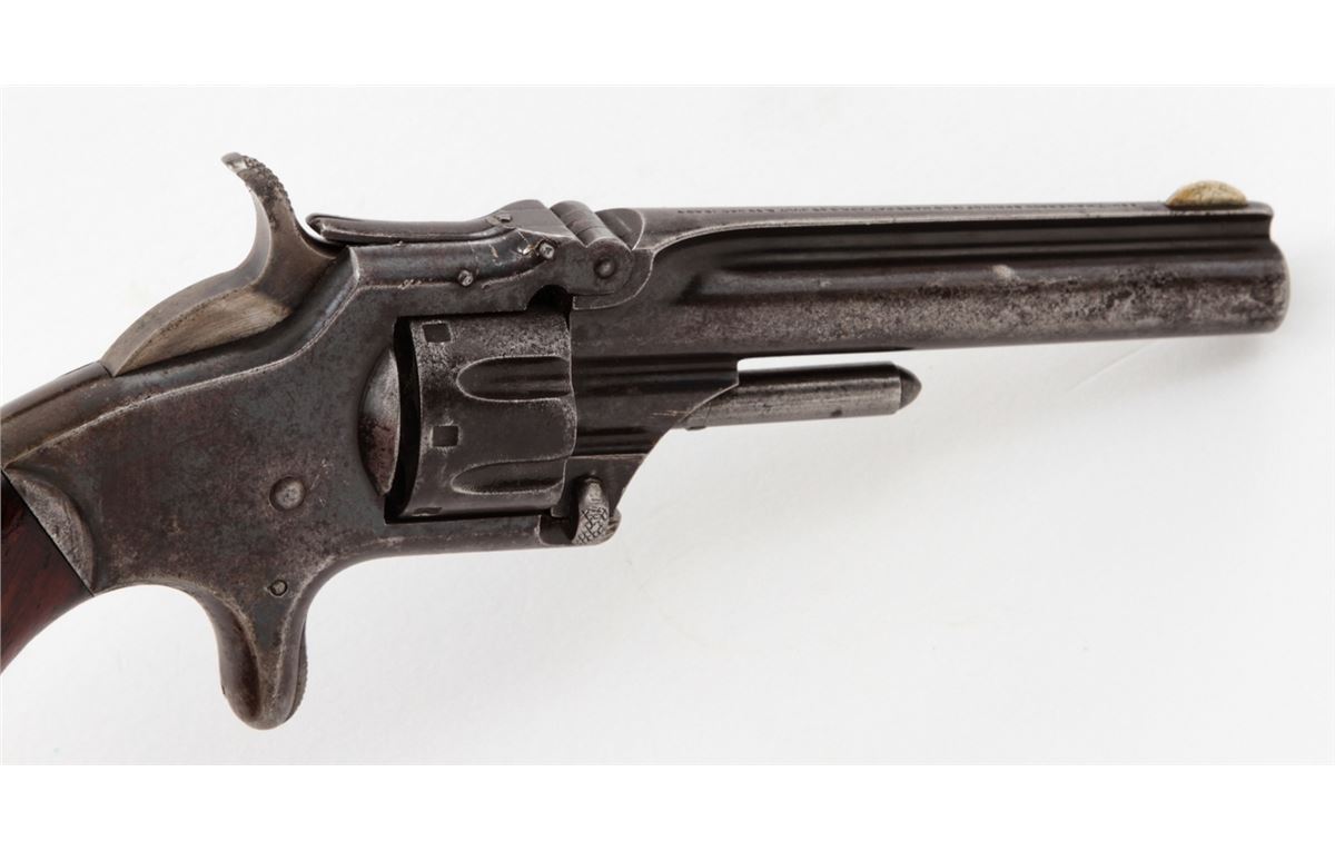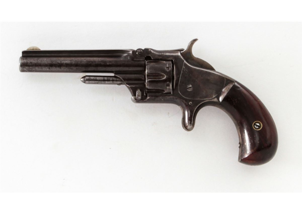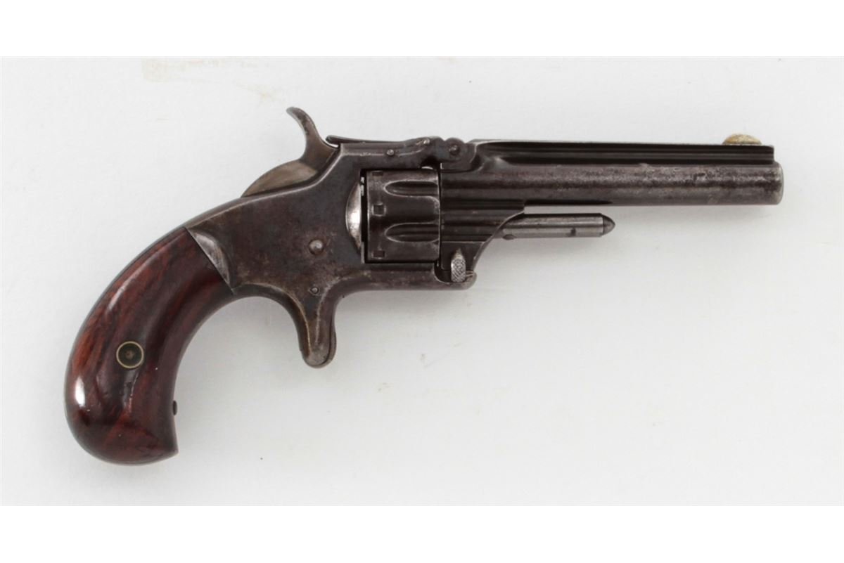 Smith & Wesson Model No. 1 3rd Issue Revolver, #89499, .22 Short RF cal., 3-3/16'' barrel, blue finish, rosewood bird's head grips. Condition is very good retaining approx. 70% blue with light corrosion. Grips show losses to varnish to left panel with minor scuffs and scratches. Good action, fair bore. Est.: $200-$400. (Antique)
