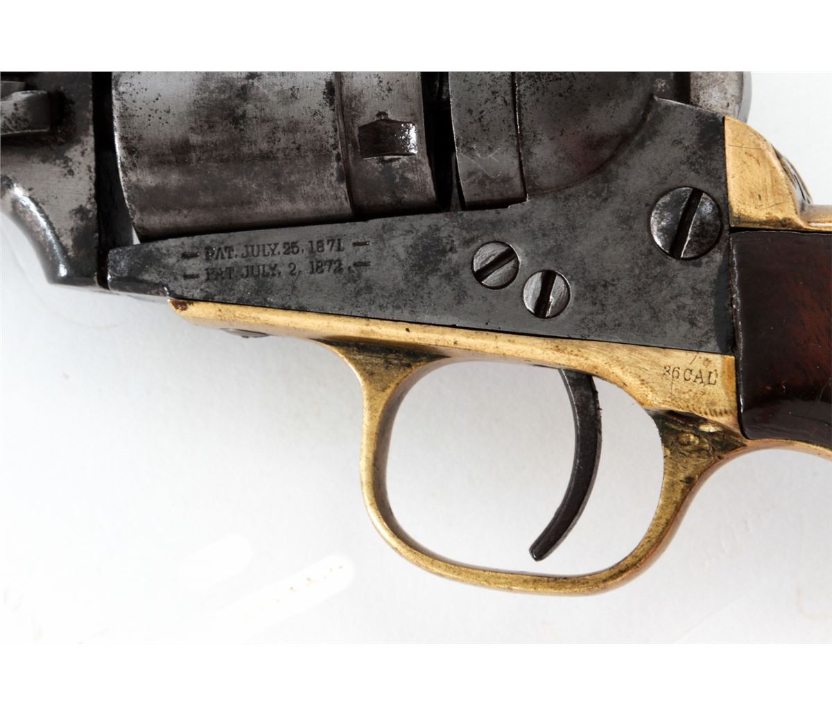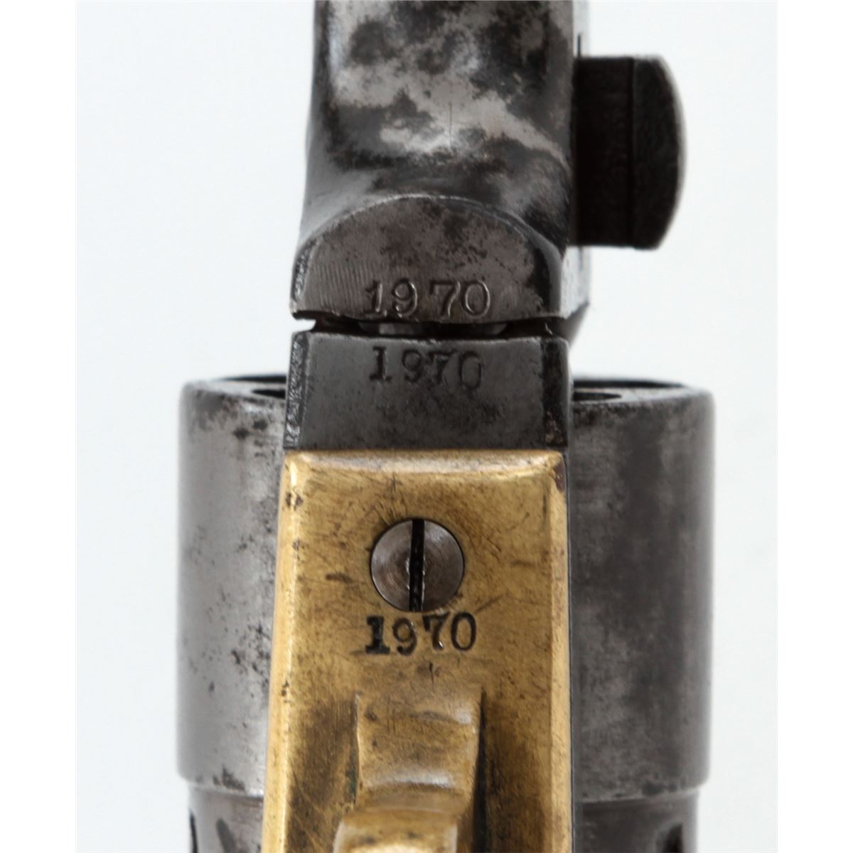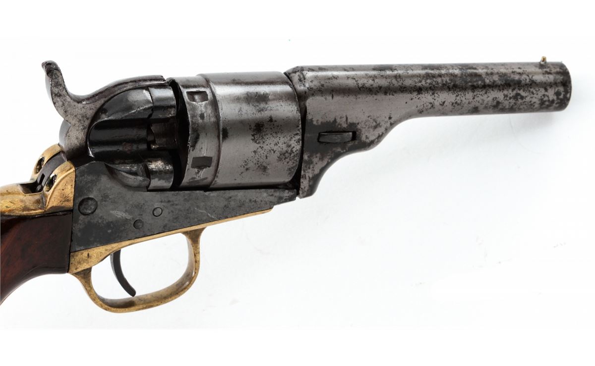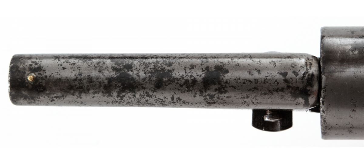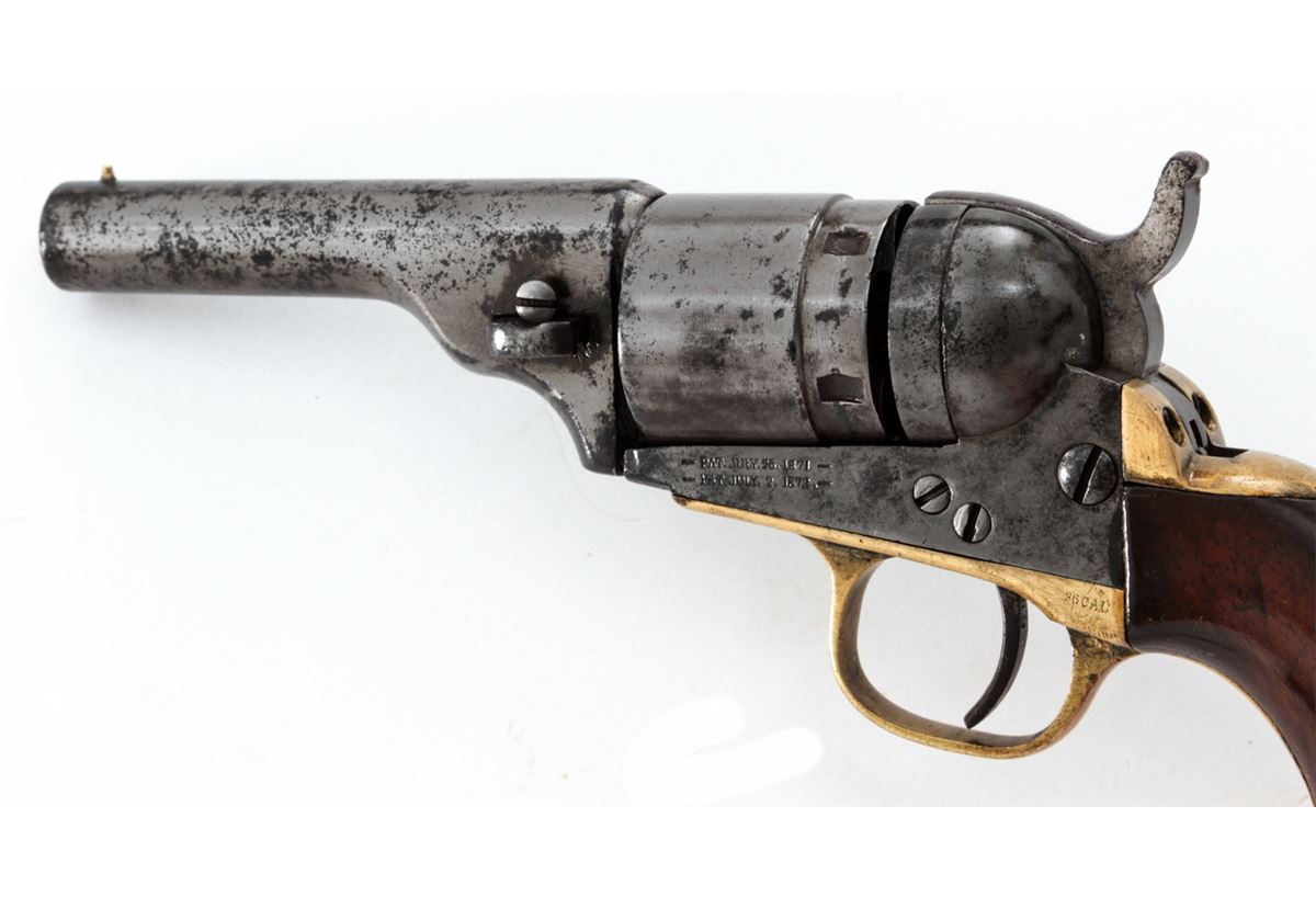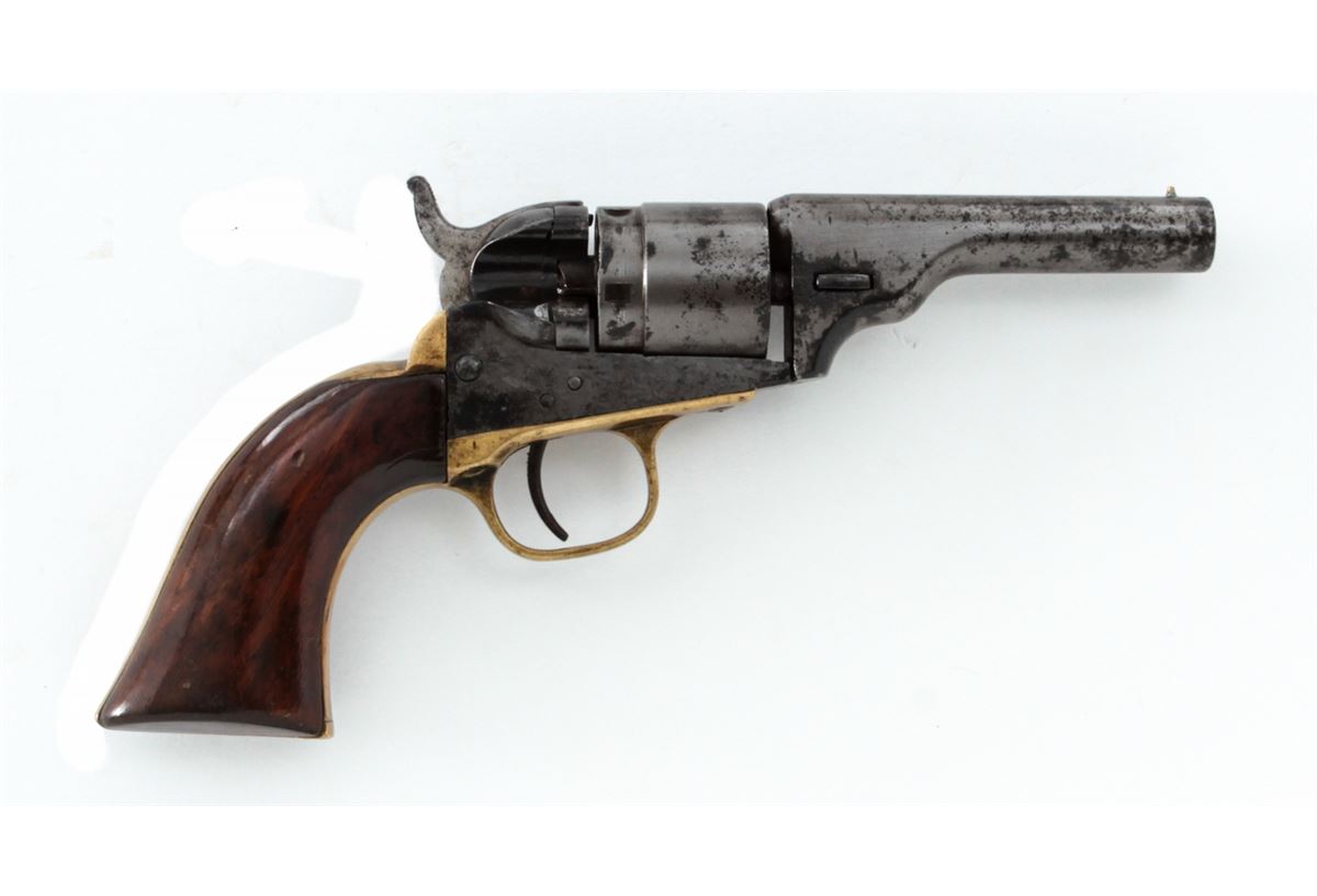 Colt New Model Pocket Breechloading Revolver, #1970, .38 RF cal., 3-1/2'' barrel, originally with blue and case hardened finish, brass backstrap and triggerguard, varnished walnut grips. Referred to by collectors as a Type 5 Solid Barrel variation. Condition is good with little original finish and even general patination. Grips with additional coat of varnish. Good functioning action, fair bore. Est.: $350-$500. (Antique)