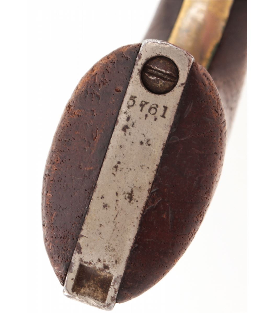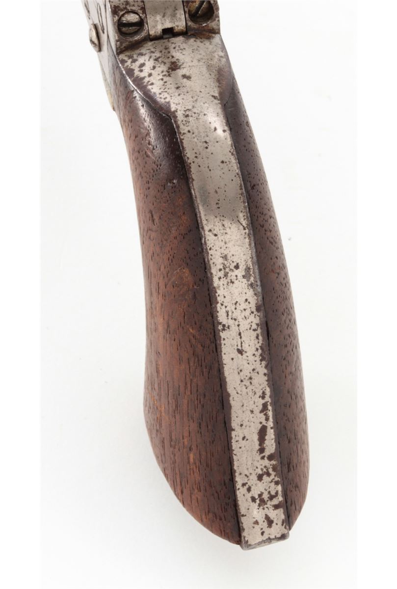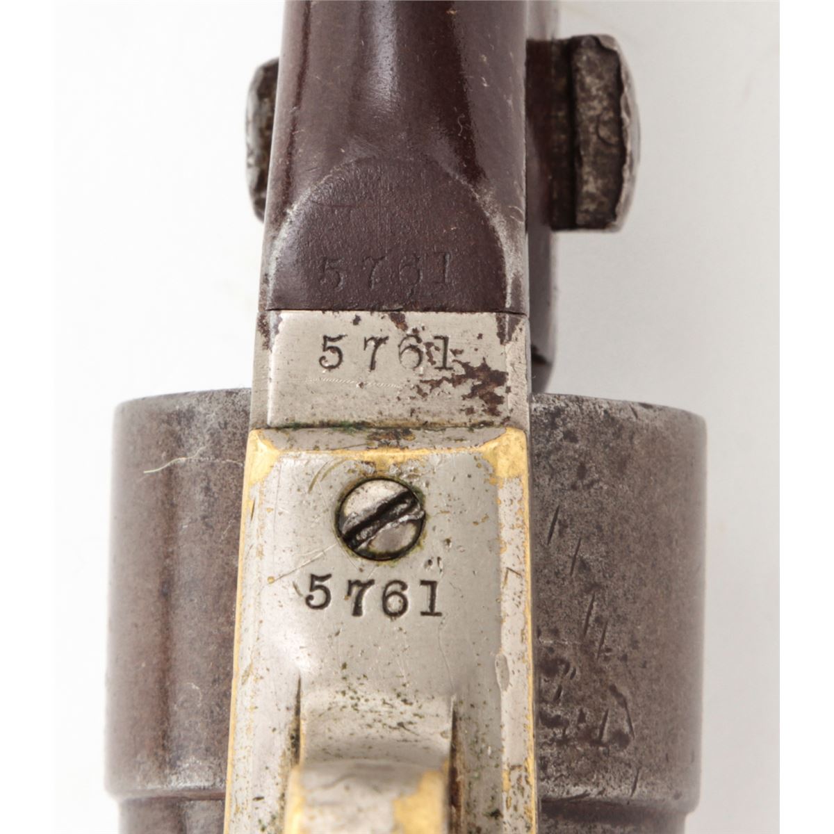 Colt Model 1860 Army Percussion Revolver, #5761, .44 cal., 8'' barrel, nickel finish, walnut grips, four-screw frame. Condition is about very good retaining approx. 40% nickel. Grips with no original varnish and light scuffs and scratches. Good functioning action, very good bore that should clean somewhat. All visible matching numbers including wedge. Est.: $600-$800. (Antique)